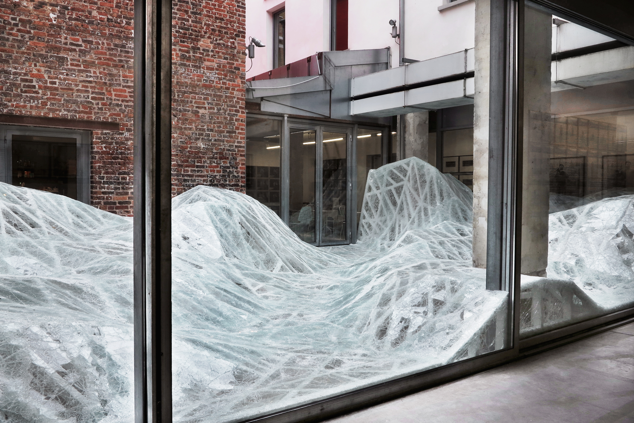 “Acceleration field” (2015), white laminated glass, wooden structure, screws, nails, paint, silicone3D, 11 x 7 x 1.8 meters, 250 meters2 glass at four tons. Installed at Fondation Antoine de Galbert in Paris, France, with technical assistance from Léa Marchalwith the support of Wellmade and Saint-Gobain