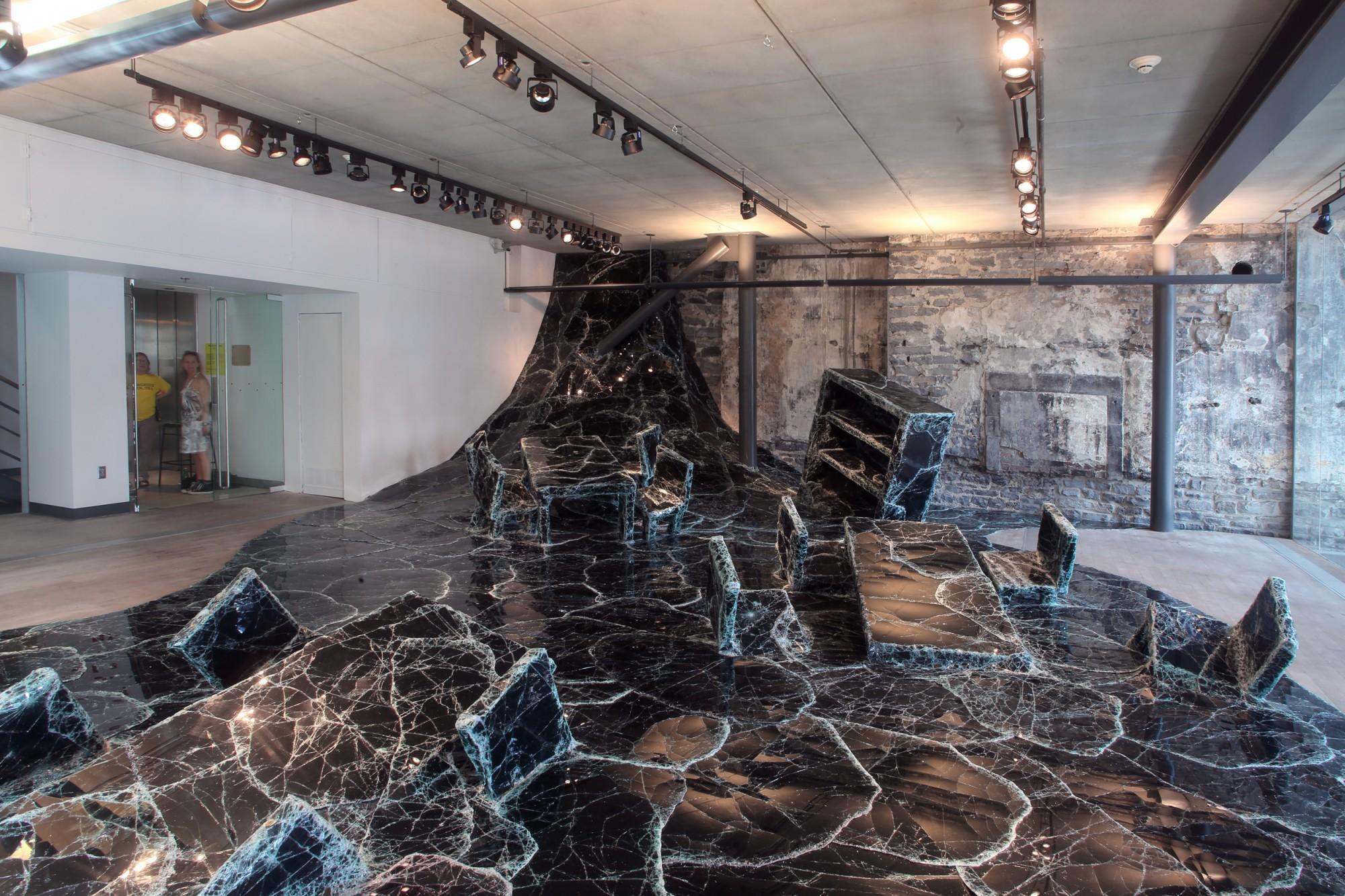 Debombourg’s most recent work, “Black tide,” combines black lacquer with broken glass, silicone, and other materials to flood a Quebec gallery. A powerful gush buries everything in its wake like a tidal wave, landslide, magma flow, or oil spill. Furniture is half-submerged and strewn throughout the deluge, referencing environmental disasters that humans both cause and experience.