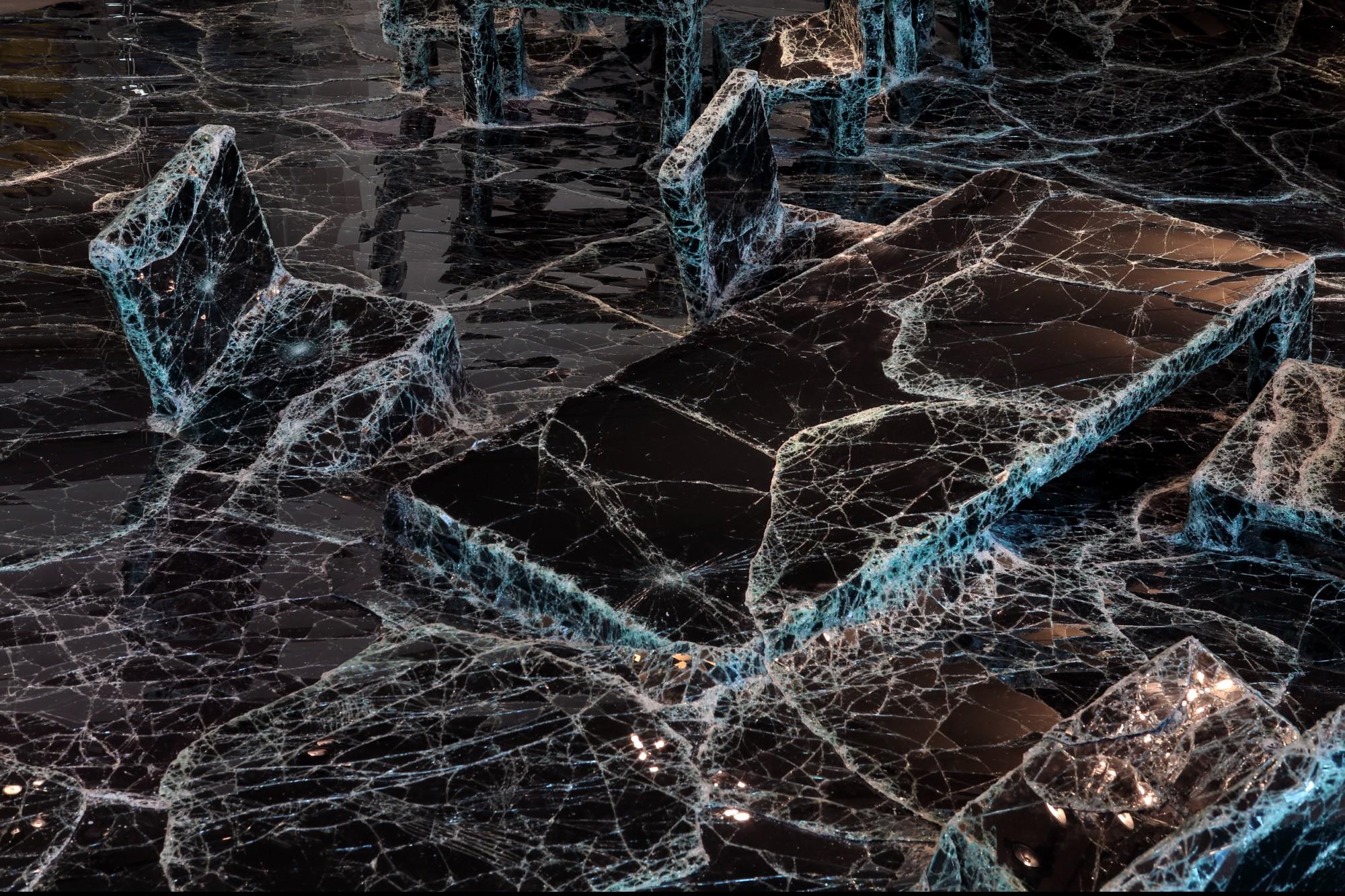 “Black tide” (2023), broken laminated glass from vitroplus , black lacquer, nails, wood, medium, silicone, and tape, 3.5 x 10 x 9 meters. Installed in Maison Hazeur for Passages Insolites in Quebec, Canada. All images © Baptiste Debombourg, shared with permission