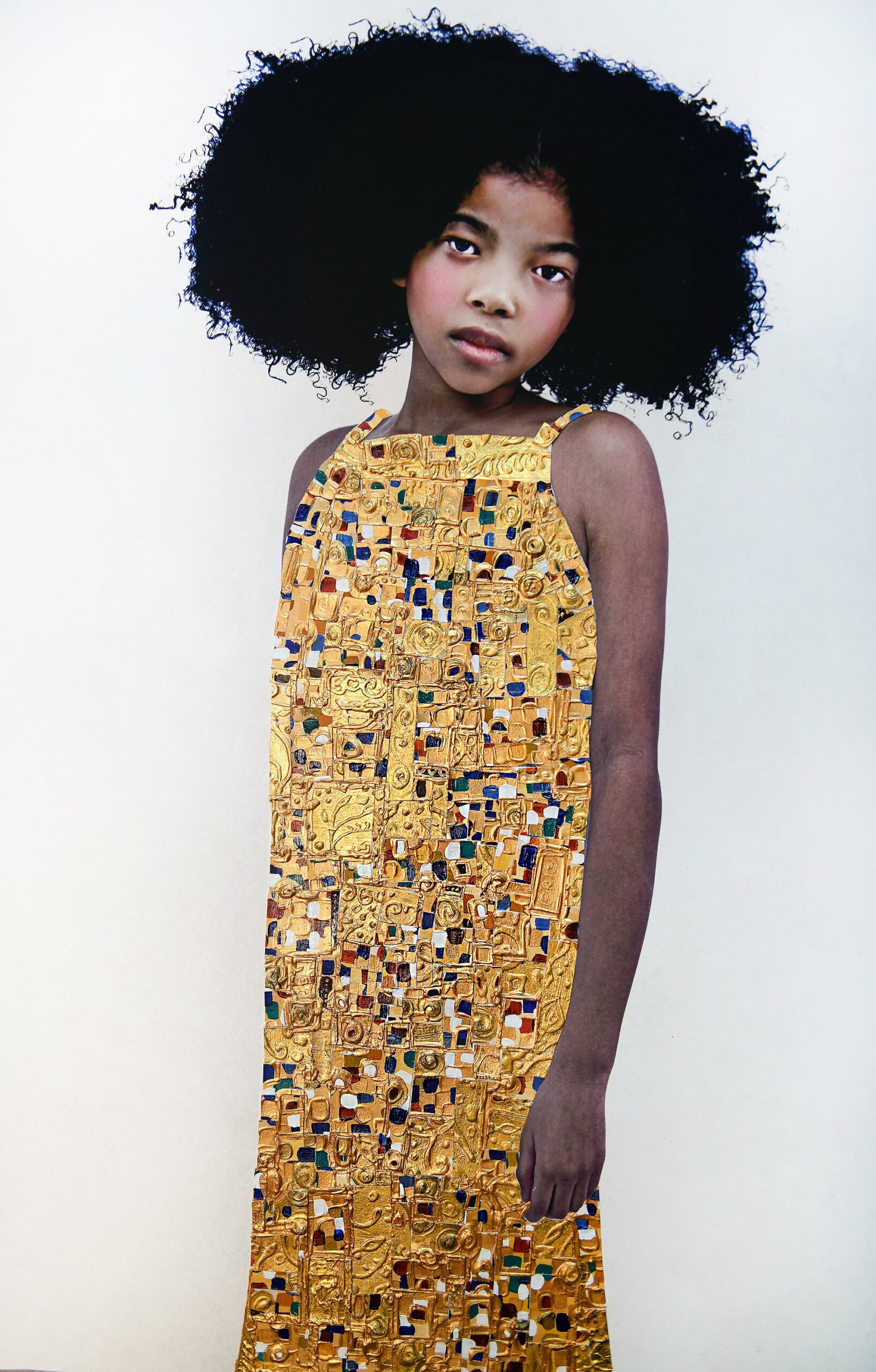 “Remnants/I Was Born to Stand in the Light” (2020-2022), 24k gold leaf, paper, acrylic, other mixed media on archival pigment print, 63 x 41 inches