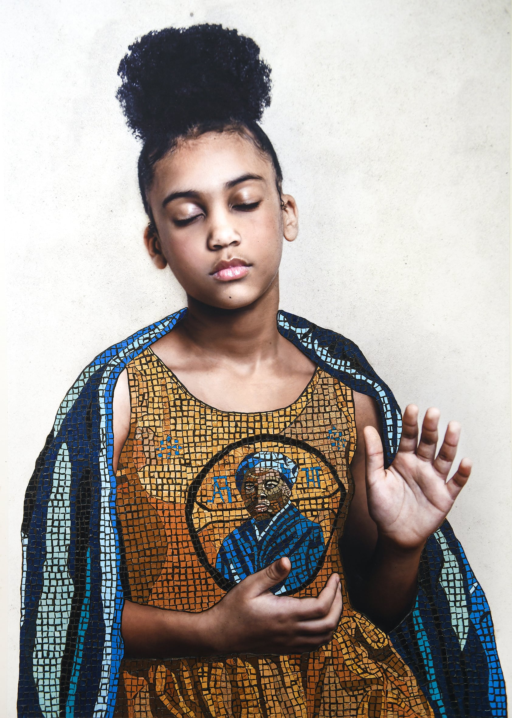 Chatmon takes a similar approach in her ongoing Iconography series, which evokes Byzantine-era works that depict religious figures through dense mosaics. “These visual declarations were used to assist the observer in focusing on all things sacred and were viewed more as literal prayers than art. Believed to serve as conduits to the divine, each was meticulously crafted by an iconographer embarking on a journey of prayer and meditation,” she shares.
