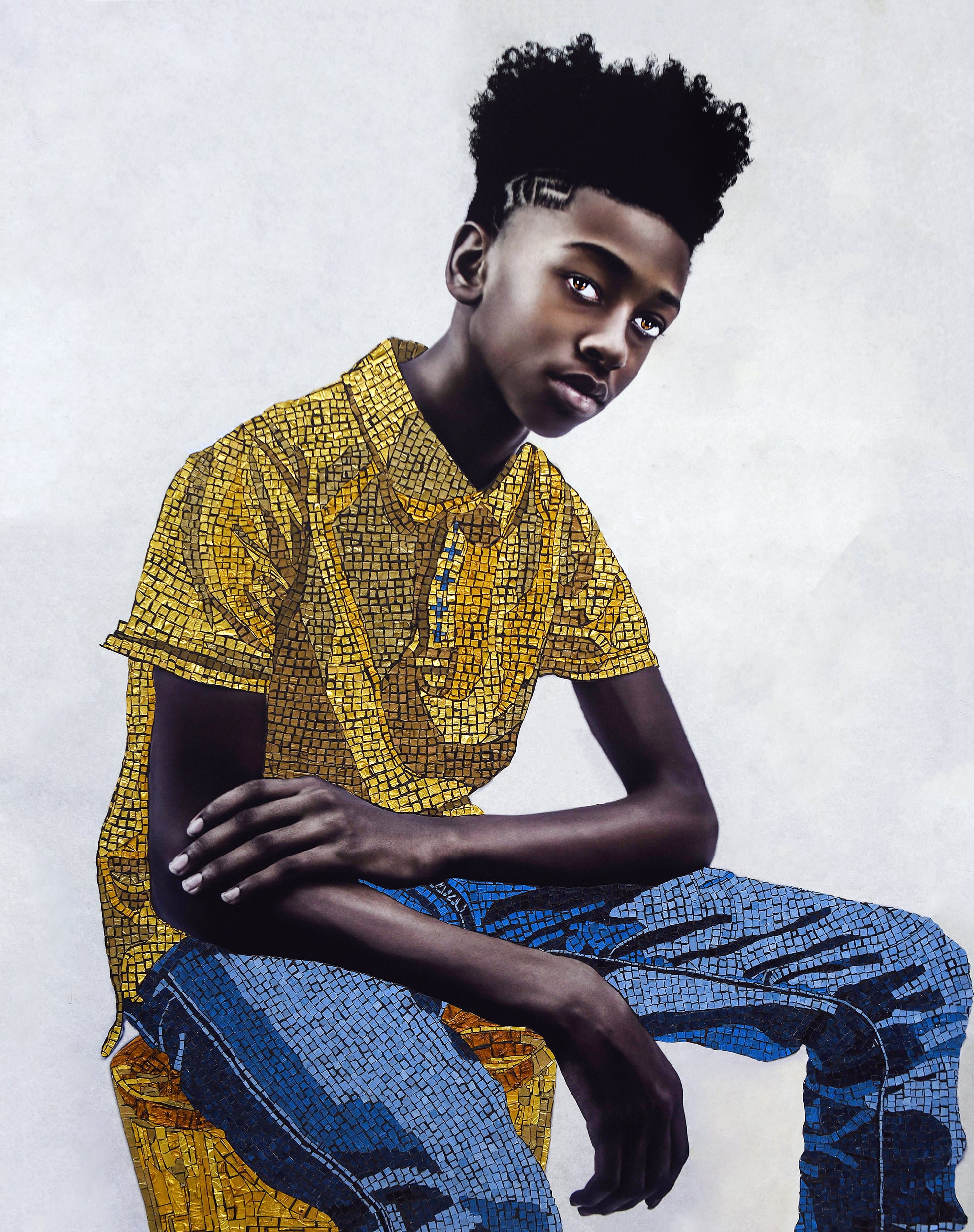 Often centering her portraiture on adolescents, Chatmon is visionary, imagining a time when children are “living in peace, being safe, being protected, being free of stereotypes, living freely and joyously, being treated gently by the world.” This dream is rooted in a long-held desire for young Black people to be recognized as inherently valuable and significant, visualized through the artist’s signature glimmering embellishments.