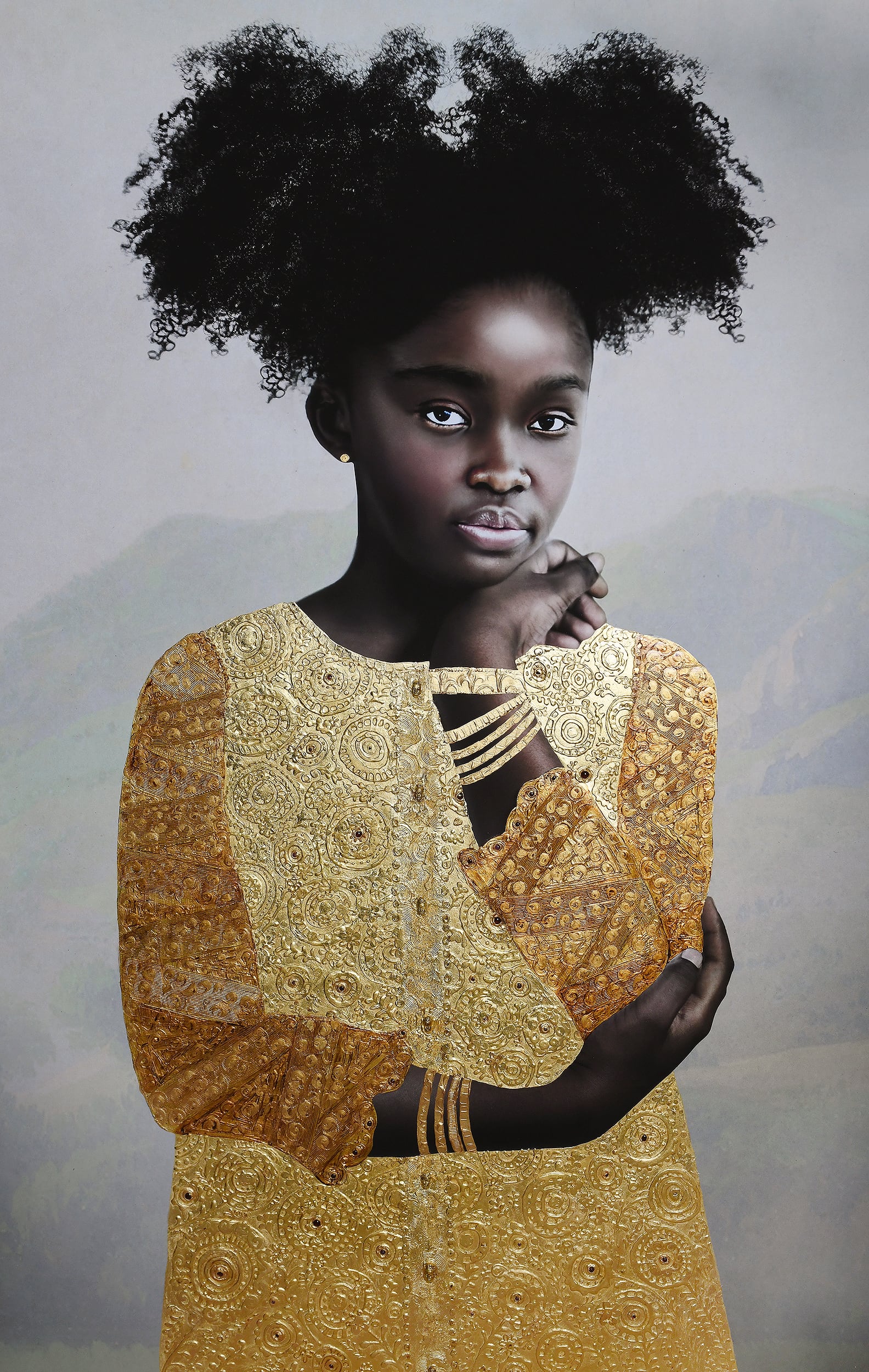 “Pastoral Scenes/Ralisha” (2021-2022), 24k gold leaf, acrylic, semi-precious stones, thermoplastic polymer resin, and other mixed media on archival pigment print, 56 x 36 inches