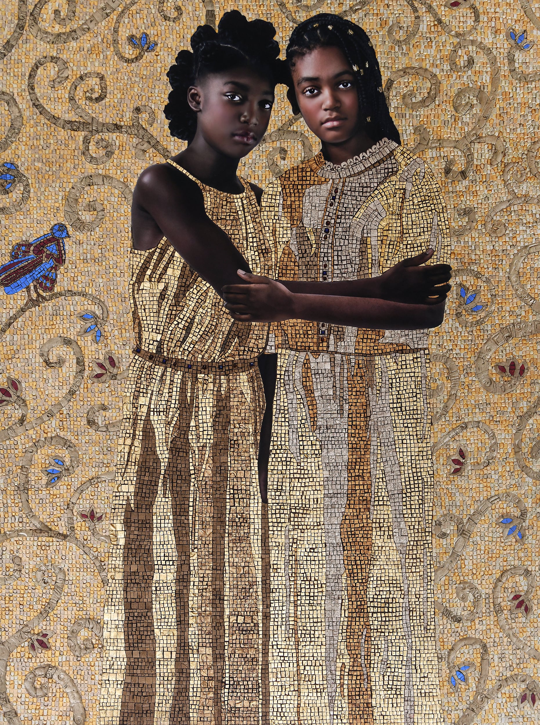 Her pieces draw on this tradition through swaths of gold tesserae that transcend the earthly. In “A Hopeful Truth,” Chatmon fashions flowing, metallic garments for two young girls, who embrace in front of a tiled backdrop with blue, floral filigree. Another work, “In honor of the sacred divinity that exists within us,” features the artist’s daughter wearing a robe draped over her shoulders and a gown with a portrait of Harriet Tubman near her heart. “Just as Byzantine icons serve as windows to the spiritual realm, may my icons serve as means of sending gratitude to our ancestors and a connection to those who helped shape our lives throughout history,” the artist says.