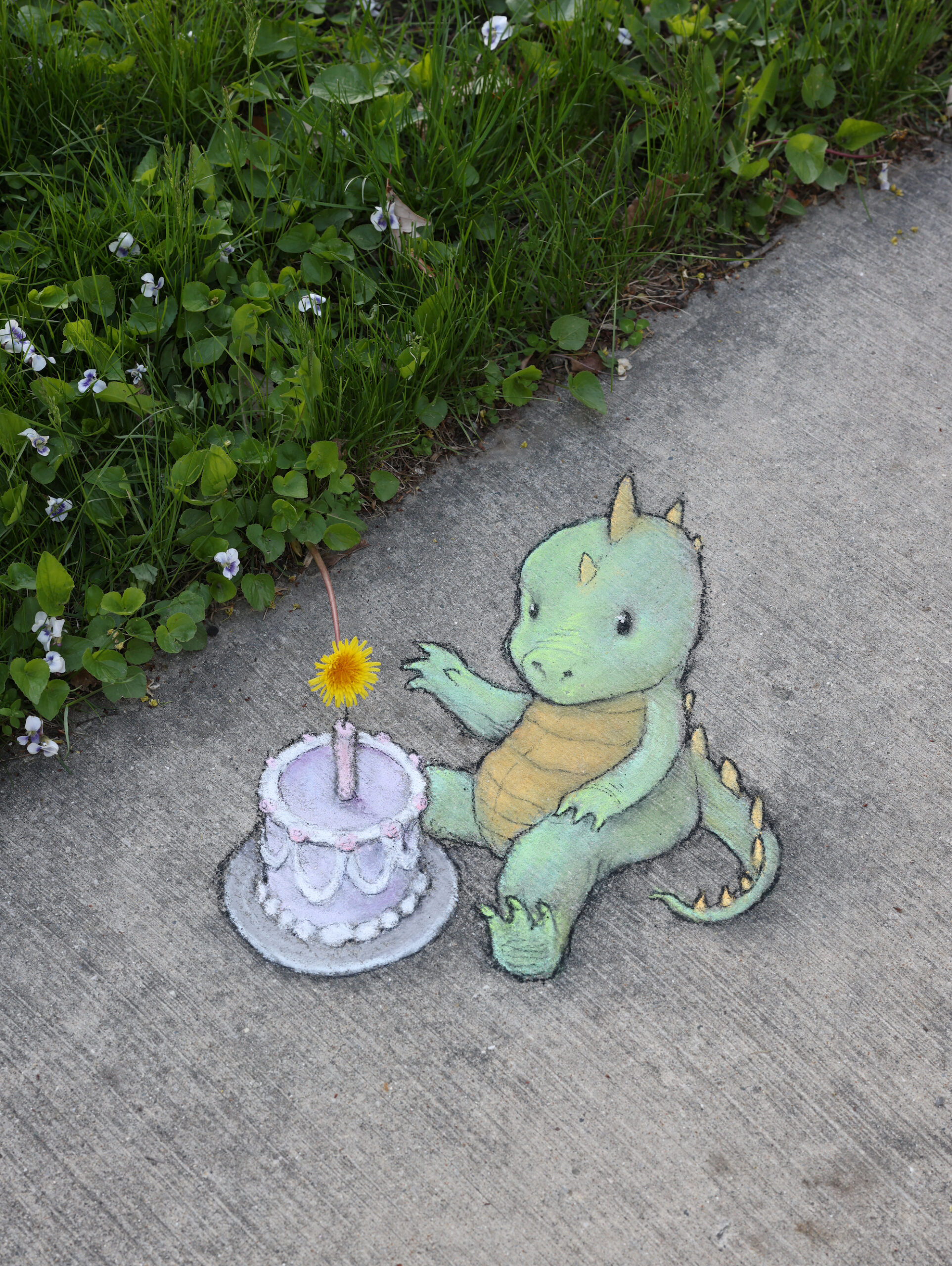 Since 1987, Ann Arbor-based artist David Zinn (previously) has gathered a diverse and humorous cast of characters on the sidewalks, streets, and walls of his hometown. In some of his newest works, a tiny tomfool alien explodes a load of asphalt with the push of a button, a dandelion lights the candle of a young dino’s cake, and an unenthused amphibian with “resting frogface” peers from a hole in some mortar.