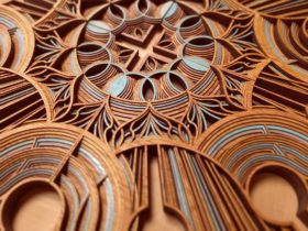Through a process of meticulous design, laser-cutting, and layering, Gabriel Schama creates incredibly detailed reliefs from thin plywood (previously). His work has focused on symmetrical, mandala-like forms with countless undulating patterns, and in recent years, he’s begun to explore more narrative themes, placing figures and objects into fantastical compositions. In new works, otherworldly birds careen in a flurry of feathers, a bottle of potion roils, and a hanging unit on a wall doubles as a holster for a sword.