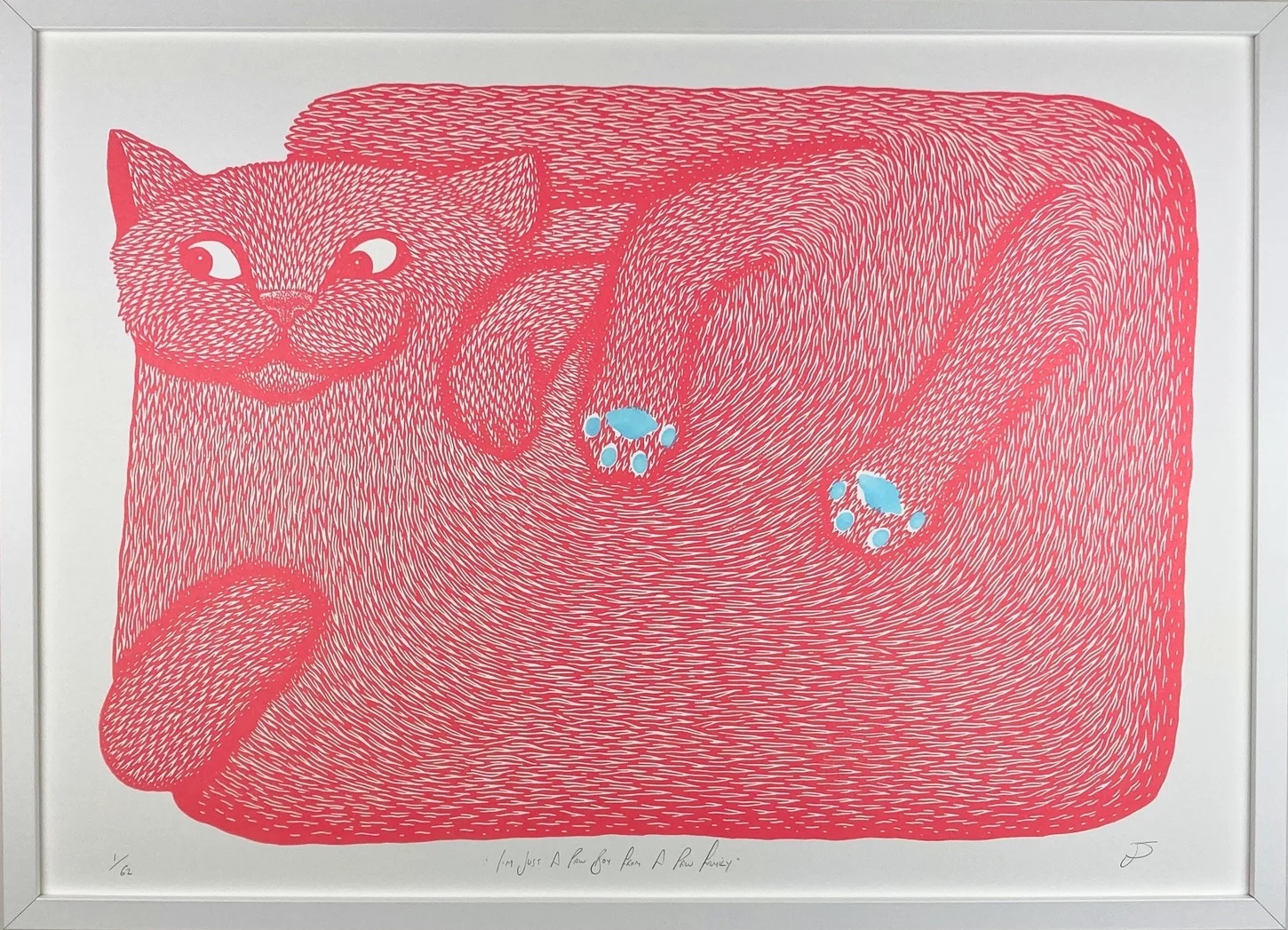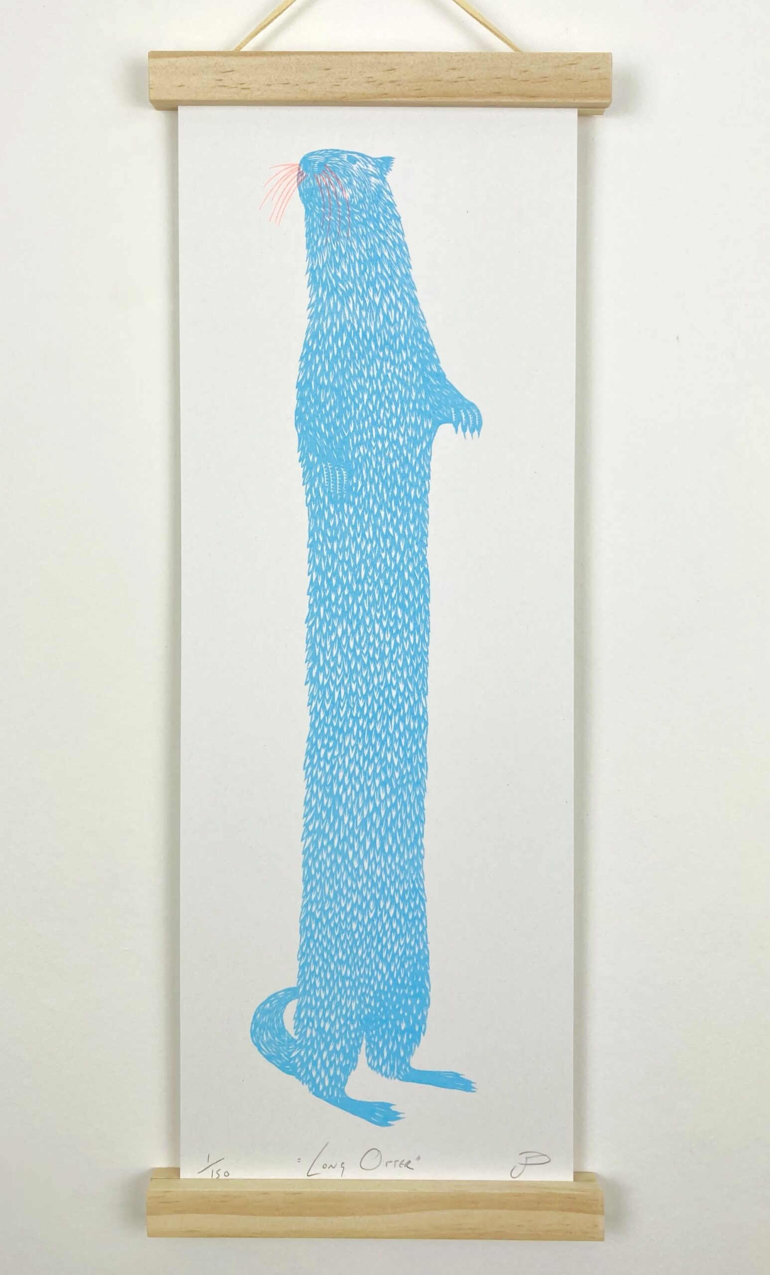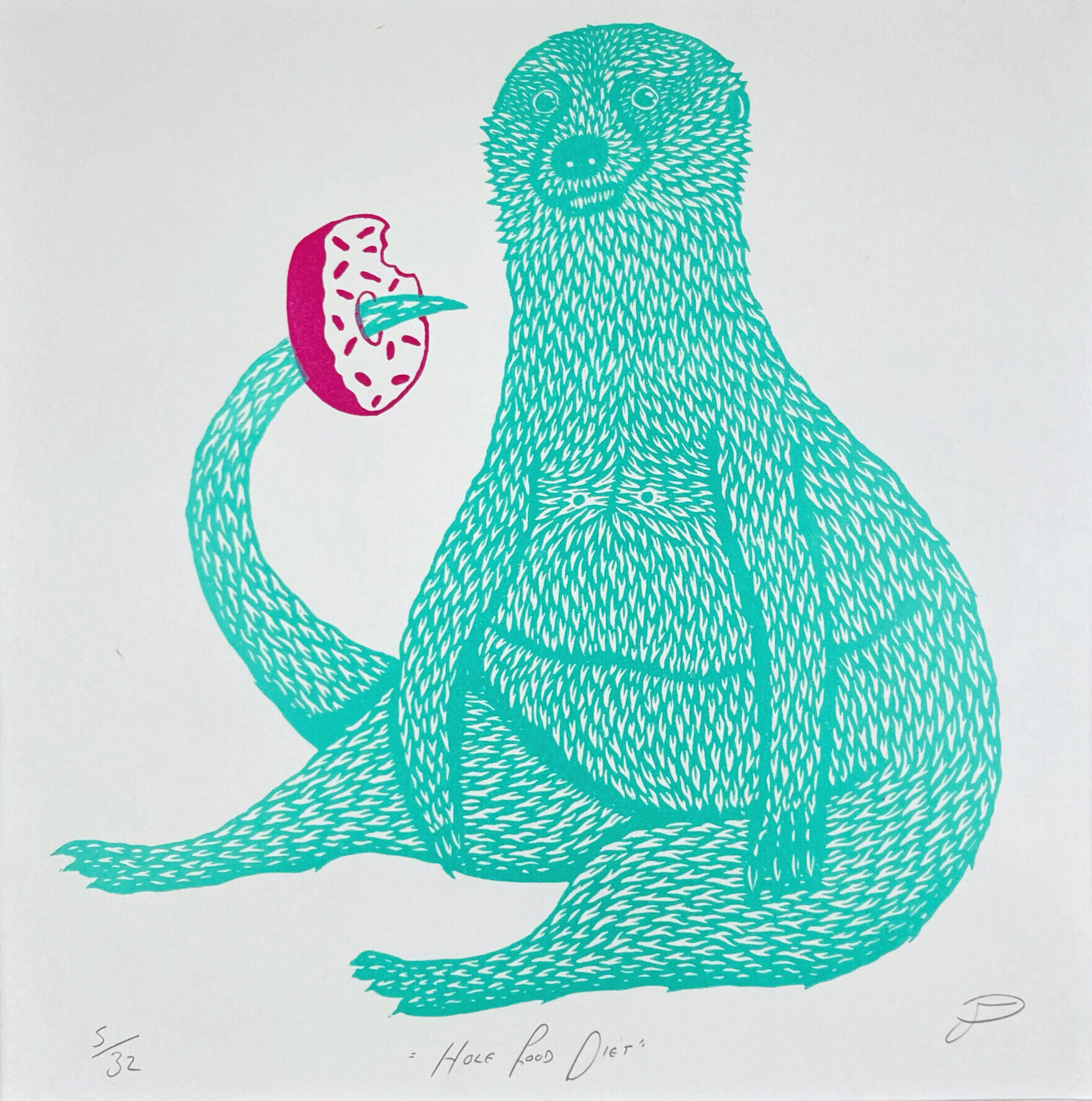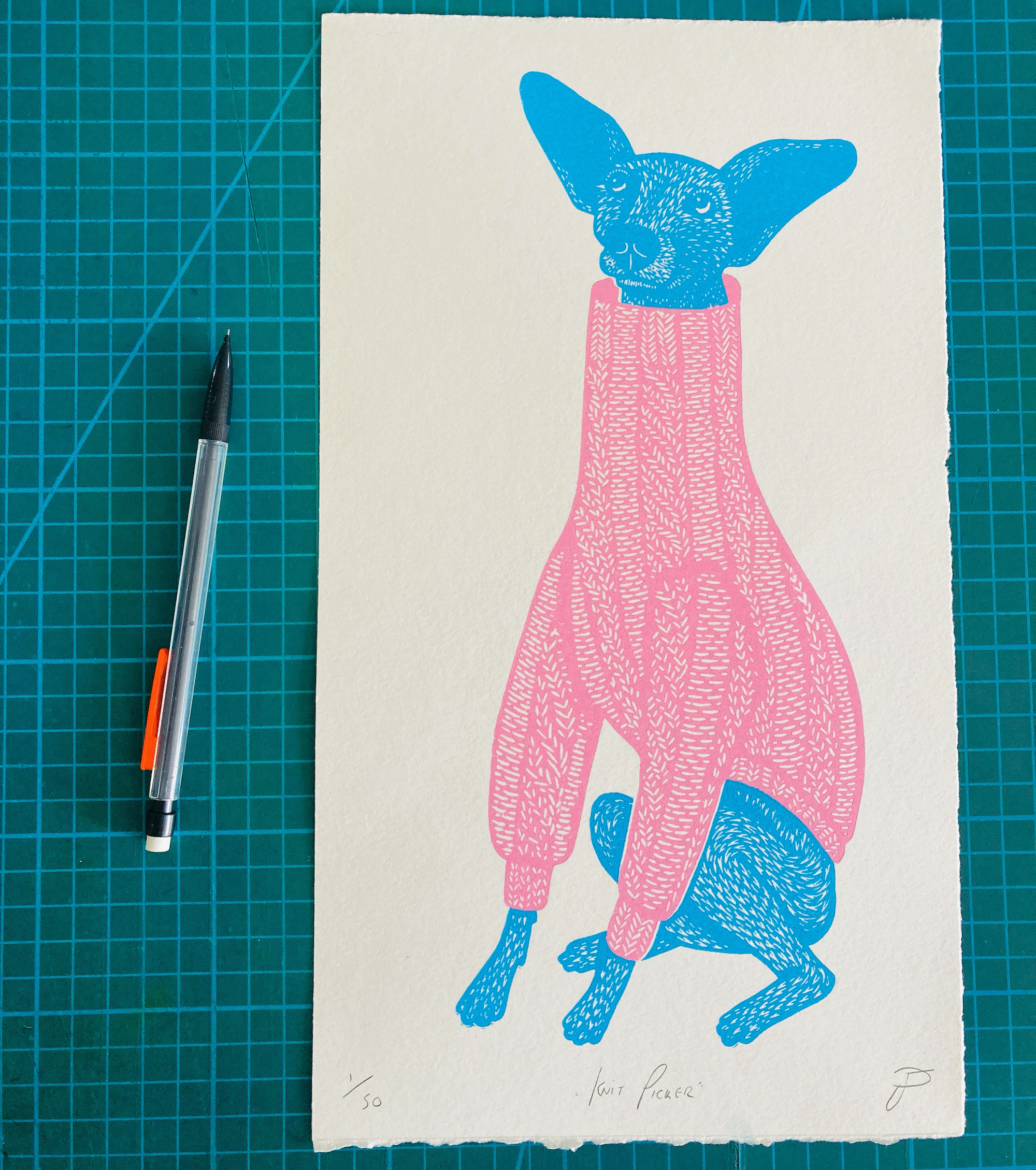 Animal hijinks and playful puns fill the colorful prints of County Down-based artist Jo, also known as Strangford. Whippets in knits, bagel-scarfing badgers, and roly-poly felines are just a few of the characters that emerge from lino-cuts and Risographs. “The main surface I’m carving into is flooring lino—it comes in bigger pieces than artist lino—and plywood, though I’m a beginner at wood carving,” she tells Colossal. “I work from home. I’ve basically taken over the whole house now.”