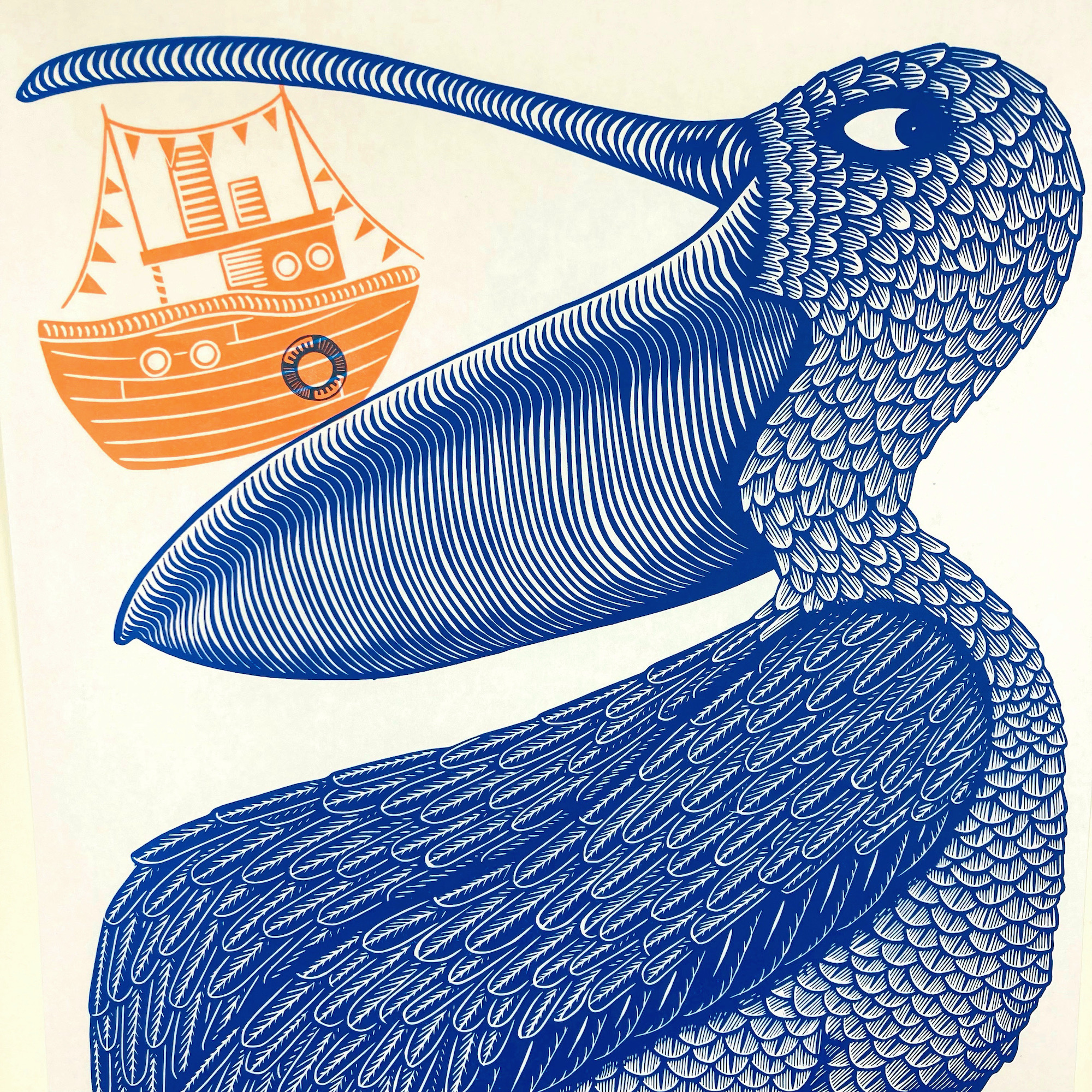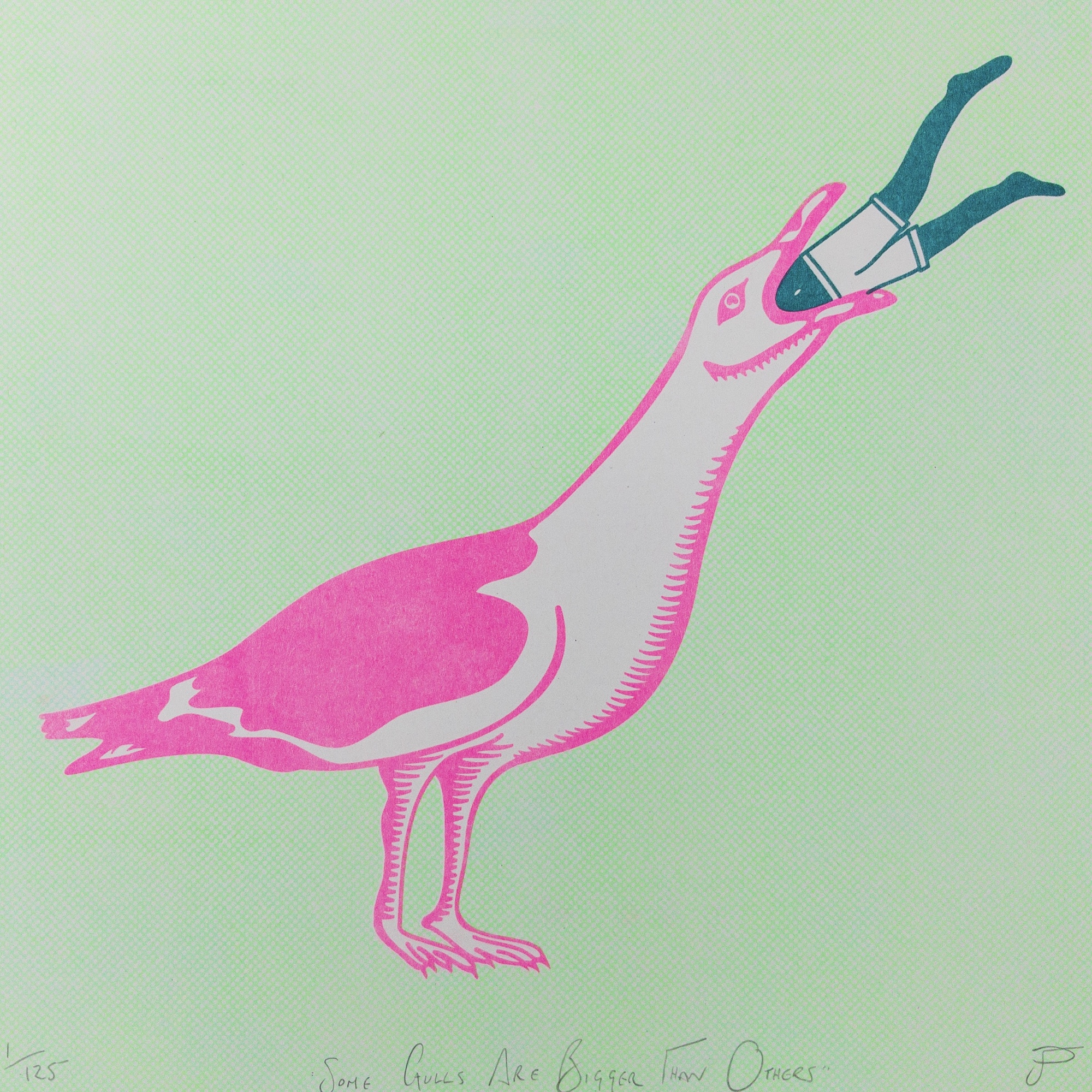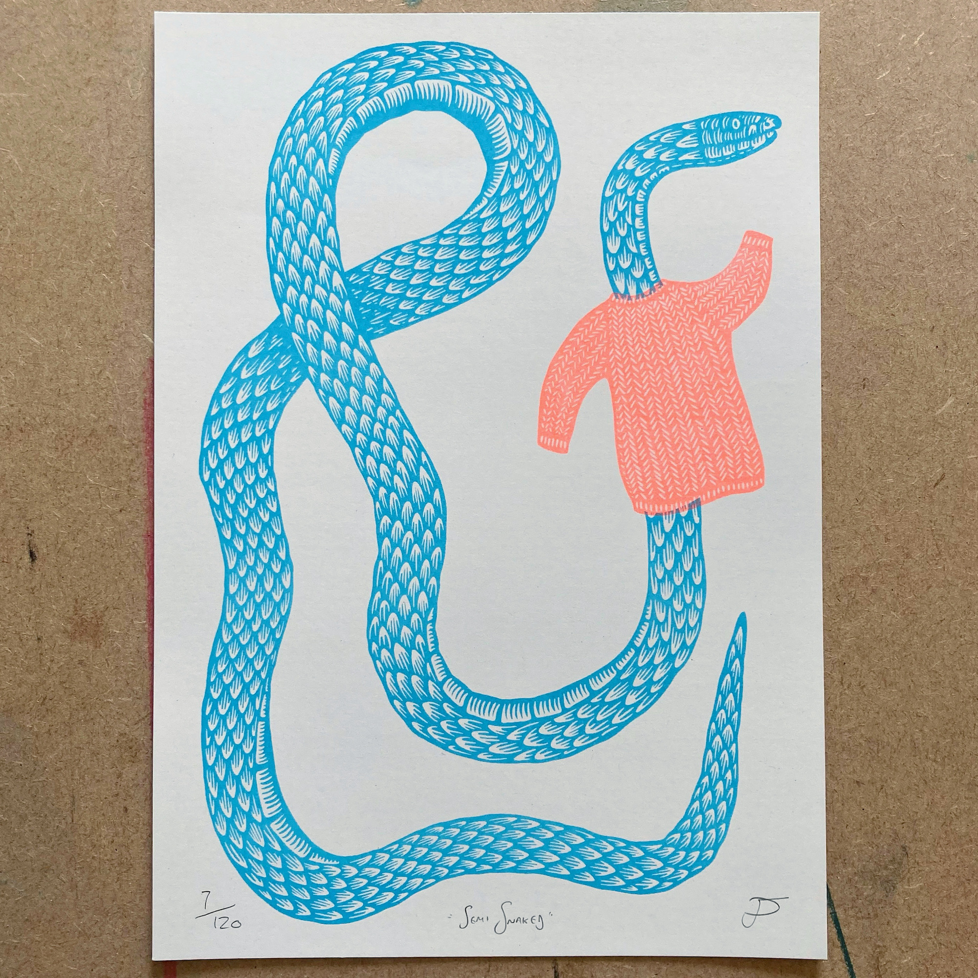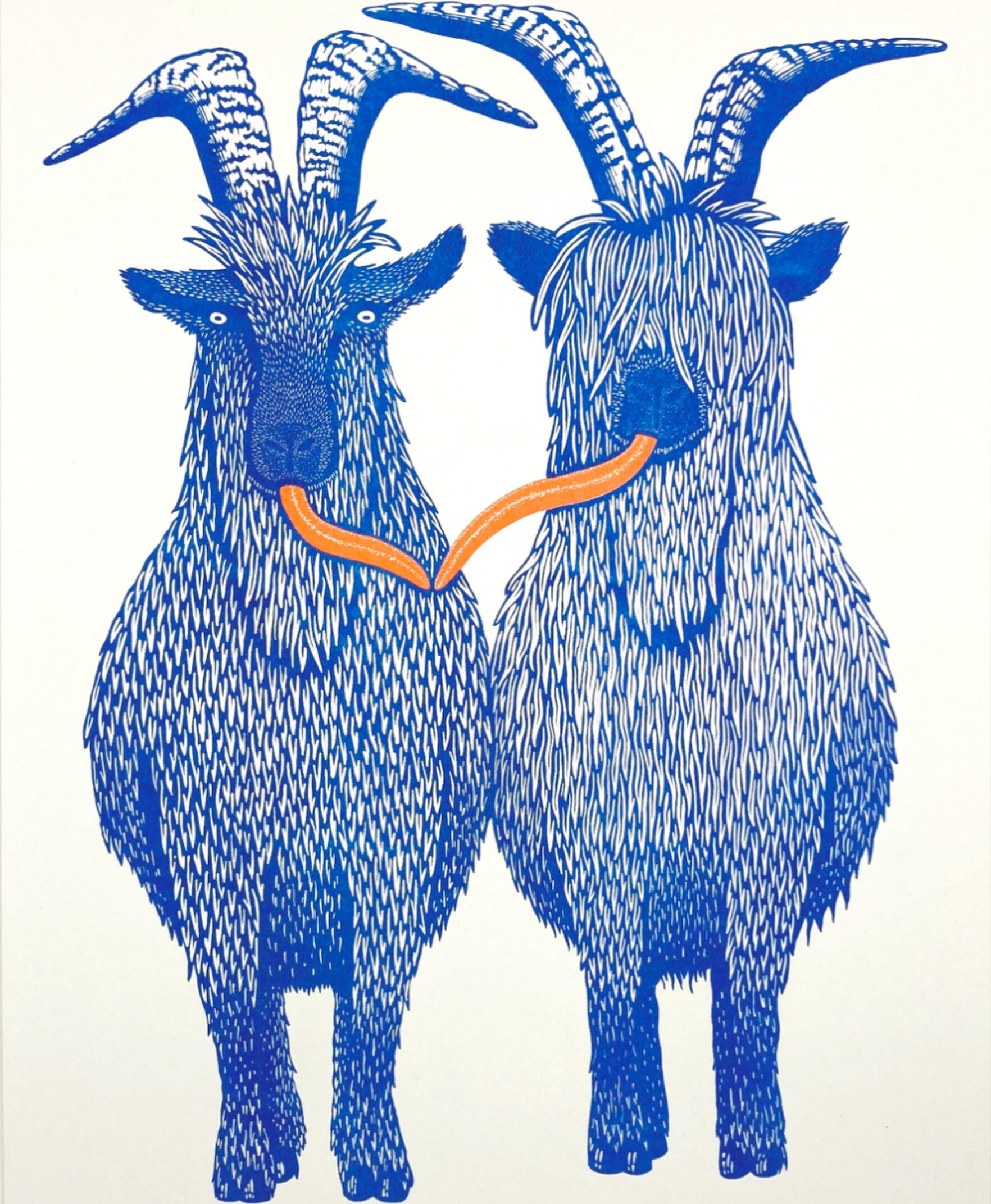 With a background in ecology, Strangford discovered printmaking when she joined local Extinction Rebellion groups, decentralized initiatives designed to persuade governments to act on the climate emergency. “I had previously done a bit of digital work but fell in love with the process of carving and printing,” she says. During the pandemic, her work took on a more humorous and light-hearted quality. “When the world got more serious, my work became more playful.”