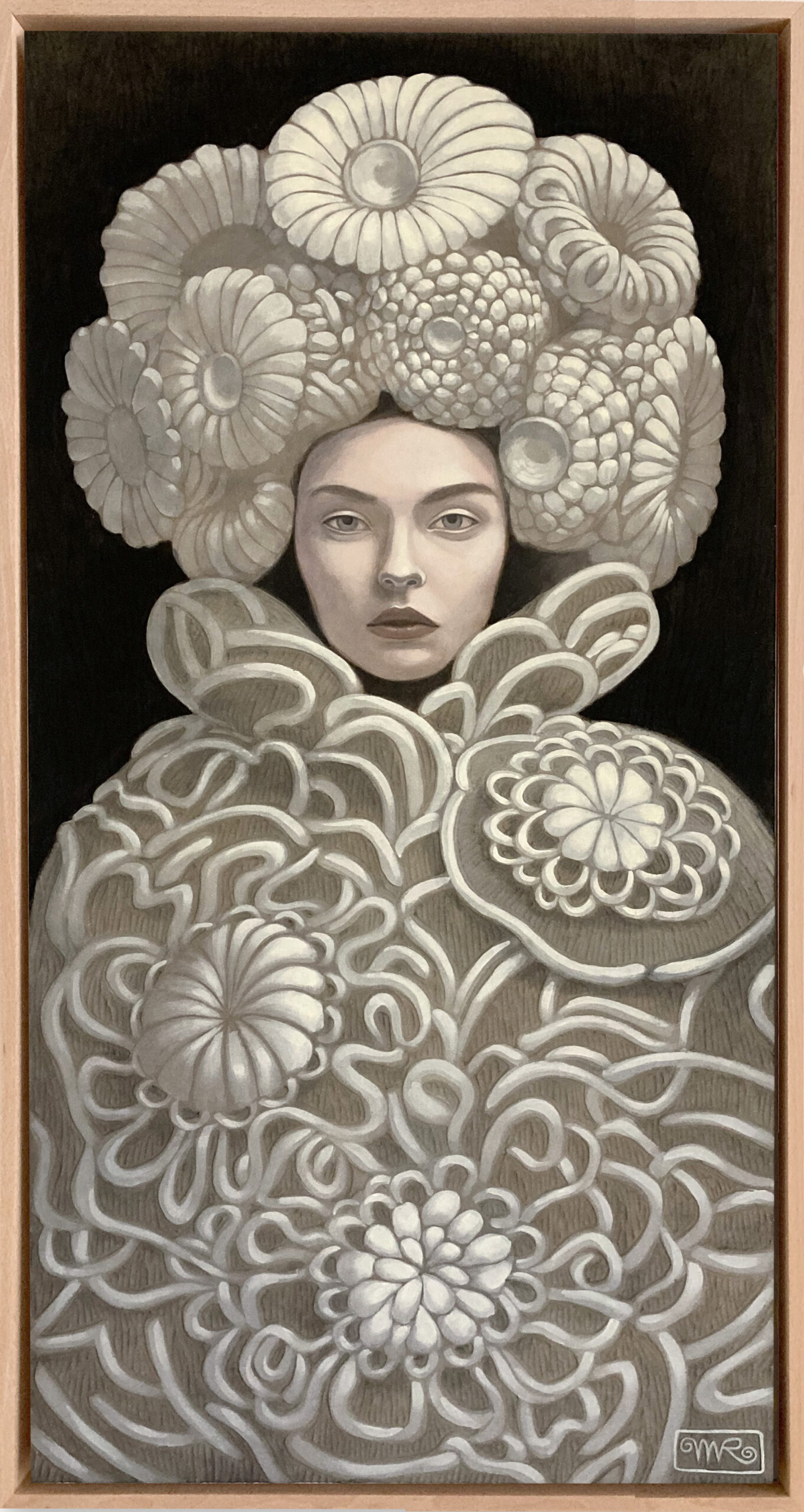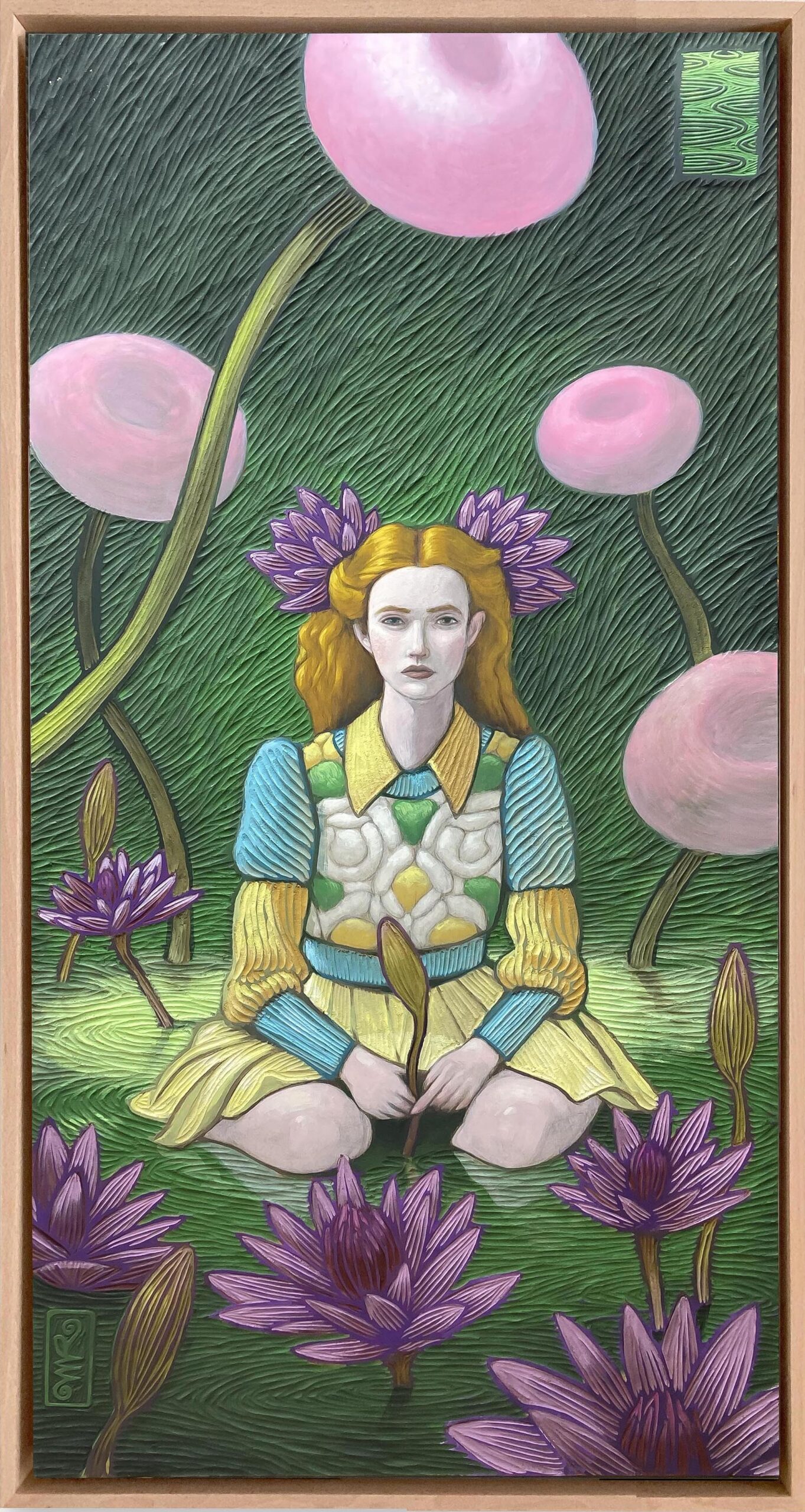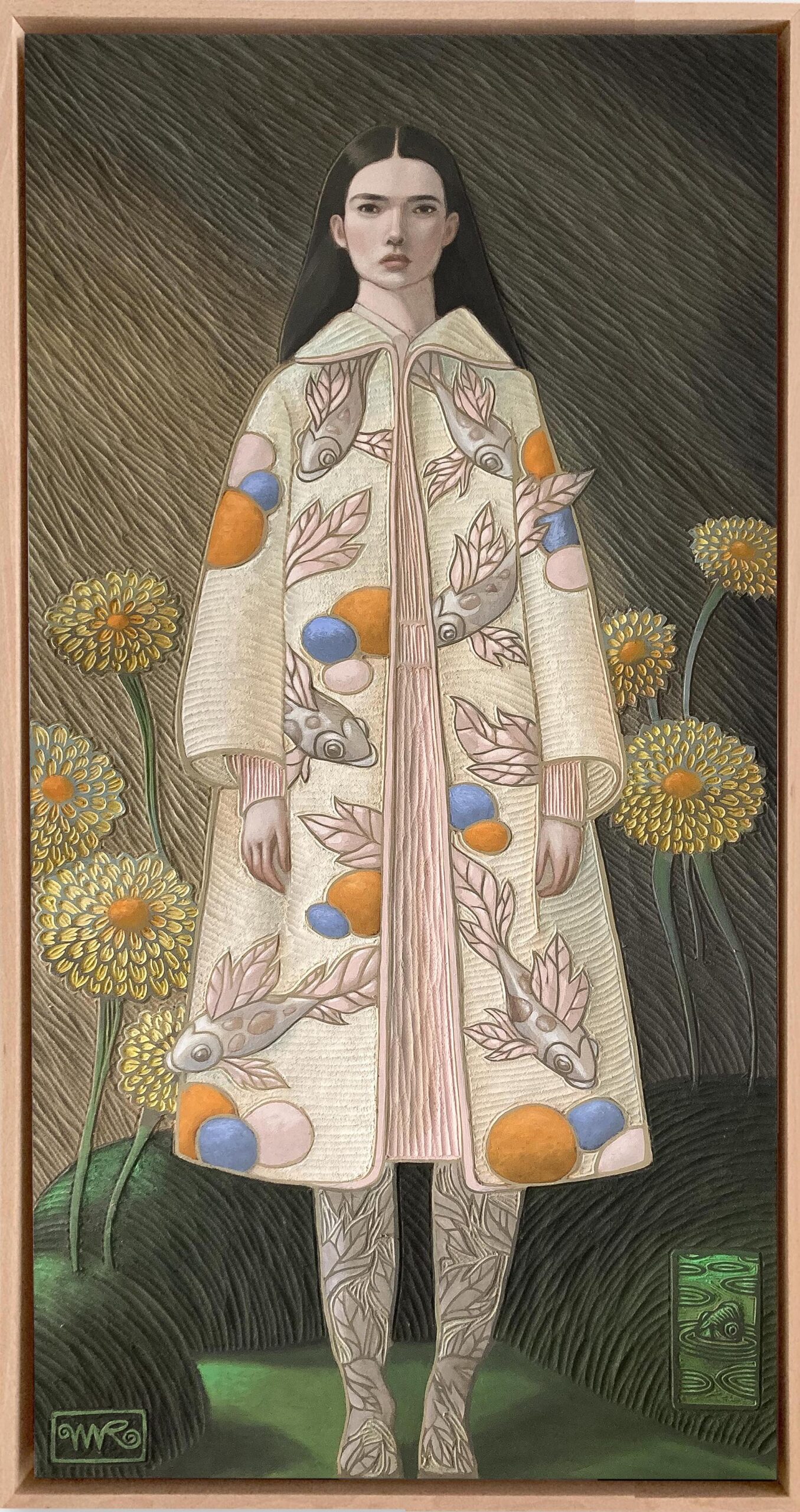 As Roussel carves each piece, the gouges reveal a tantalizing texture. In his new works, the faces of his subjects remain smooth and rely entirely on painting to bring them to life, while the grooves are reserved for enormous flowers, ornate garments, and dreamy surroundings. “I wanted to put myself to the test of painting,” he tells Colossal. “I’m quickly bored when I make same things.”