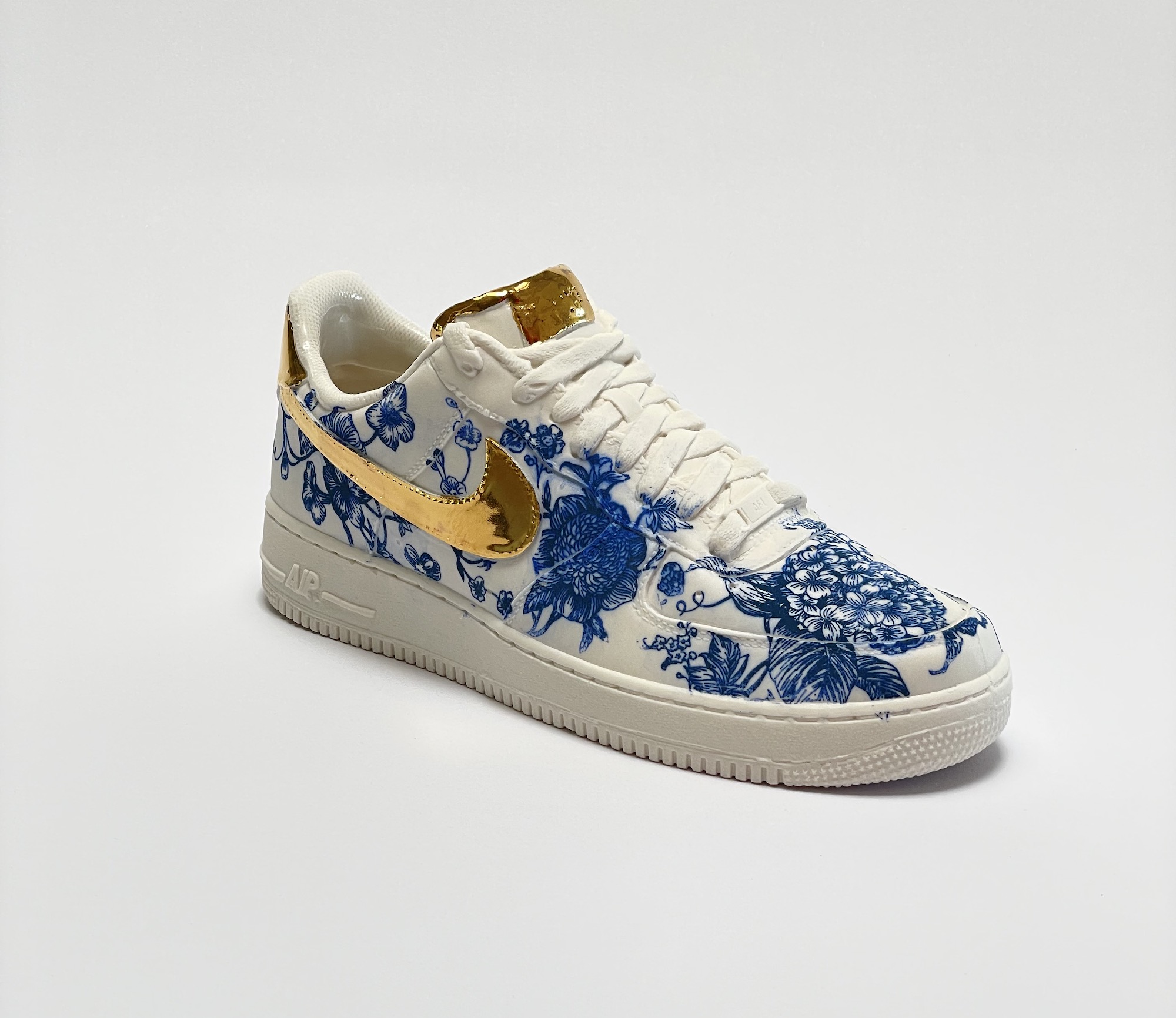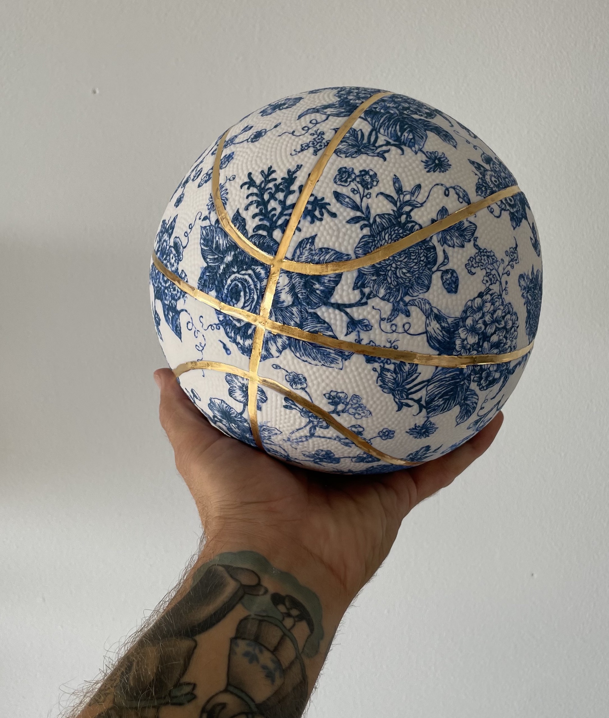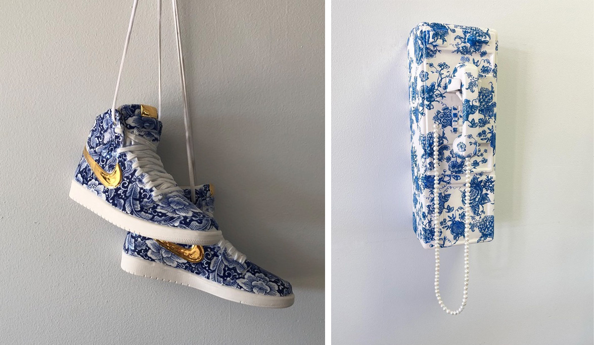 Each piece’s decor harkens back to popular traditions in pottery like blue-and-white Chinese porcelain, which emerged in the 14th century and was wildly popular in Europe, spurring subsequent styles like Royal Delft. “Adding this surface decoration also folds a layer of history into the sculptures, which I think is even more impactful when on these common objects,” he says.