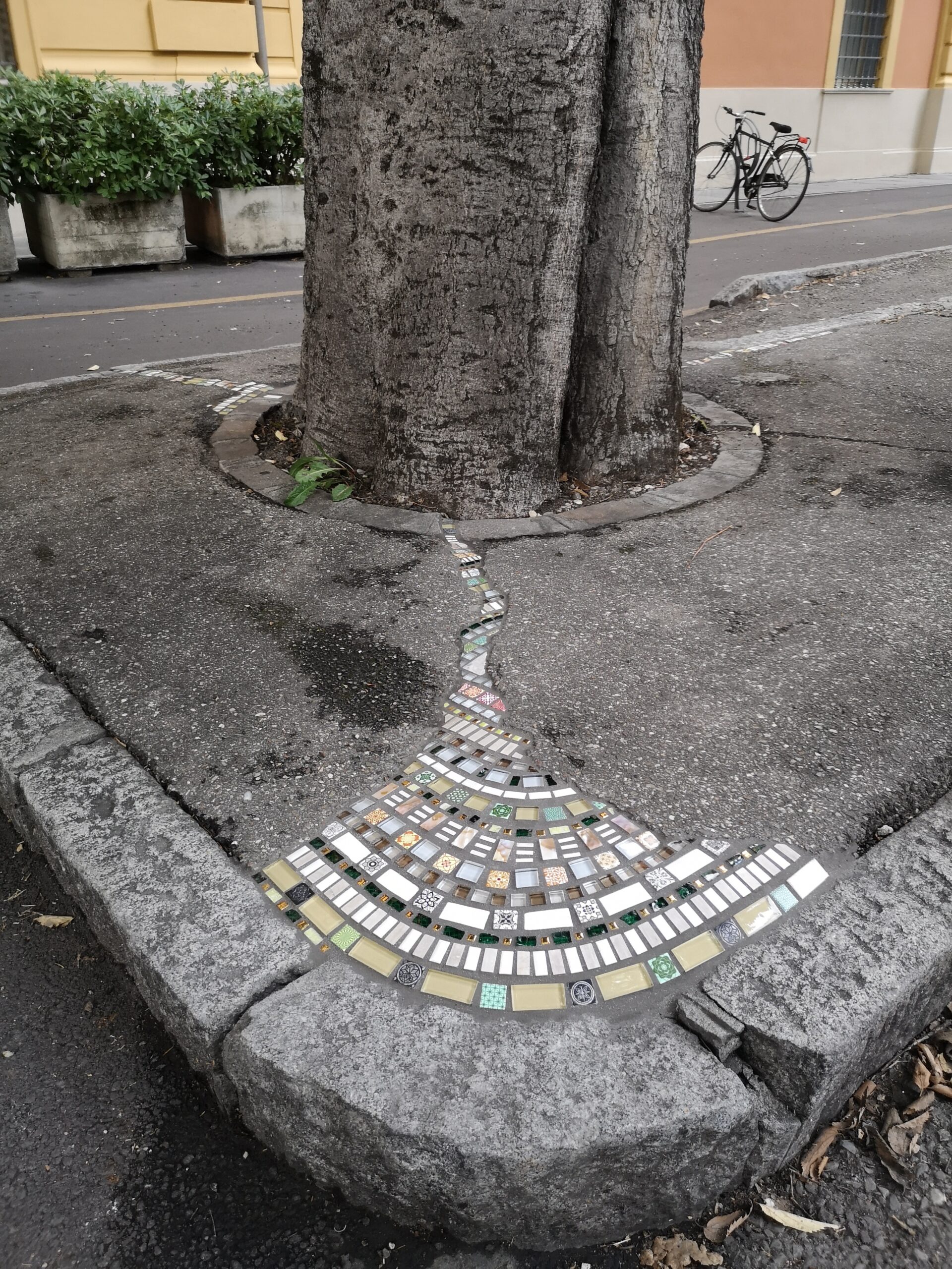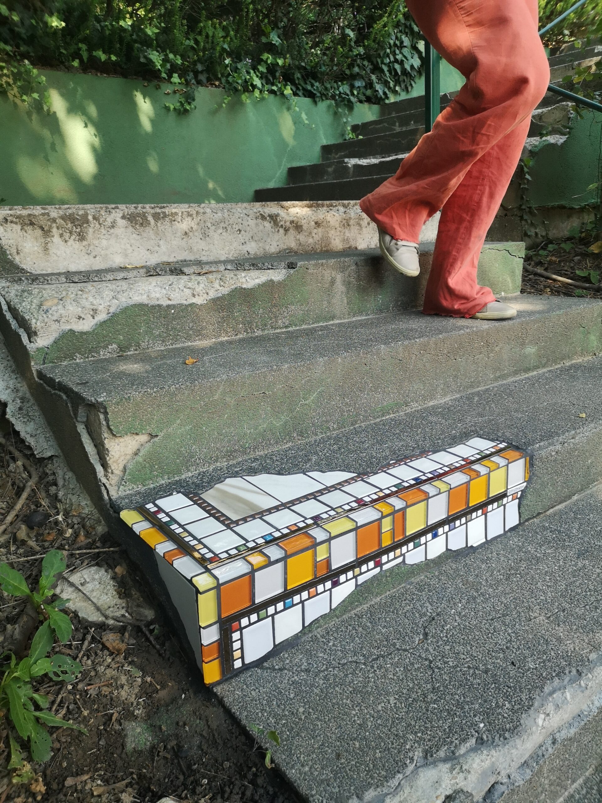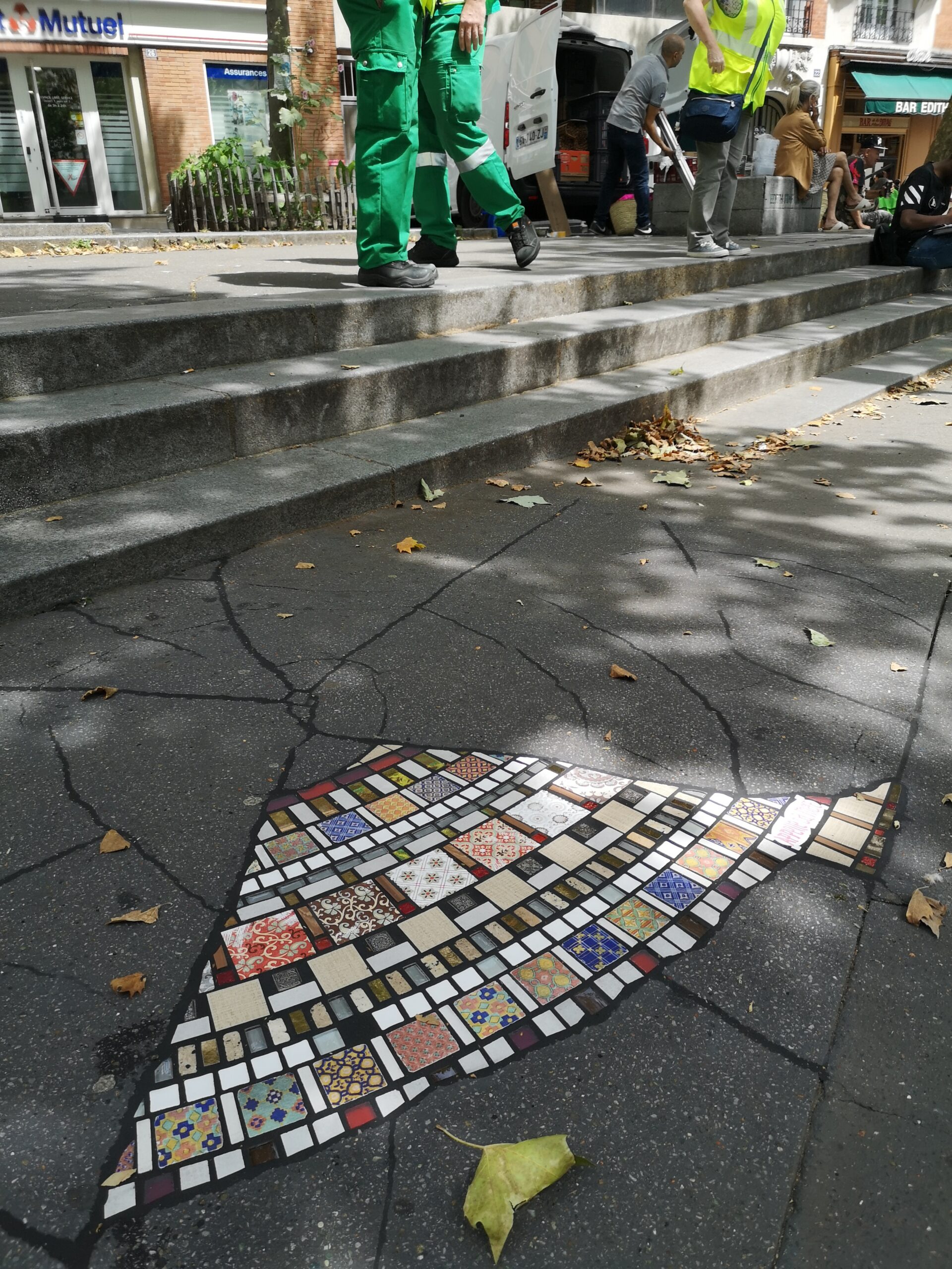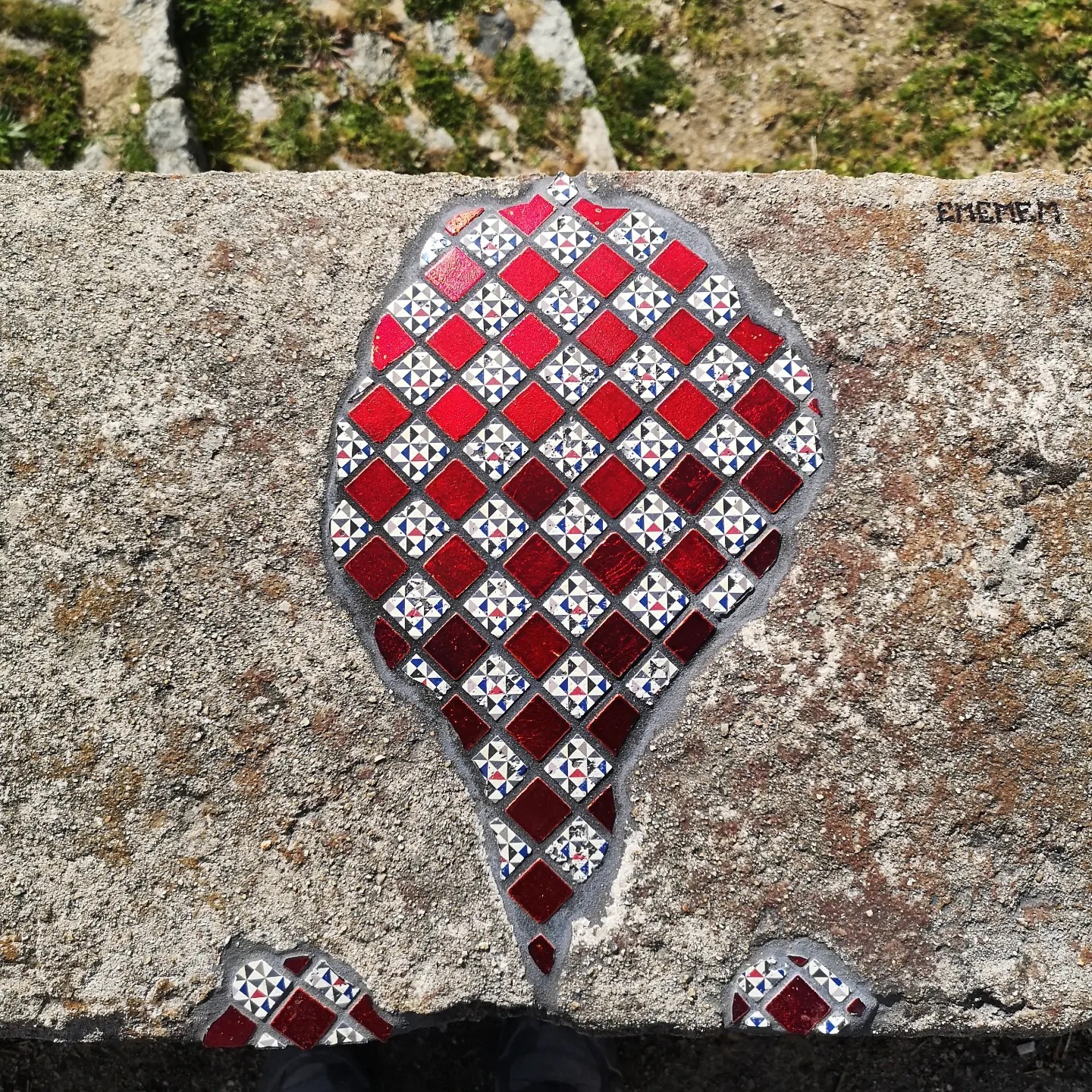 No crack in a wall, step, or curb is safe from Ememem’s delightful interventions. The Lyon-based artist (previously), also known as “the pavement surgeon,” continues to scout out gaps in sidewalks that he fills with colorful tiles. Akin to kintsugi, the Japanese practice of repairing broken pottery with gold to embrace the history of the object, Ememem’s technique doesn’t hide imperfections so much as highlight their possibilities. While making the surfaces safer to traverse, he adds gives new life to decaying urban walkways.