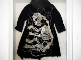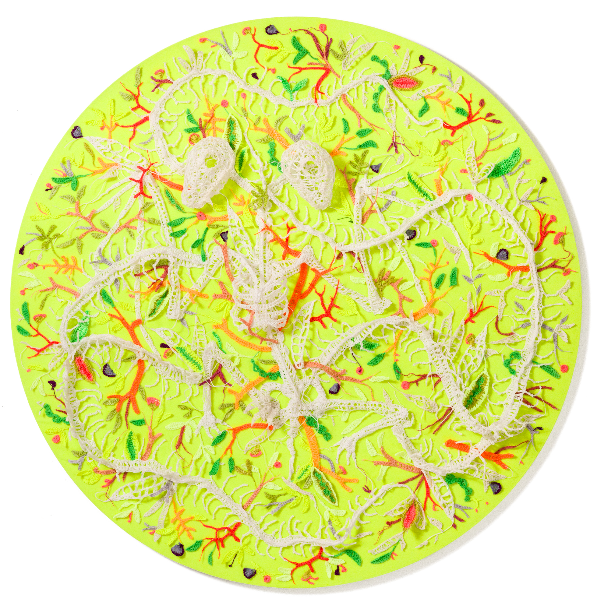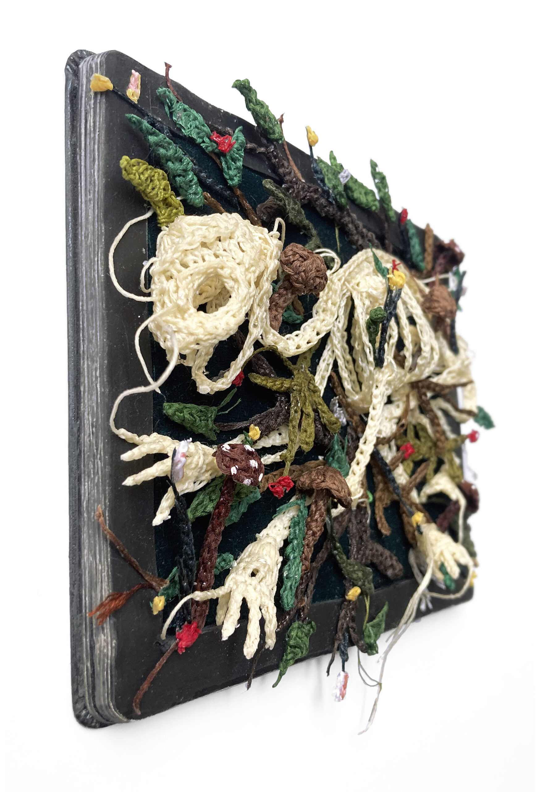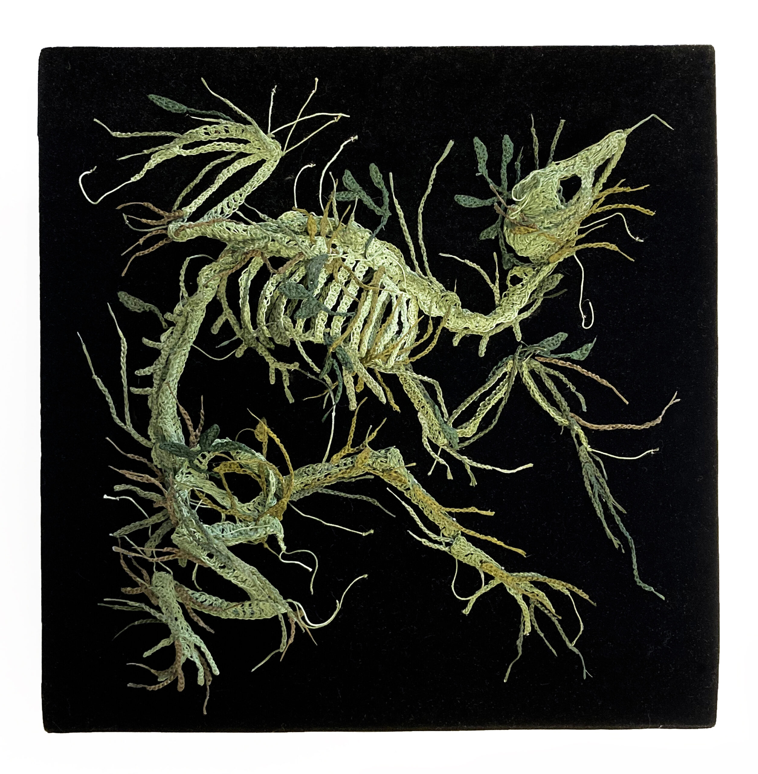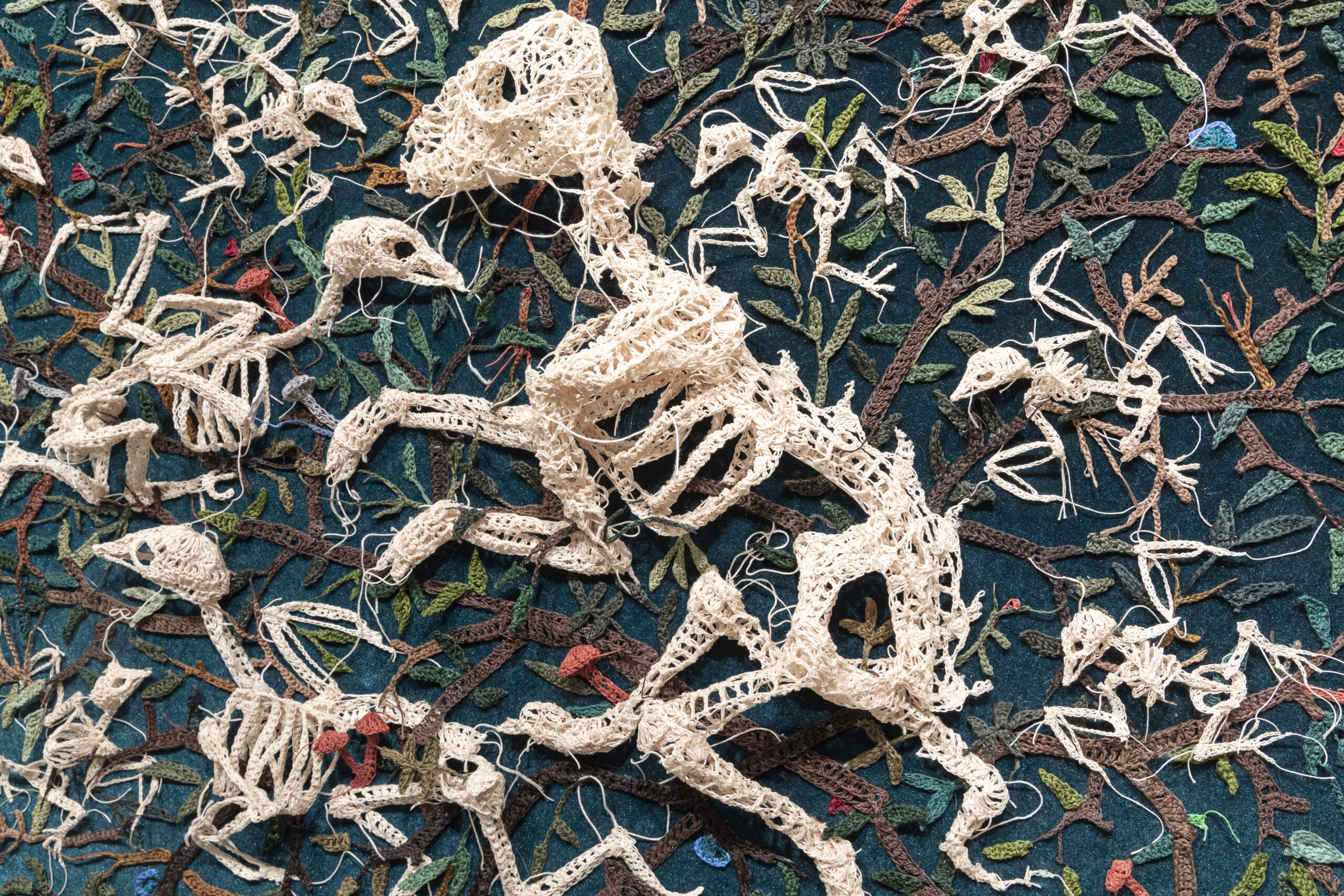 From humble, crocheted thread emerges Caitlin McCormack’s alternate reality featuring tiny carcasses, encased objects, and mysterious figures. Ideas related to the cycle of death and life, mutation, and overgrowth permeate her work, most prominently through her ongoing series of skeletons (previously) resting on beds of botanicals, often arranged in groups as if a single event wiped them out simultaneously.