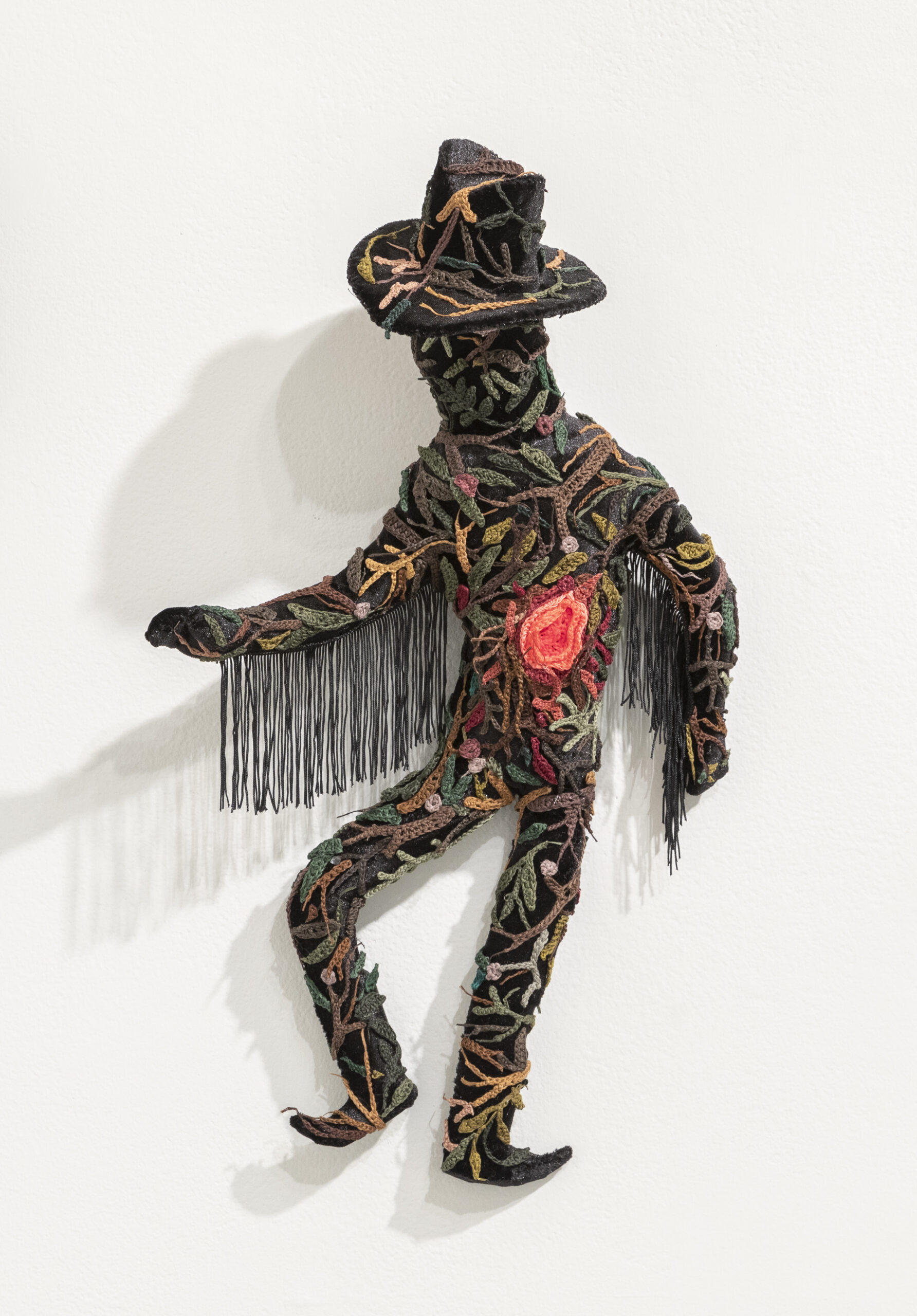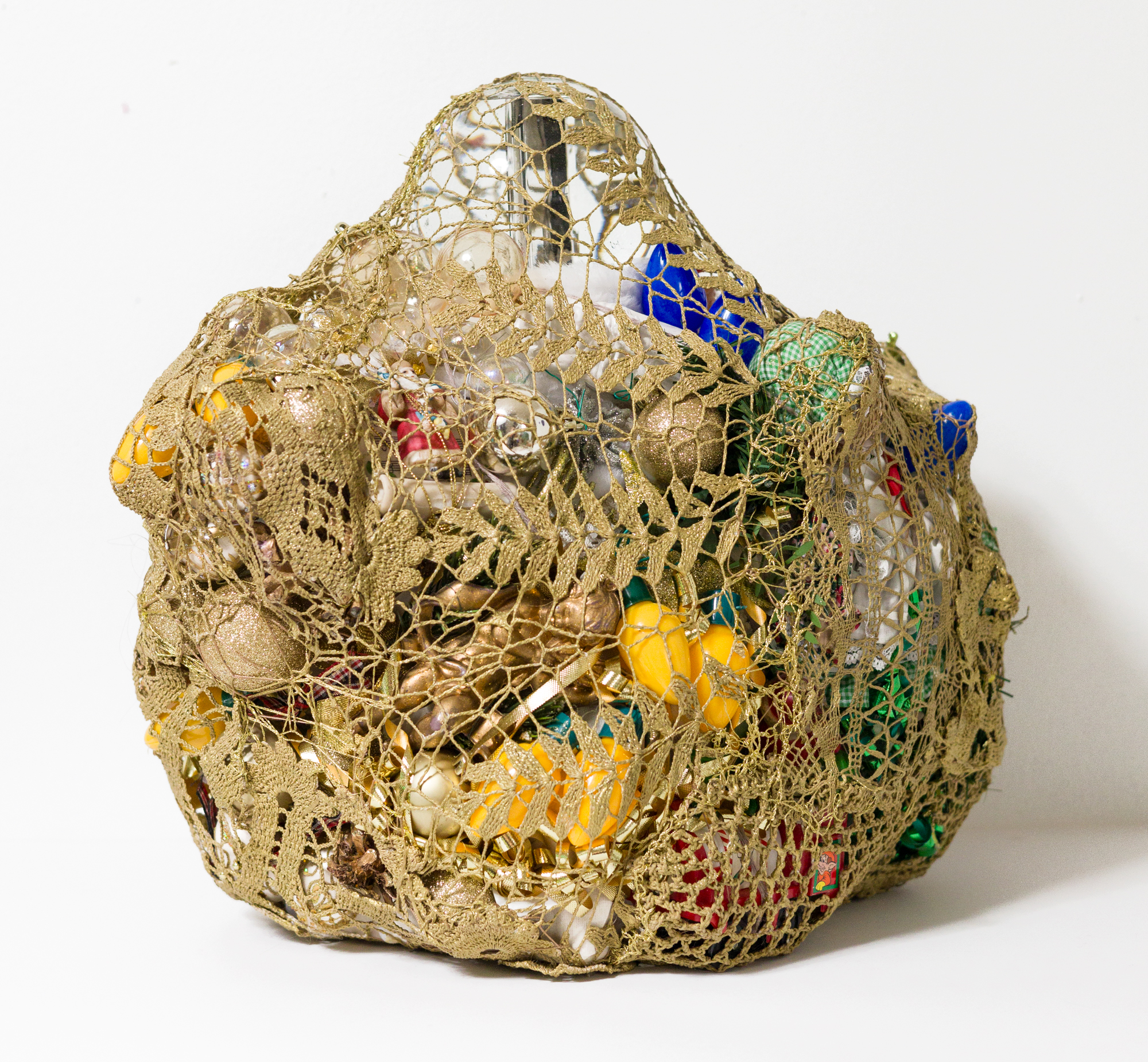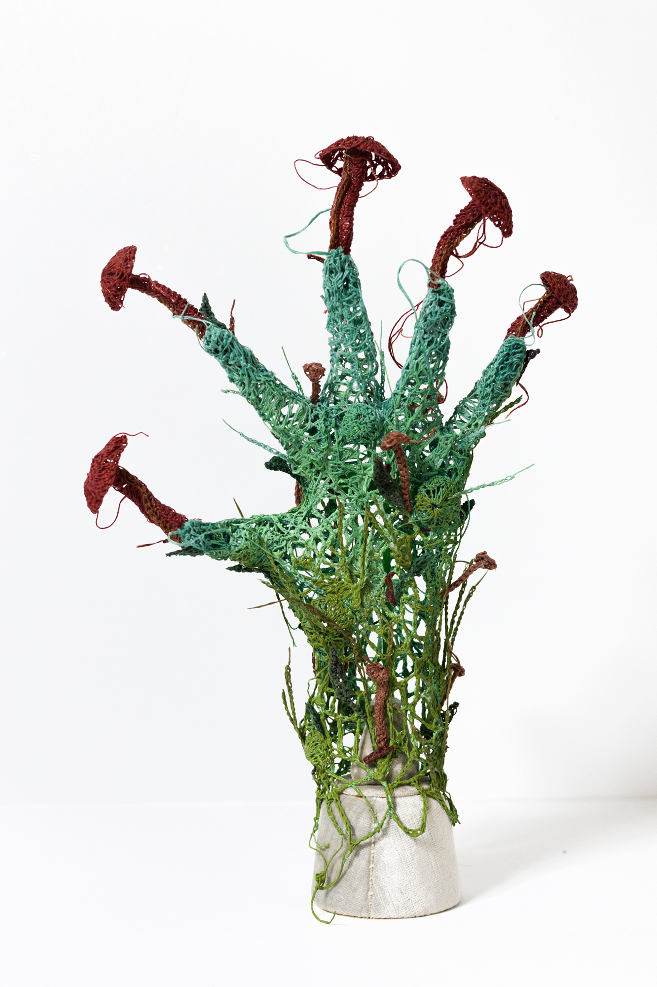 Through a speculative view of a post-human world, McCormack imbues her work with a sense of foreboding that contrasts the medium of crochet and its comforting, nostalgic associations. Her current exhibition at Elijah Wheat Showroom titled SOUVENIRS OF THE WASTELAND, a duo show with Kat Ryals, also considers ideas around tacky novelties, sci-fi, and the impact of textile industry waste.
