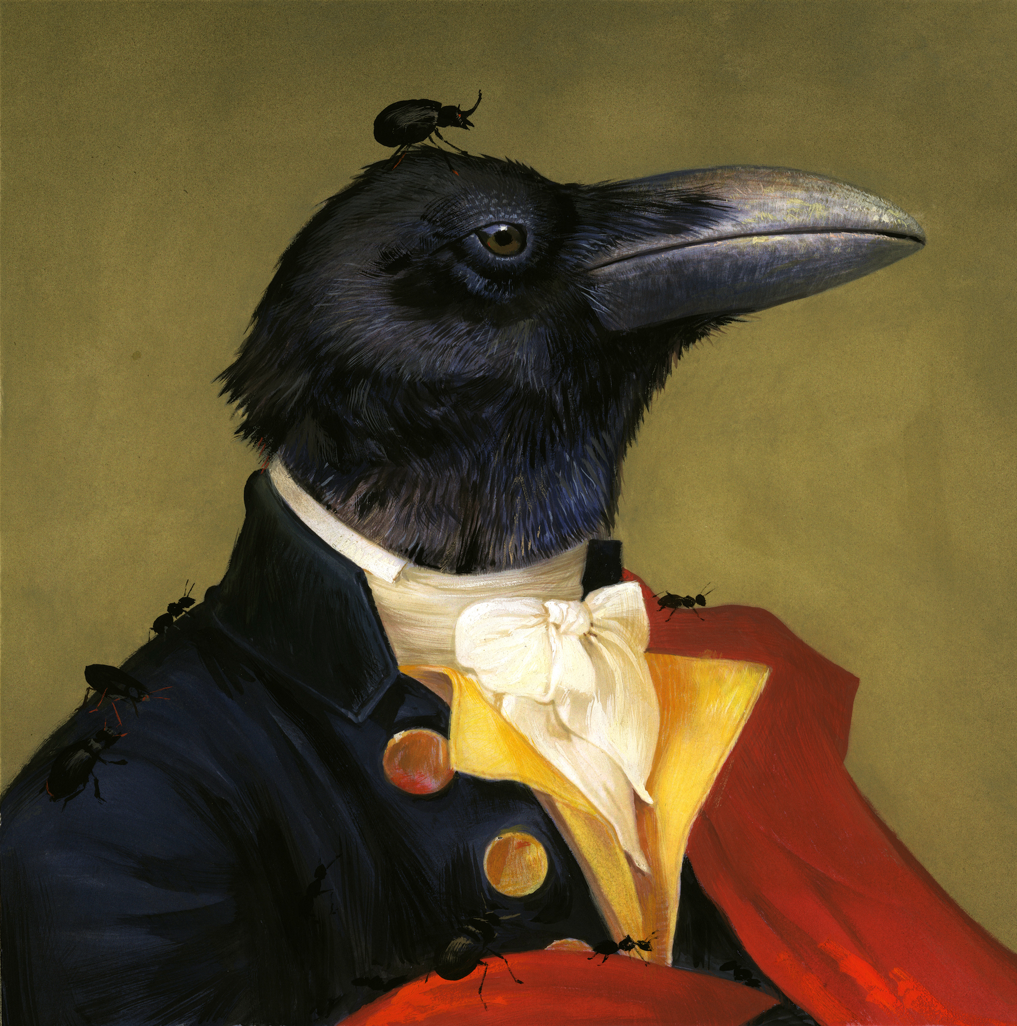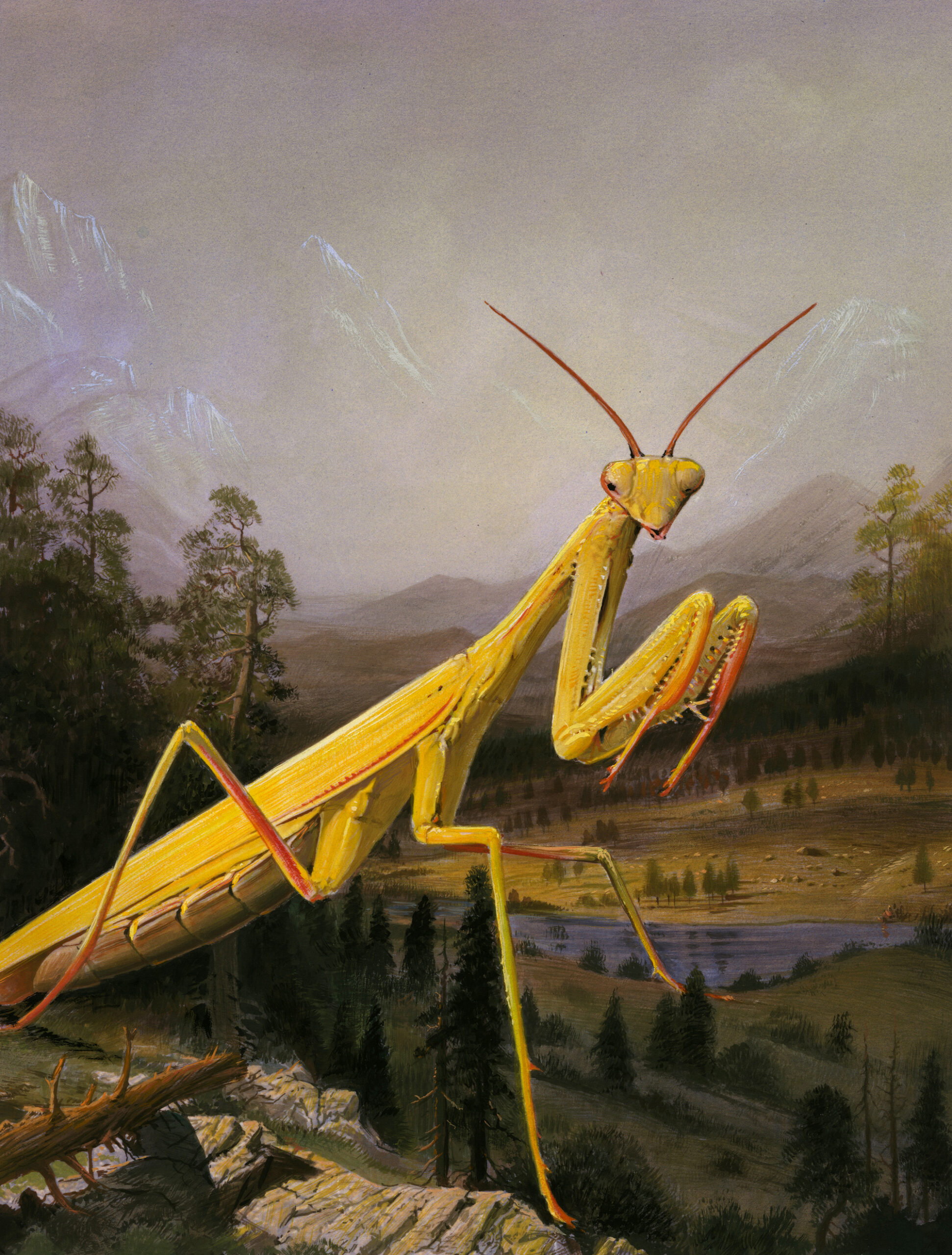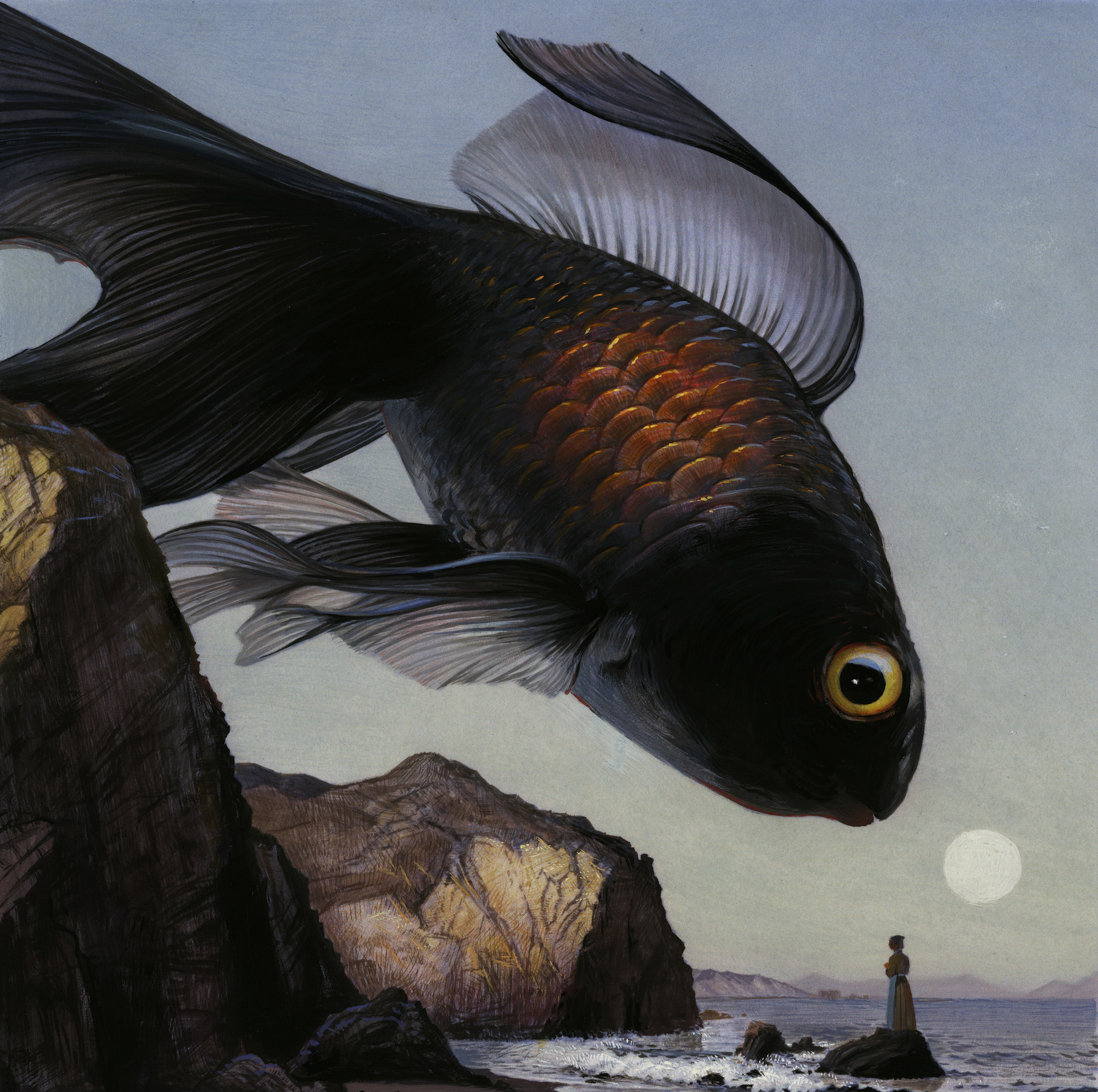 Reimagining European art historical genres with a special affinity for the Romanticists, artist and illustrator Bill Mayer’s wry and moody paintings (previously) merge fantastical figures with vast landscapes. From a haughty crow with insect companions to a giant goldfish overseeing a lone figure on the coast, the artist’s enigmatic scenes highlight hybrid creatures and unexpected relationships.