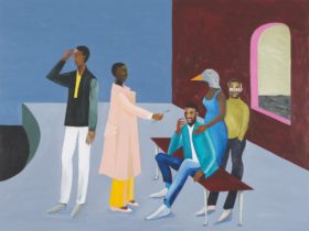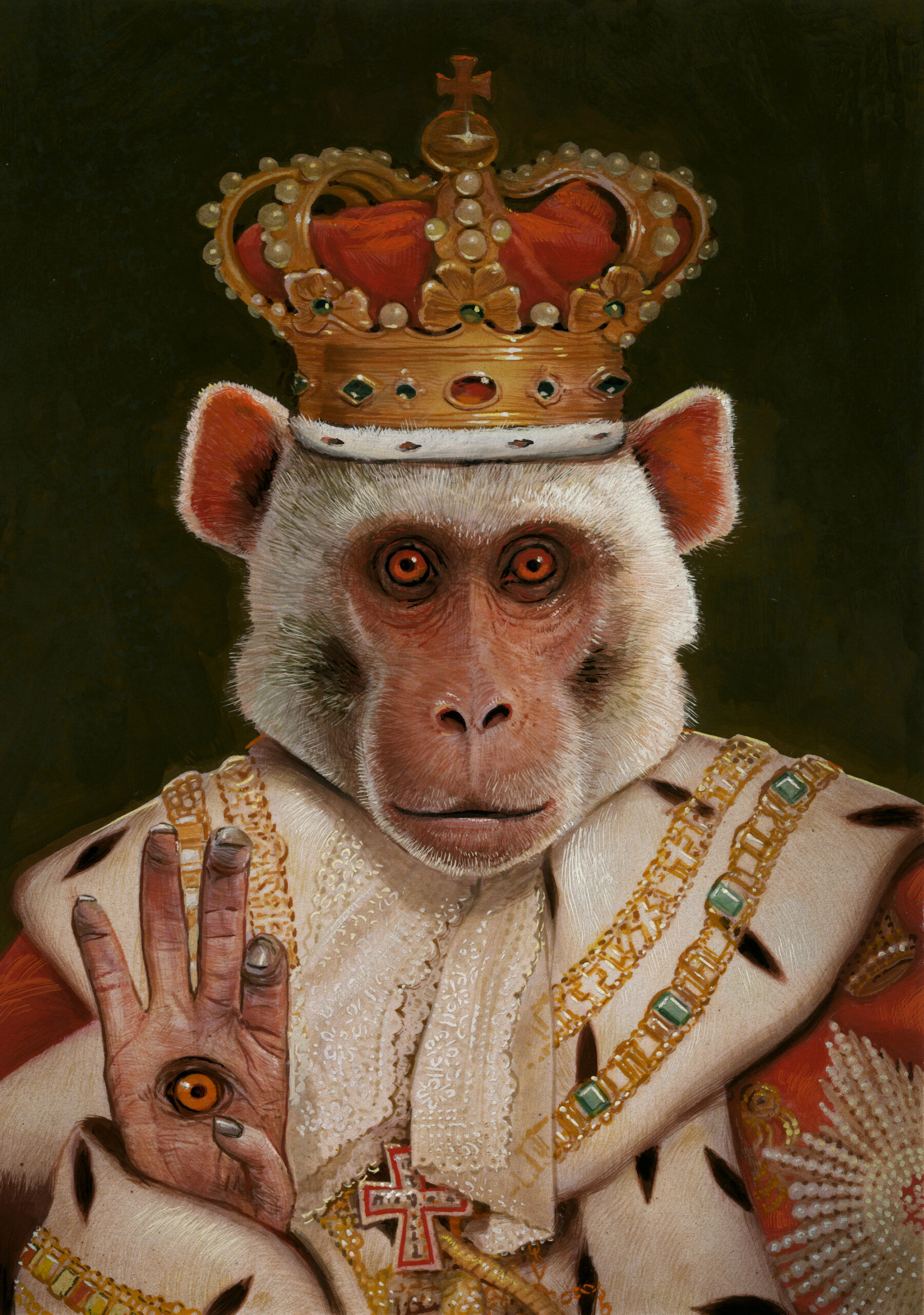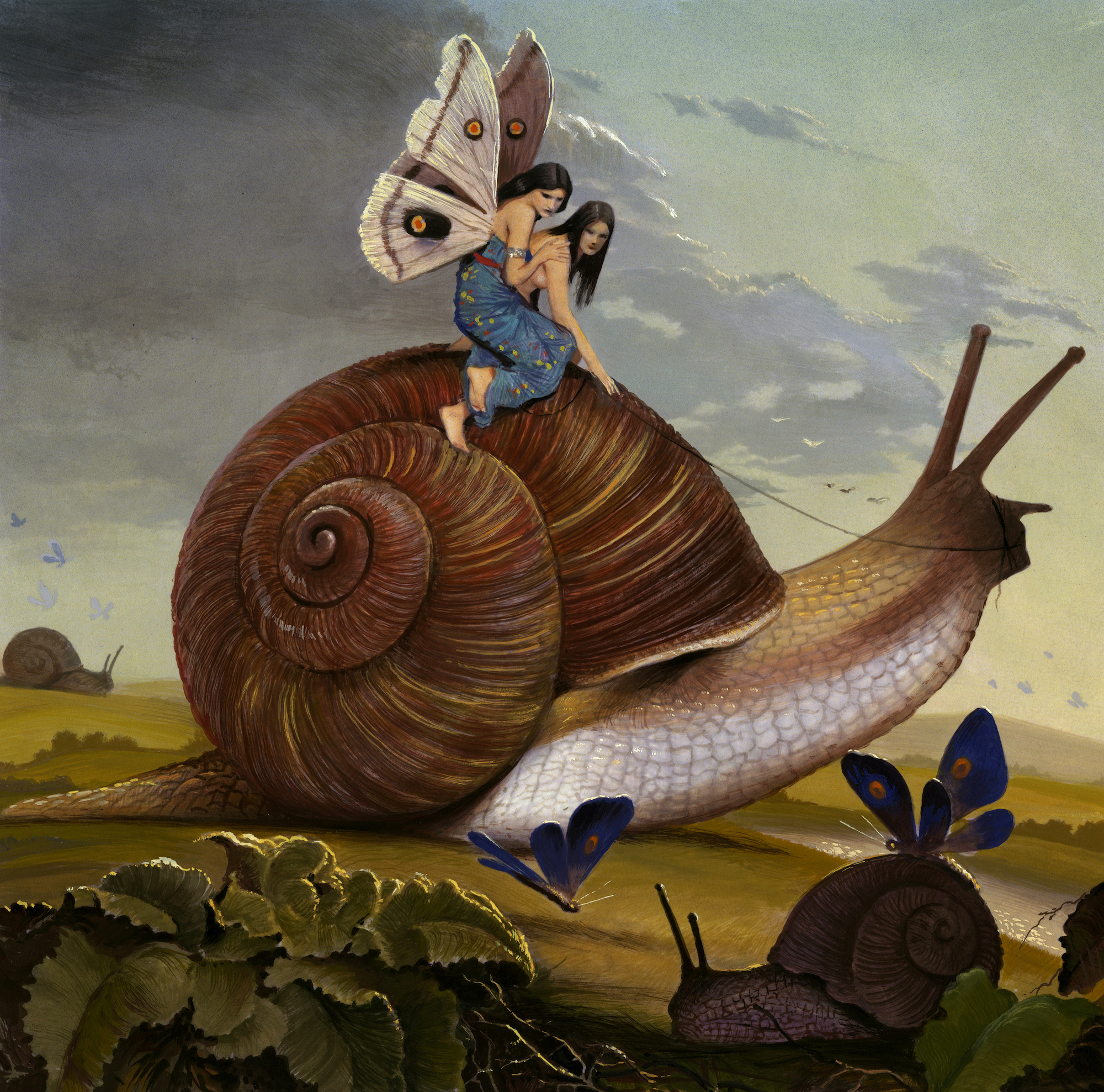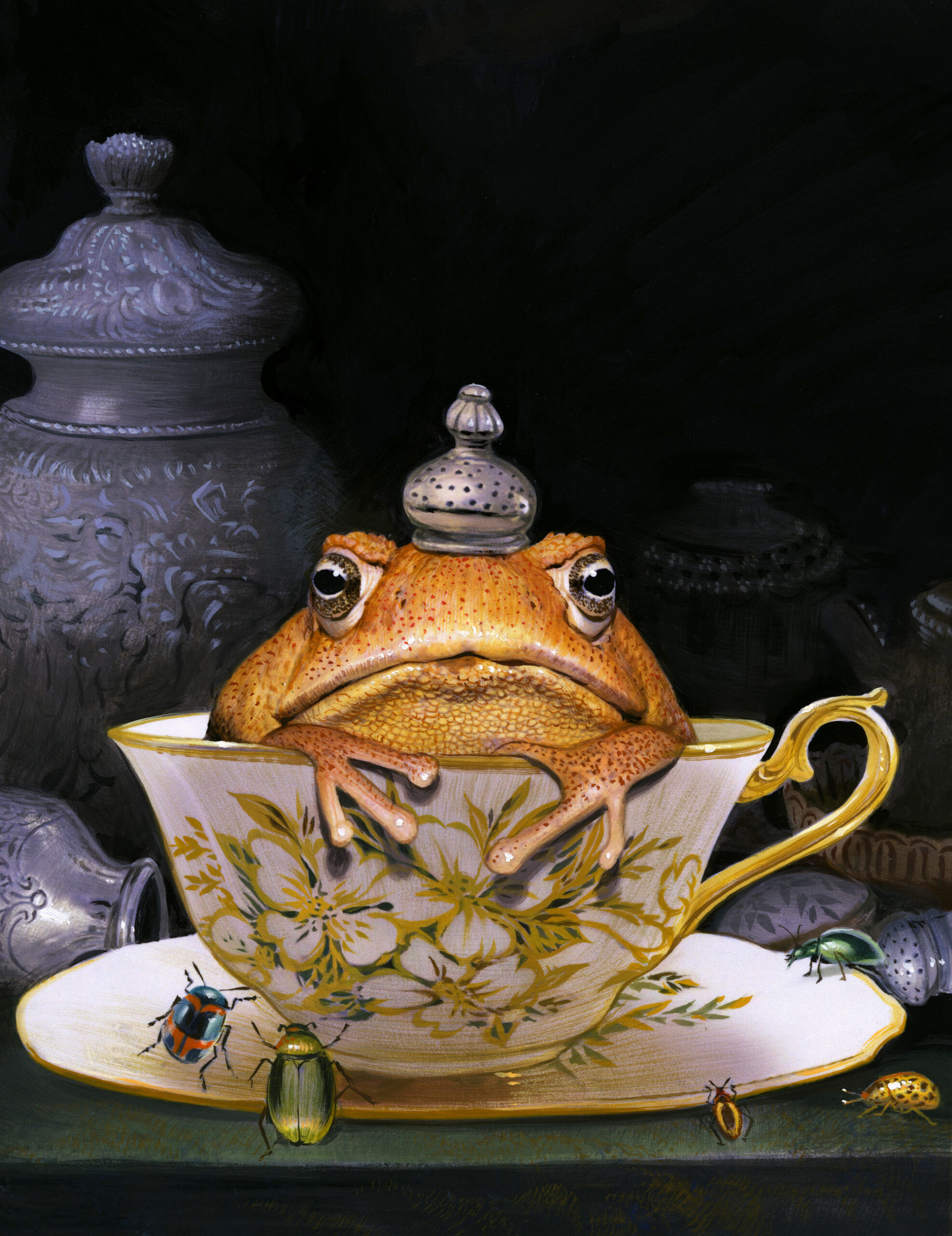 Reimagining European art historical genres with a special affinity for the Romanticists, artist and illustrator Bill Mayer’s wry and moody paintings (previously) merge fantastical figures with vast landscapes. From a haughty crow with insect companions to a giant goldfish overseeing a lone figure on the coast, the artist’s enigmatic scenes highlight hybrid creatures and unexpected relationships.