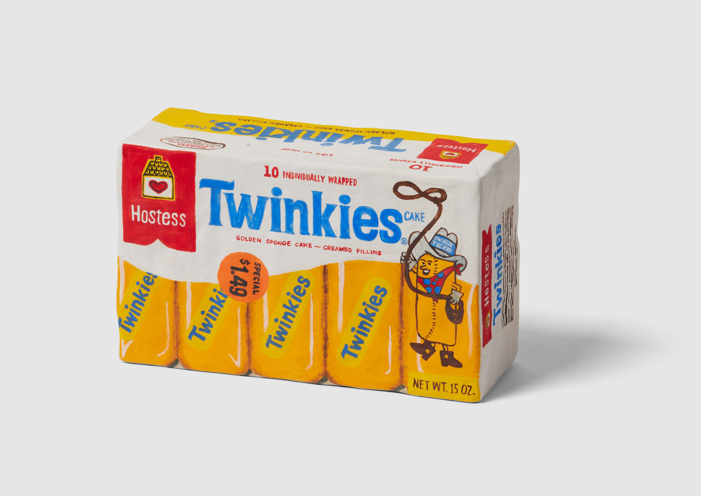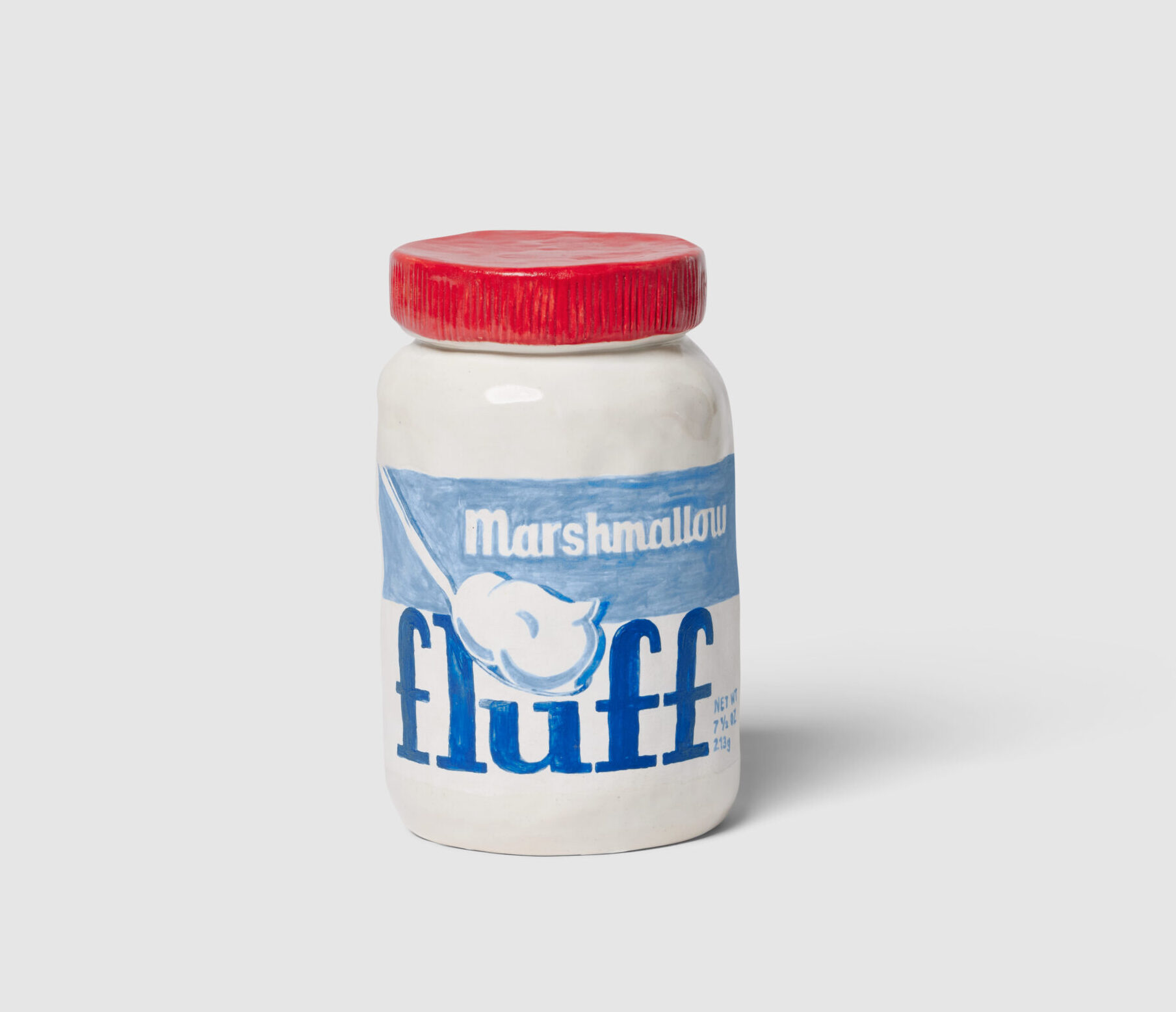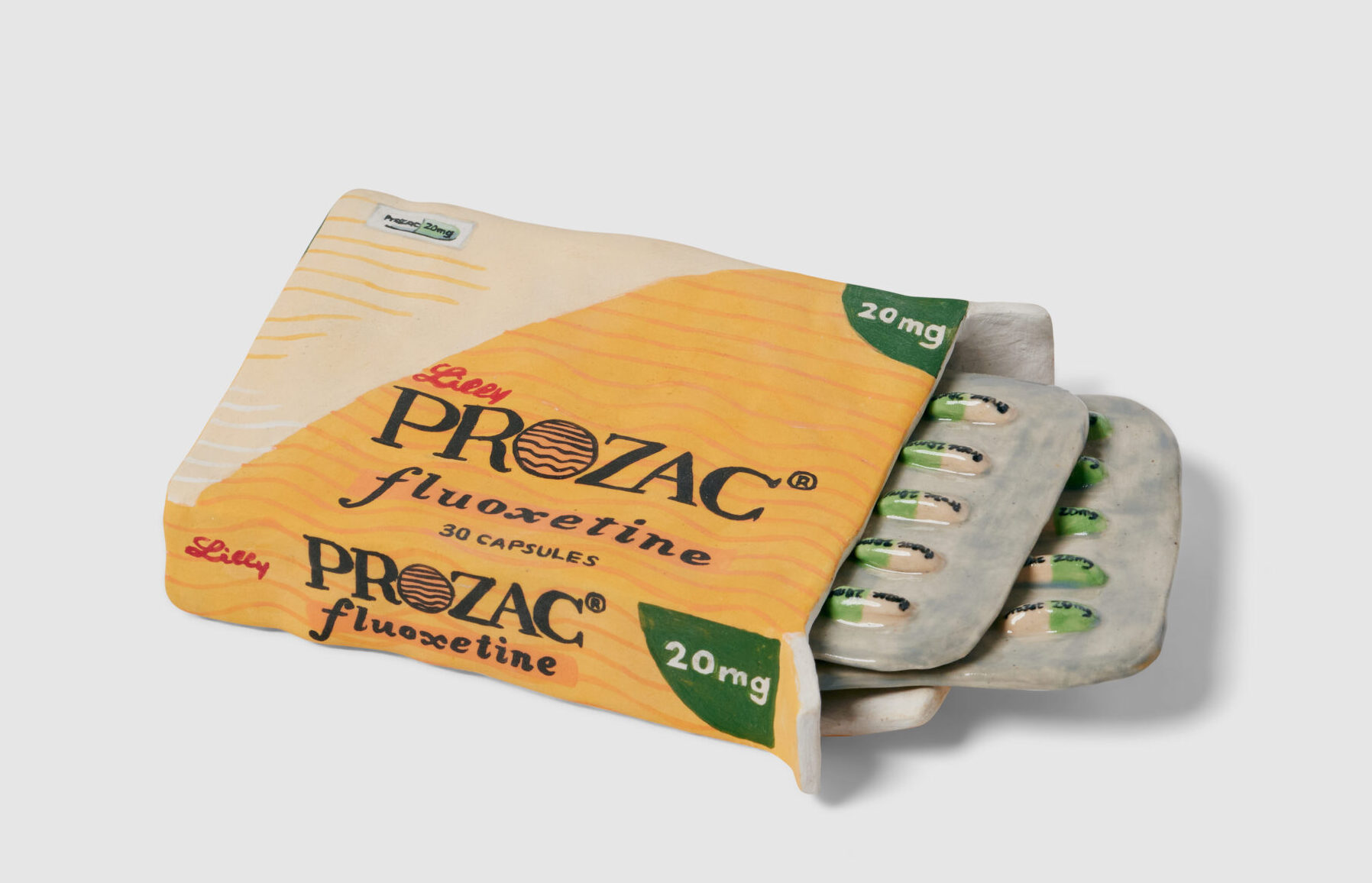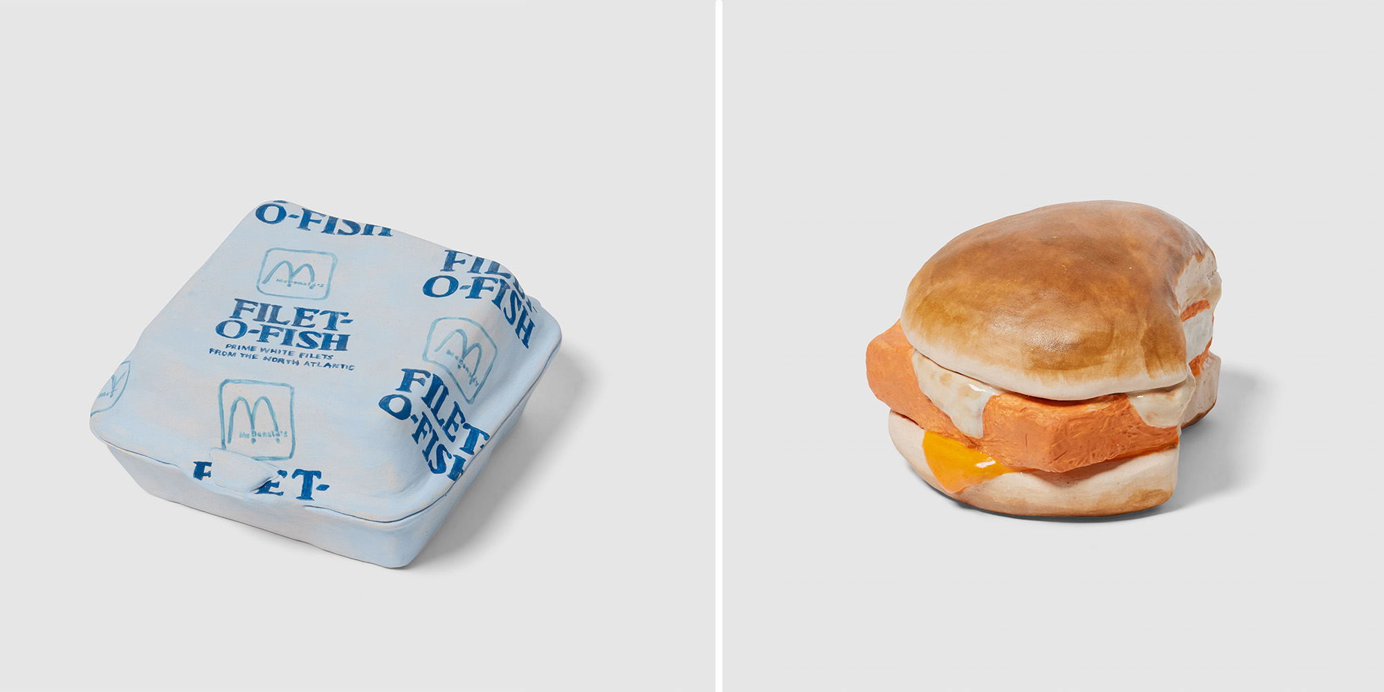 Molding each sculpture by hand, the Brooklyn-based artist uses stoneware clay to create hollow forms. She paints each with underglaze and adds a clear layer to some, achieving a finish similar to plastic or glass packaging. Extensive lettering appears in the form of logos, ingredients, nutrition facts, and even newspaper articles, all done freehand.
