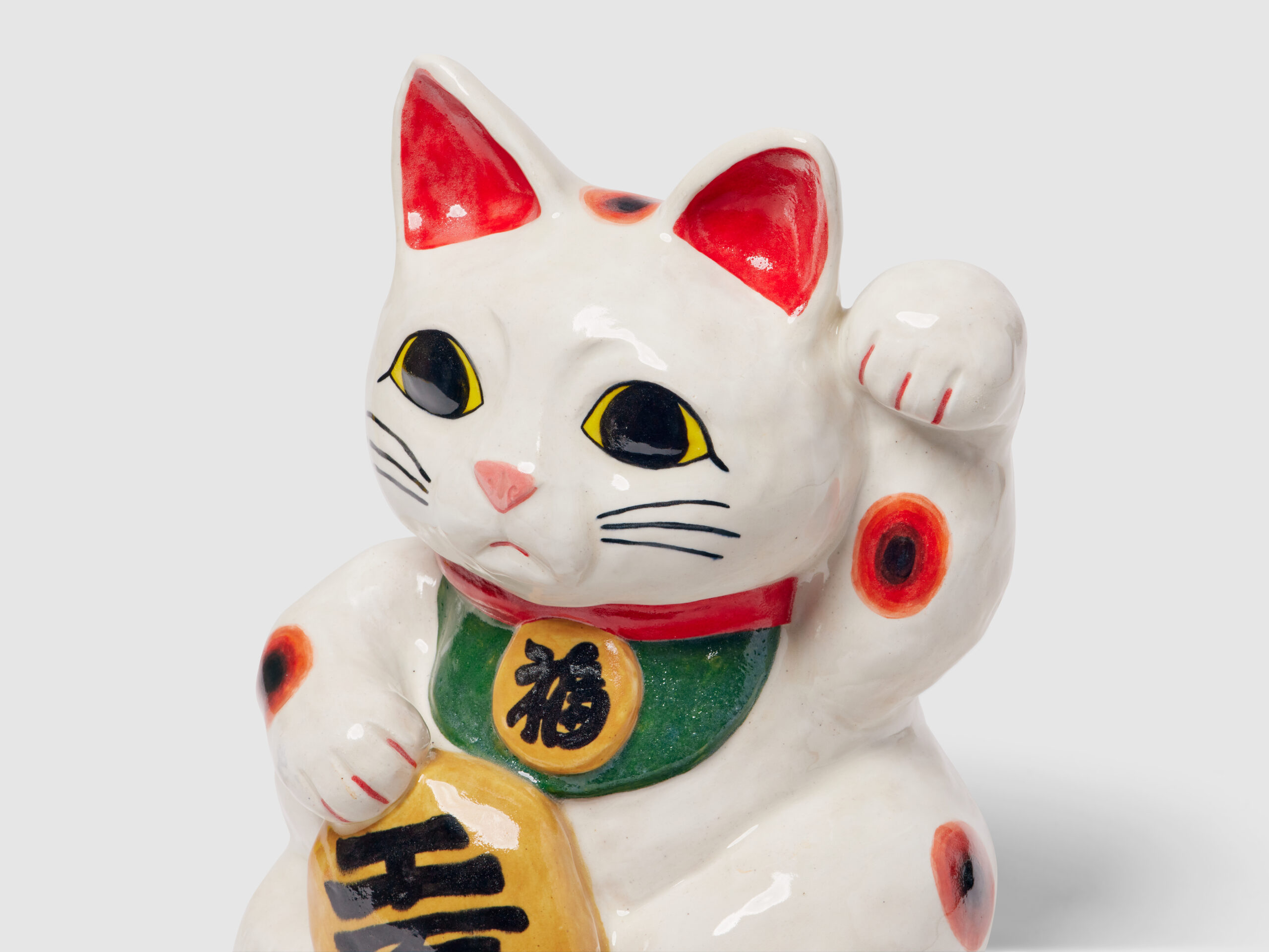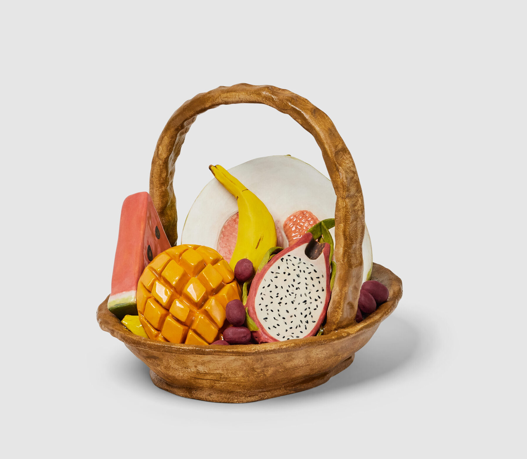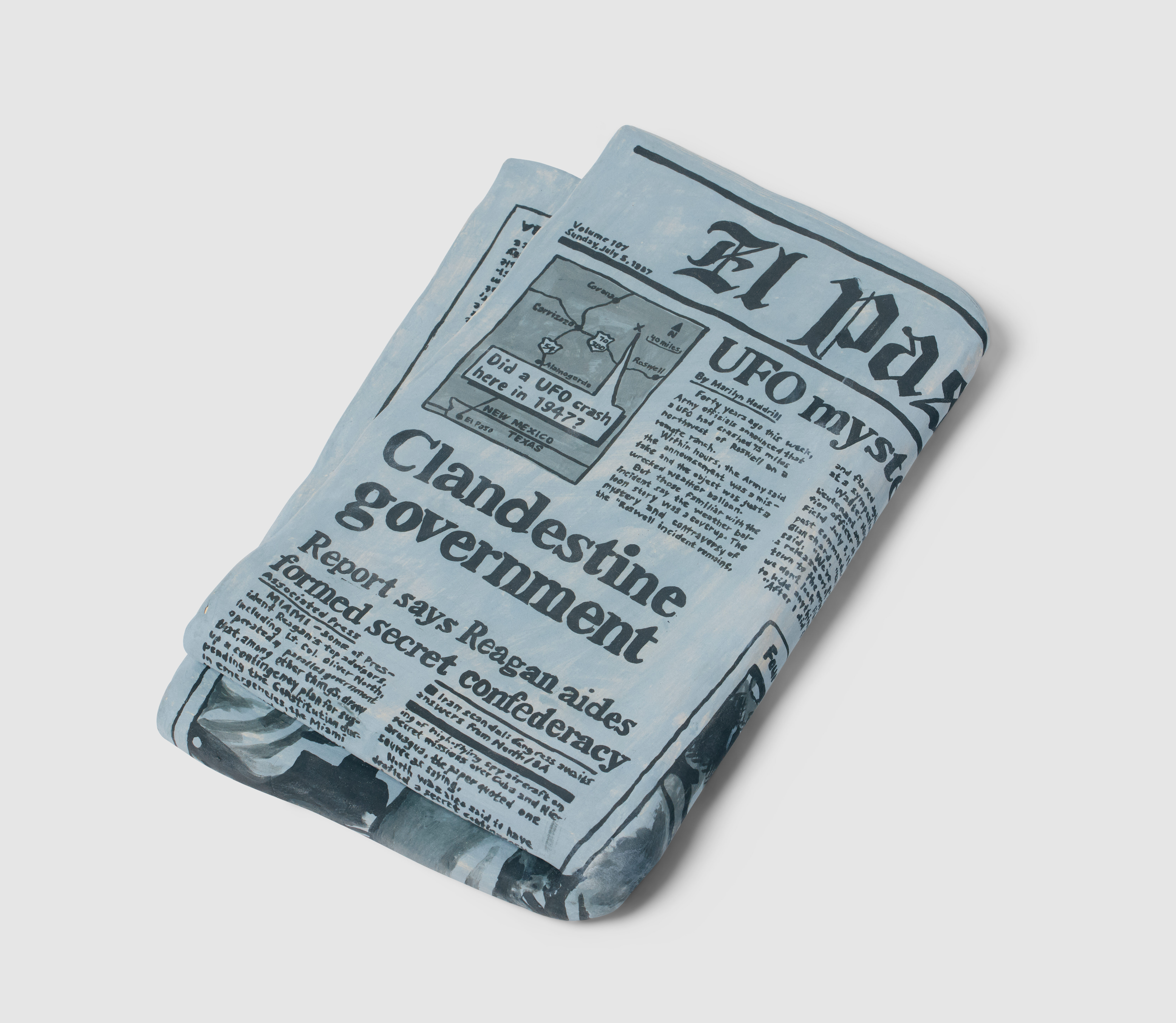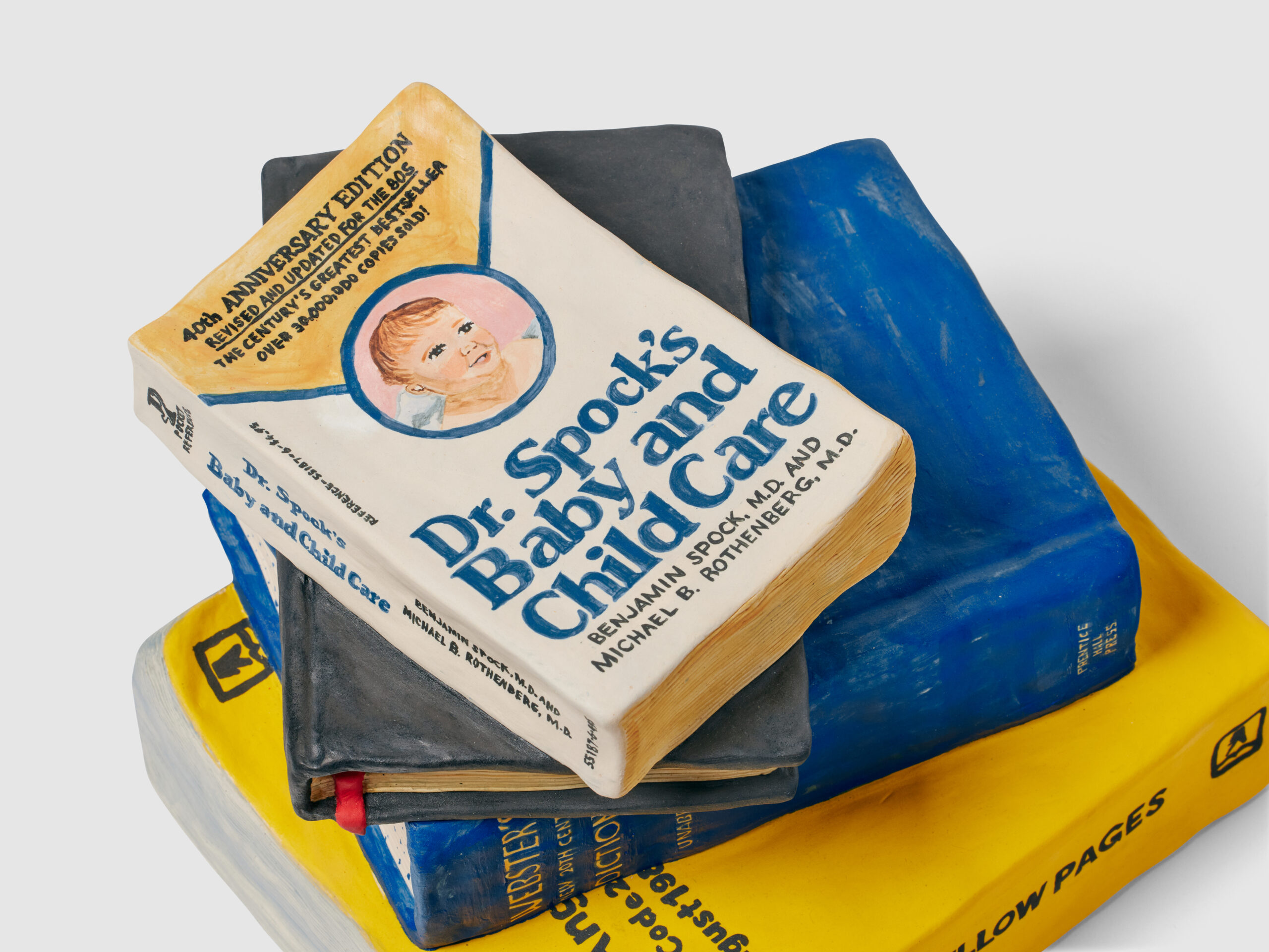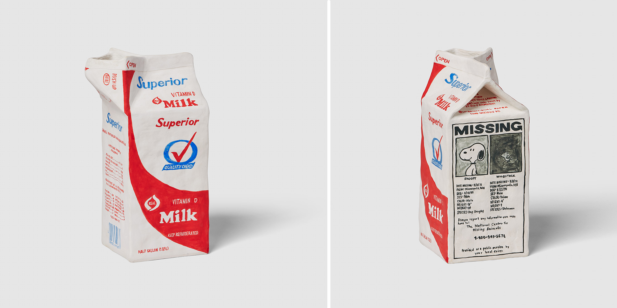 Molding each sculpture by hand, the Brooklyn-based artist uses stoneware clay to create hollow forms. She paints each with underglaze and adds a clear layer to some, achieving a finish similar to plastic or glass packaging. Extensive lettering appears in the form of logos, ingredients, nutrition facts, and even newspaper articles, all done freehand.