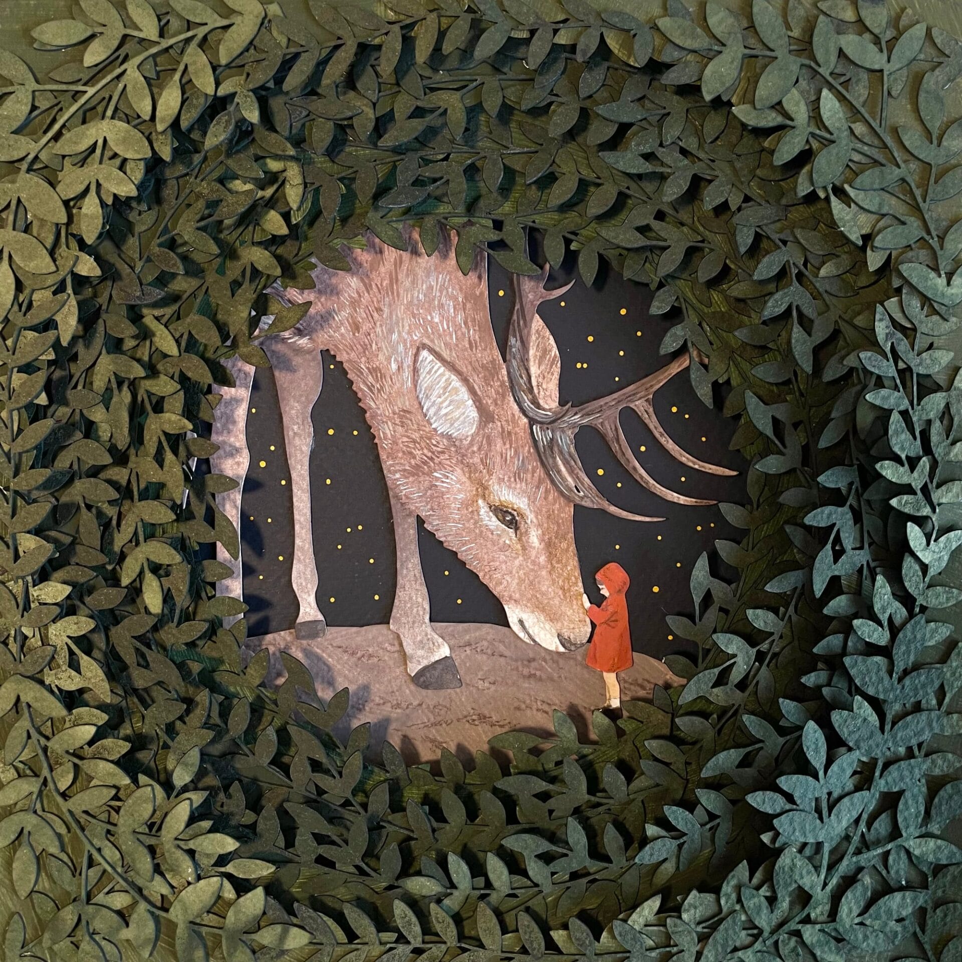 In Abe’s nighttime scenes, enormous wolves and deer greet a young girl donning a red cape. “To me, Nushi symbolizes timeless wisdom that remains constant regardless of the changing world around us,” she says. “I think we can all relate to this sentiment—that, sometimes, we need to step back from the world, embracing moments of isolation to rediscover ourselves.”