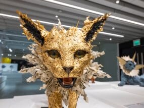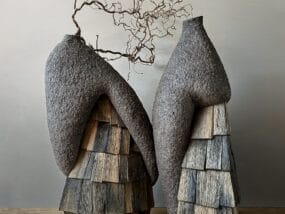 “I’ve always been captivated by the fluidity of ceramics,” says Rebecca Manson. Invoking metamorphosis in material and subject matter, the artist fashions large-scale wings and bodies that gracefully drape from gallery walls with eyespots and other patterns cloaking the forms.
