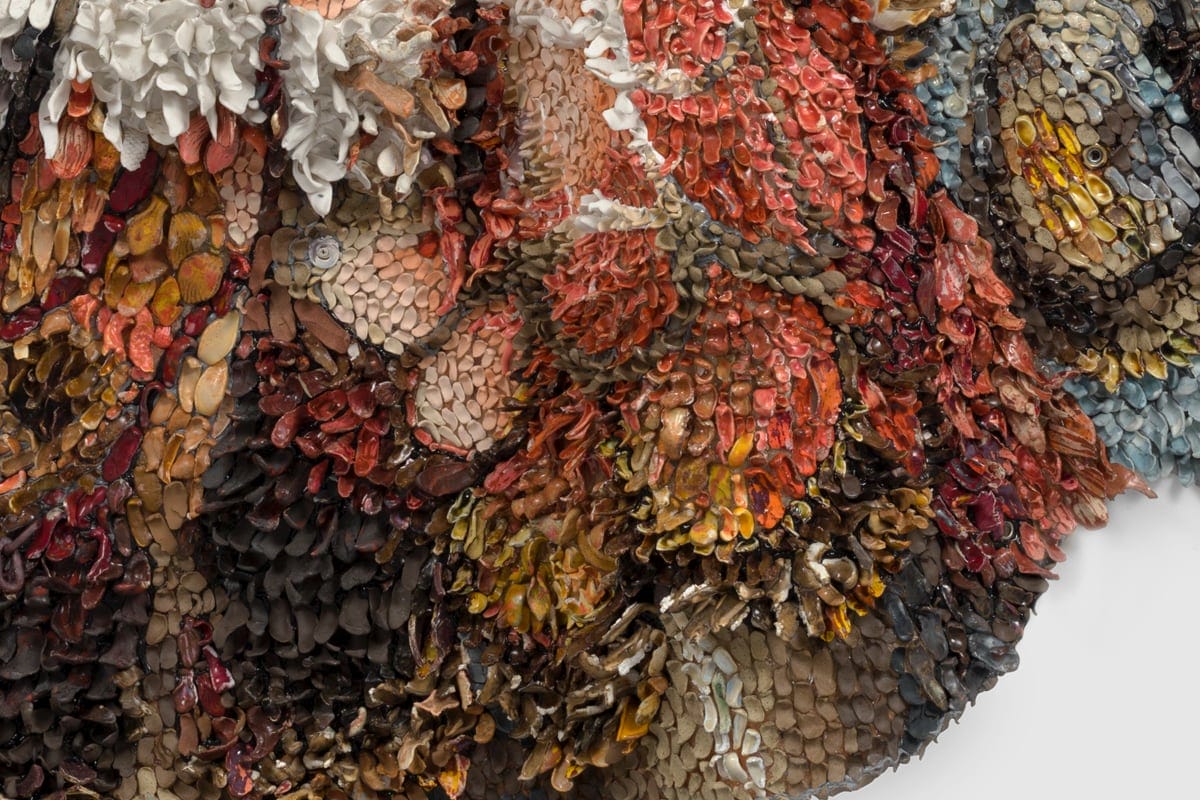 Scaling upwards of seven feet, Manson’s sculptures comprise thousands of individual components that the artist and her team of assistants refer to as “smushes,” small bits of clay they flatten in their hands. The pieces are tedious to make, although the process can be meditative when there’s a rhythm that builds, particularly when constructing enormous numbers like the 200,000 required for her upcoming solo show at Josh Lilley in London.