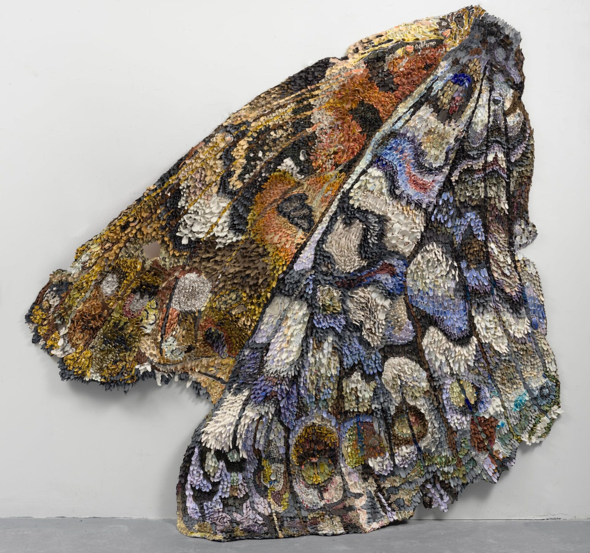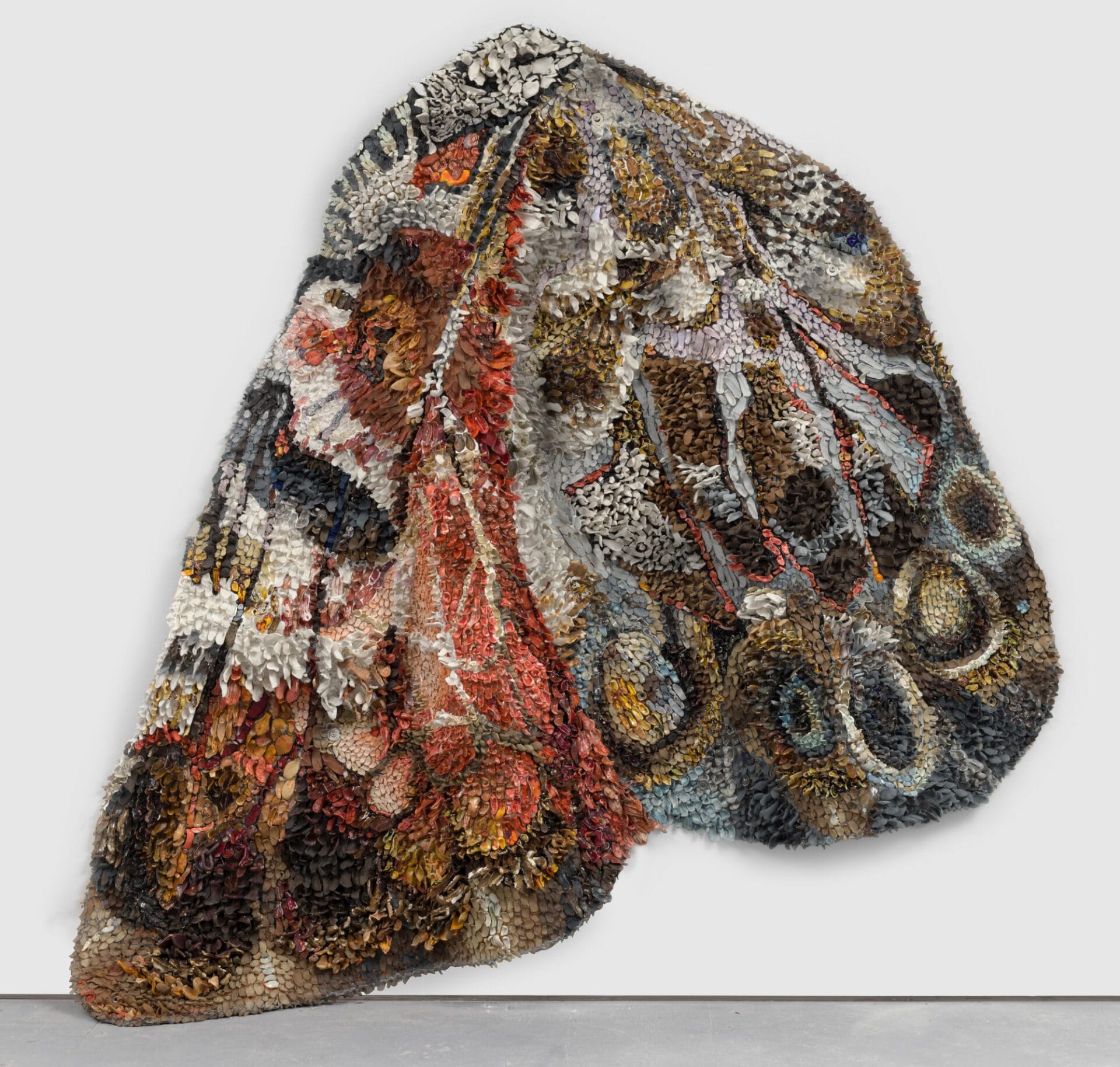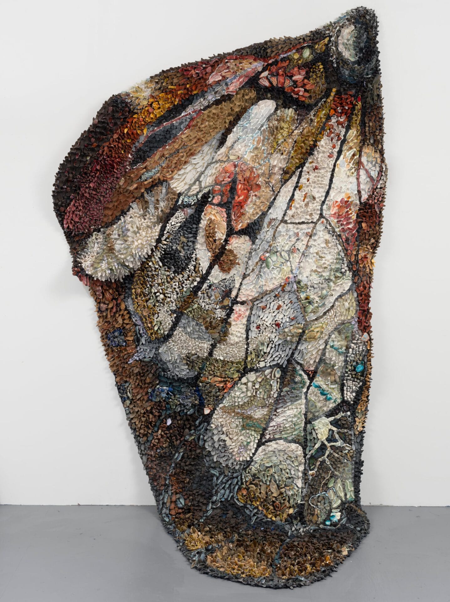 Porcelain pieces in lavender, crimson, and beige emerge from the artist’s studio before being attached to the wings in dense, feather-like clusters, animating the otherwise rigid material.