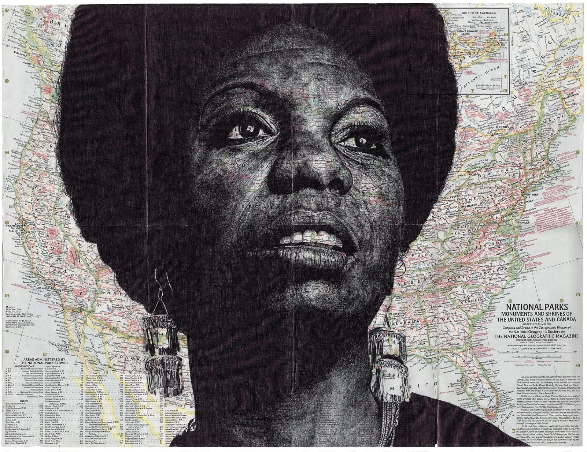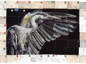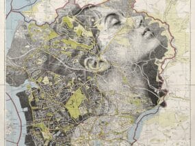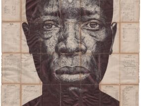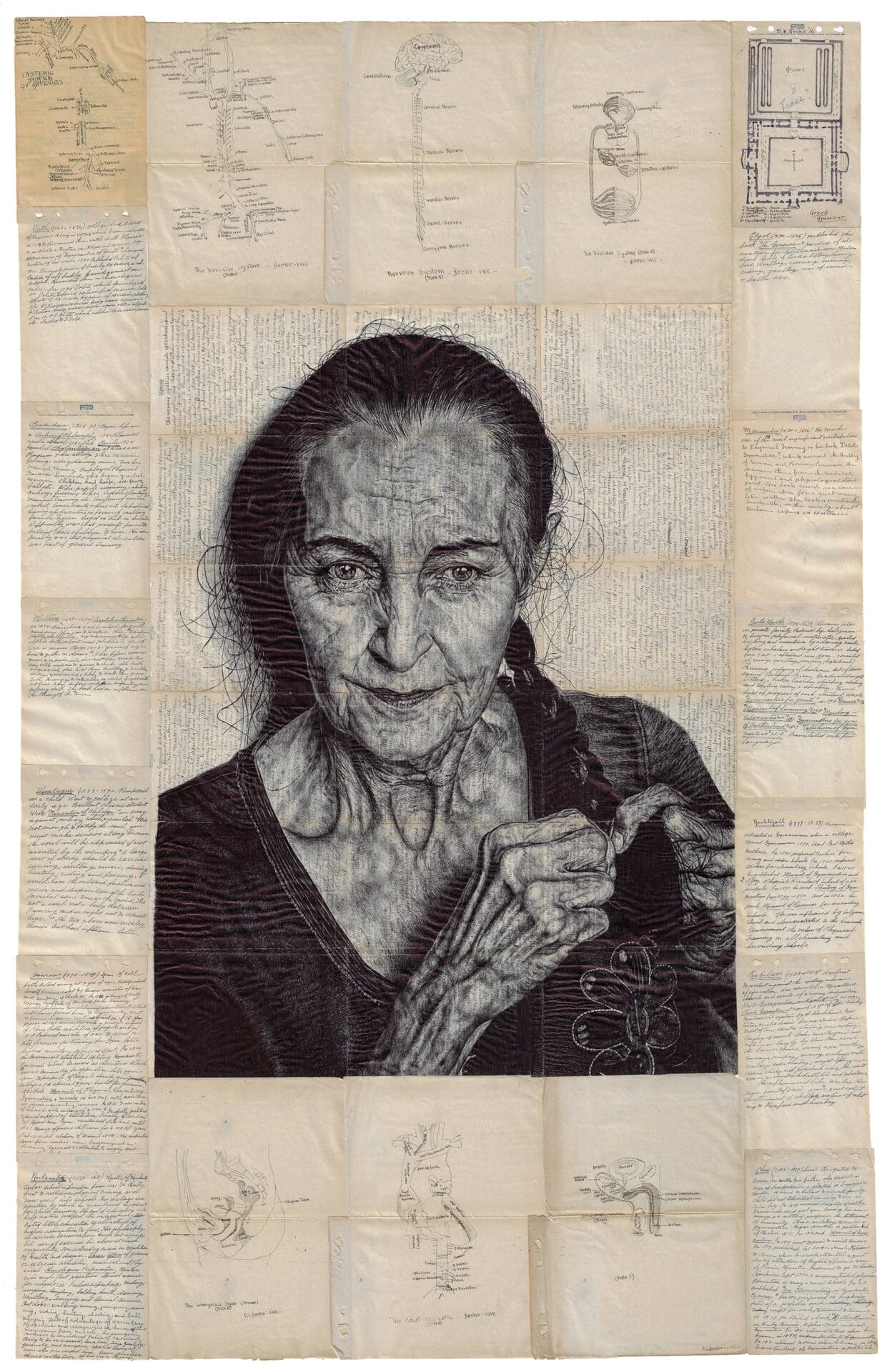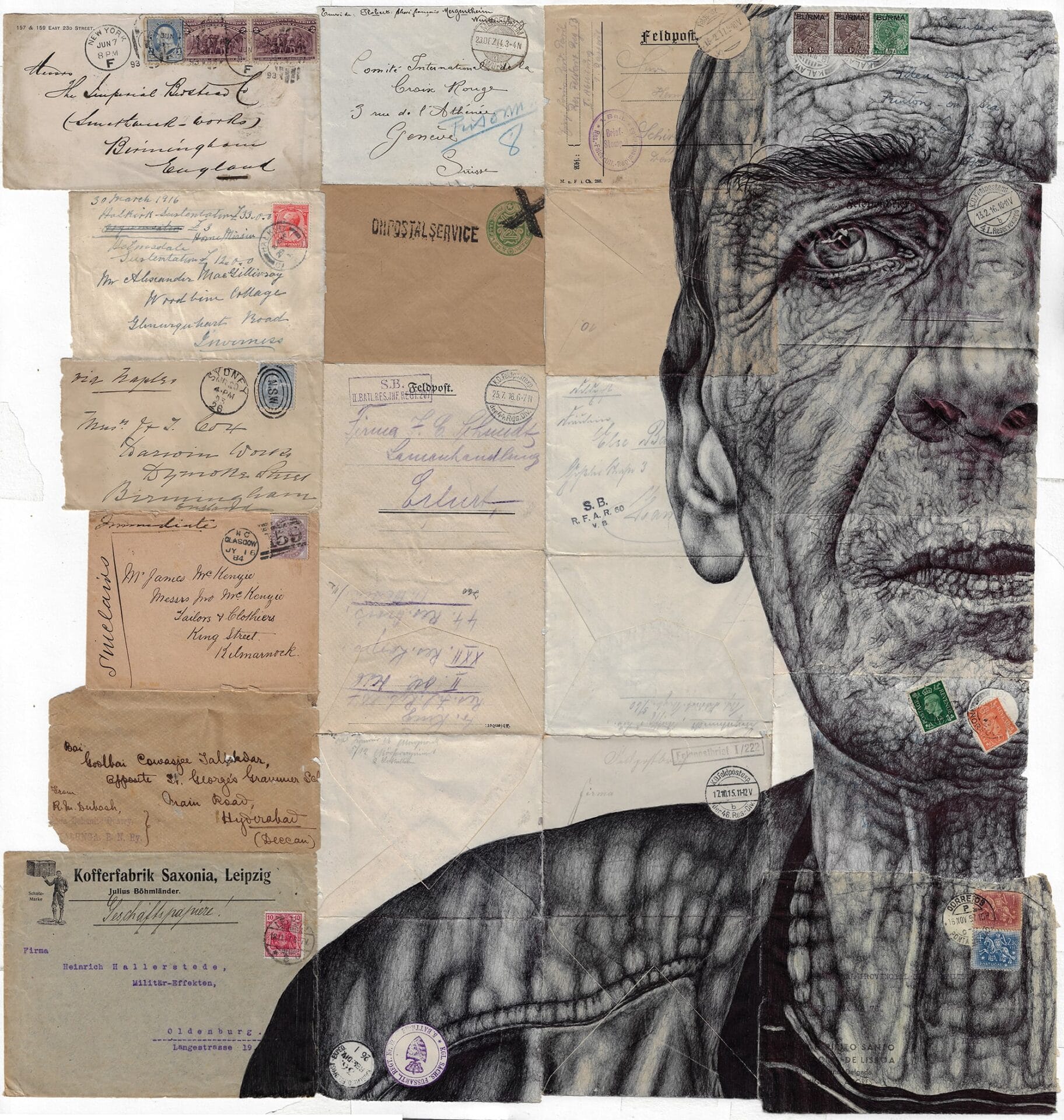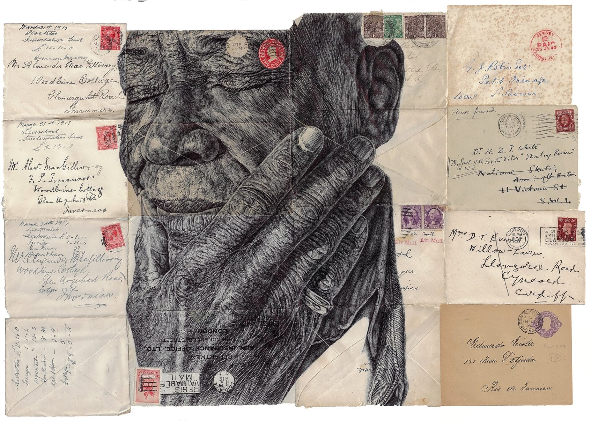 In Mark Powell’s tender portraits, crinkled eyes and foreheads creased with age mirror highways and scrawled cursive notes. The artist (previously) pairs meticulously detailed drawings of older subjects with stamped envelopes, vintage book pages, and maps weathered from use, superimposing faces onto the worn, often collaged, substrates. Producing immense depth and shadow with the humble ballpoint pen, Powell likens the stories and experiences hidden in a face to those held within a letter or note from days gone by.