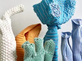 While every character is original, each has a material connection to previous sculptures. “In the studio, I play around with what is new, but I am often compelled to include older pieces from my collection. Artworks made several years apart might have a fabric that unites them,” she shares. “My making process is based on problem-solving, and it feels like there are an infinite number of ways I could work with textiles to approach an idea.”