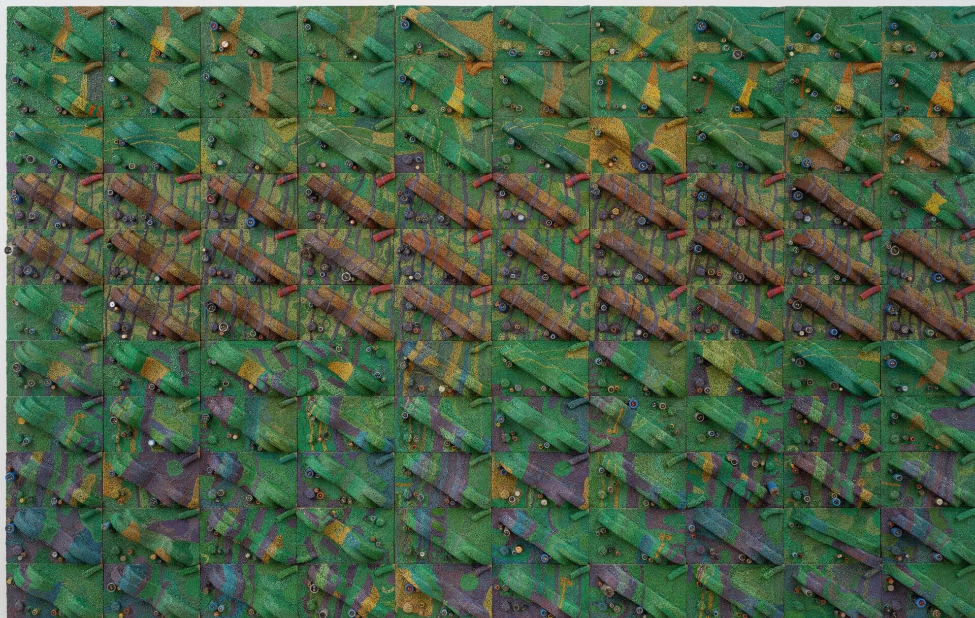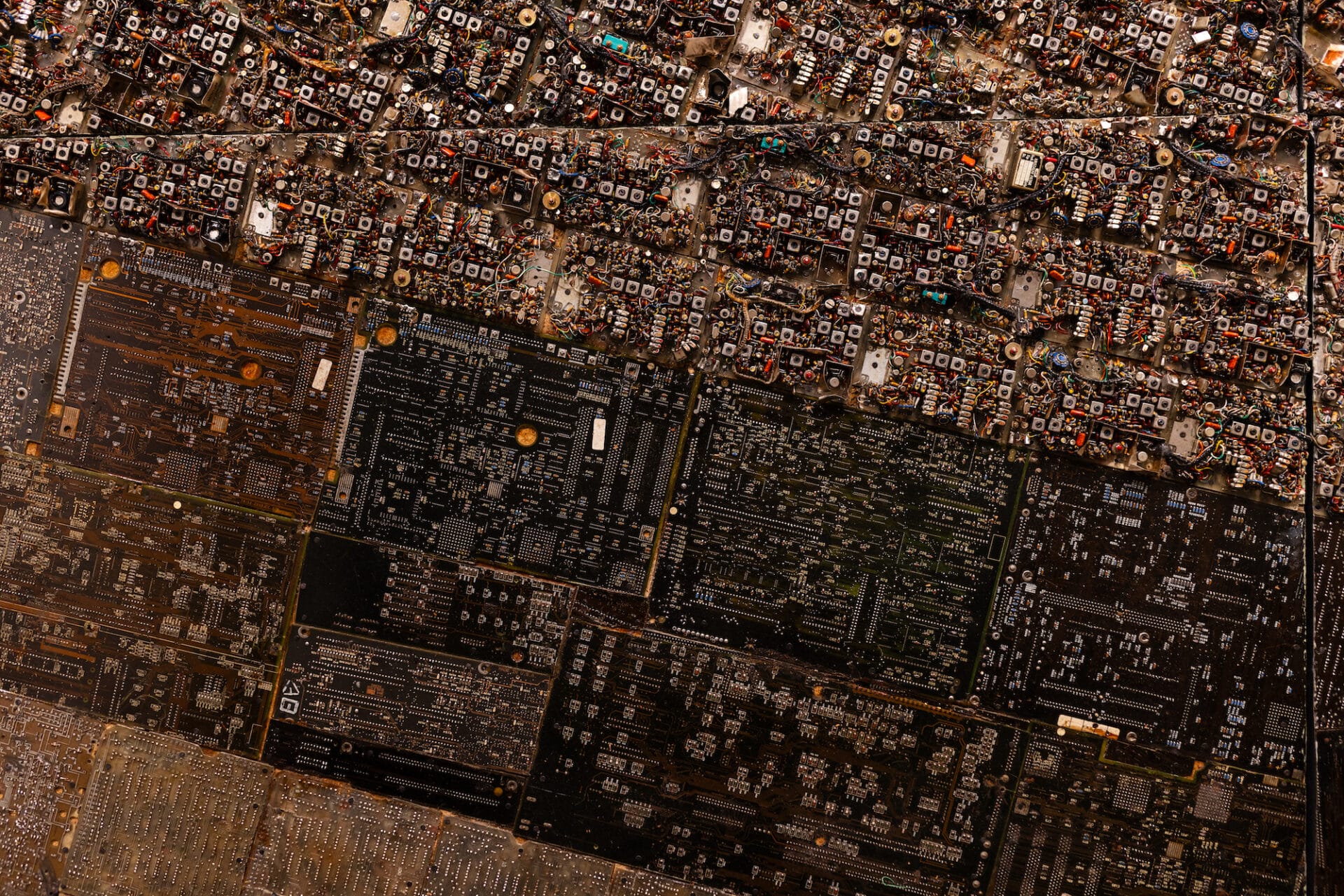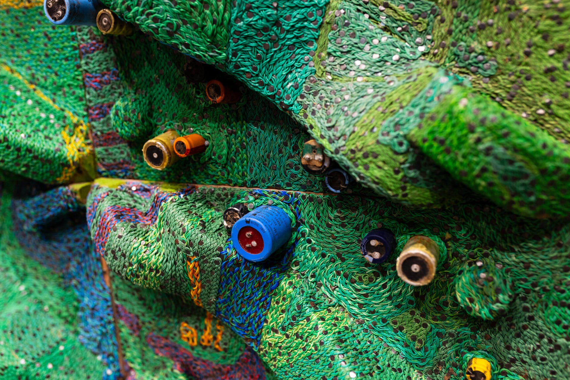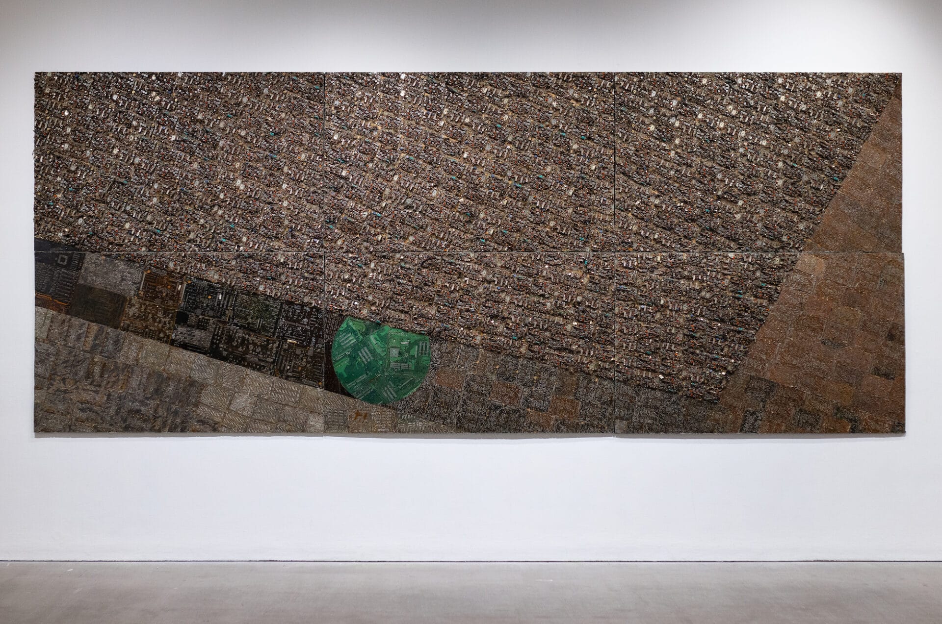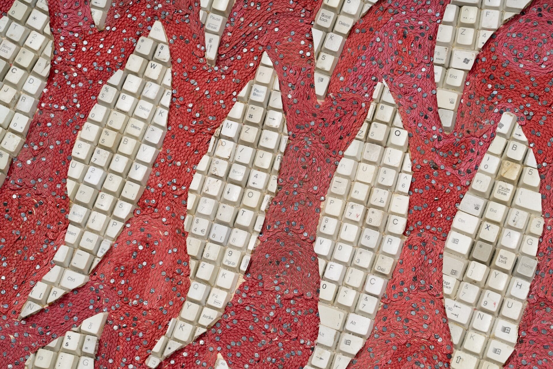 Thousands of microchips, terminals, nails, letter keys, and lengths of wire transform into spectacular, monumental sculptures by acclaimed Ethiopian artist Elias Sime. In his exhibition Eregata እርጋታ at Arnolfini in Bristol, he highlights assemblages made from everyday materials, especially discarded technological detritus like computer keys, circuit boards, wires, and other electronic objects.