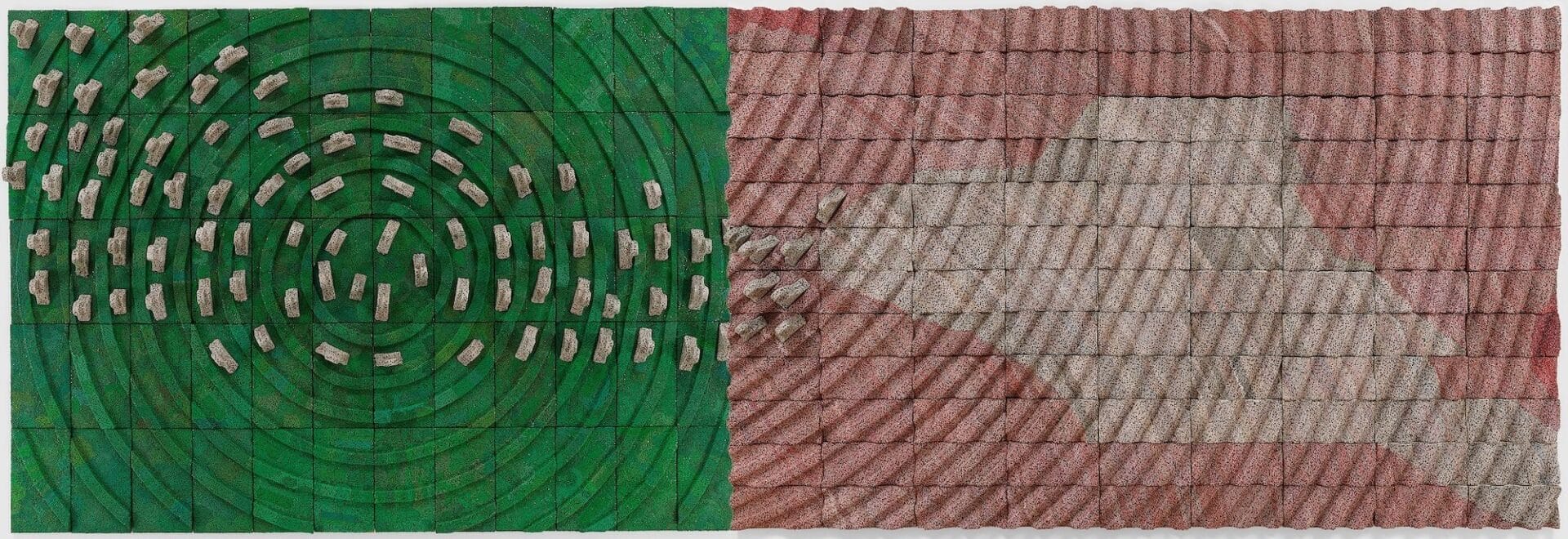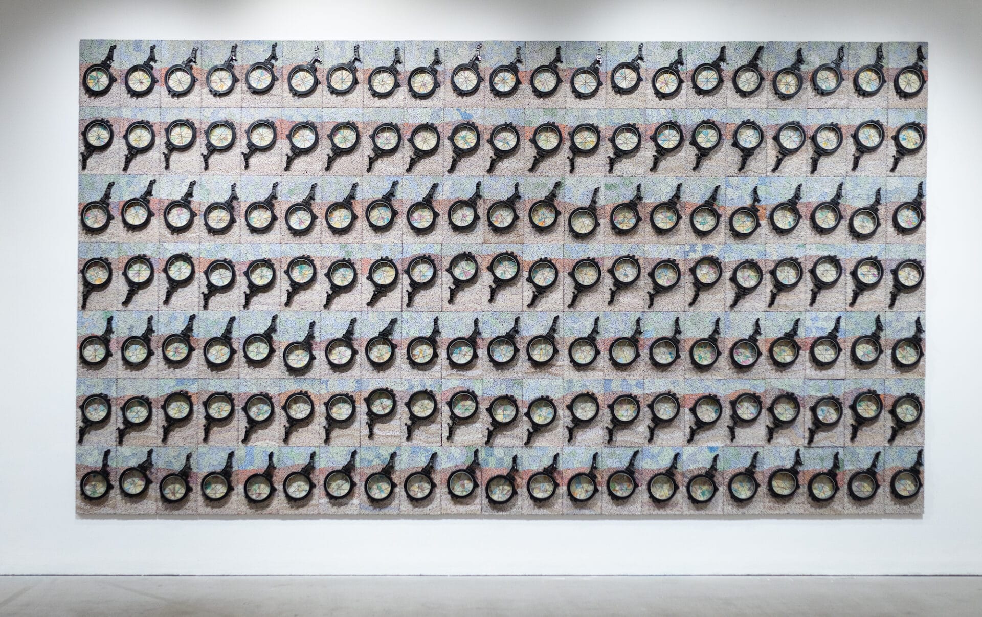 The artist spends years on some of his pieces, collecting the type or amount of material he needs to complete one work, which often takes on the patterned appearance of large textiles. Eregata እርጋታ includes the monumental assemblage “Veiled Whispers,” which comprised part of a major installation he presented at the 2022 Venice Biennale, and many pieces from Sime’s ongoing Tightrope series span architectural surfaces, incorporating thousands of yards of wire.
