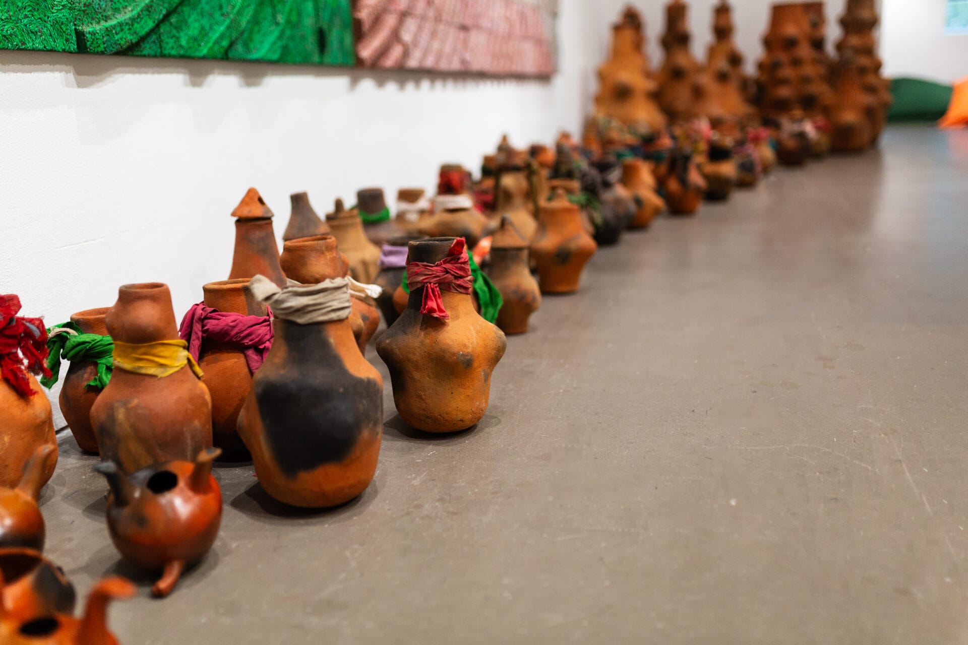 A series of dozens of anthropomorphic ceramic pots titled Bareness winds through the galleries, each vessel a slightly different shape or size, with arms outstretched or wearing scarves around their necks. This sprawling installation draws attention to Sime’s focus on collaboration, community, and togetherness.