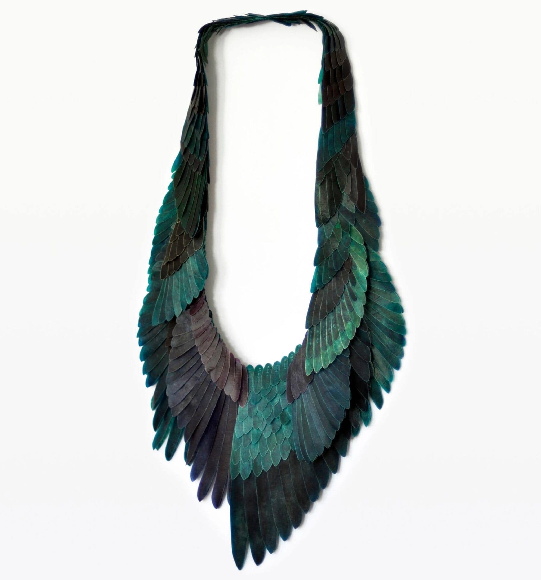 A focus on found and natural materials dominates this year’s shortlist, and many of the works celebrate the beauty of the natural world in both subject matter and substance. Heechan Kim pushes the boundaries of woodworking with “#16,” a voluptuous sculpture made of water-soaked ash strips stitched together with copper wire. Eunmi Chun’s elegant “Wings of the Blue Bird” takes a more carnal approach and is comprised of dried and cut cow intestine that masquerades as blue feathers.