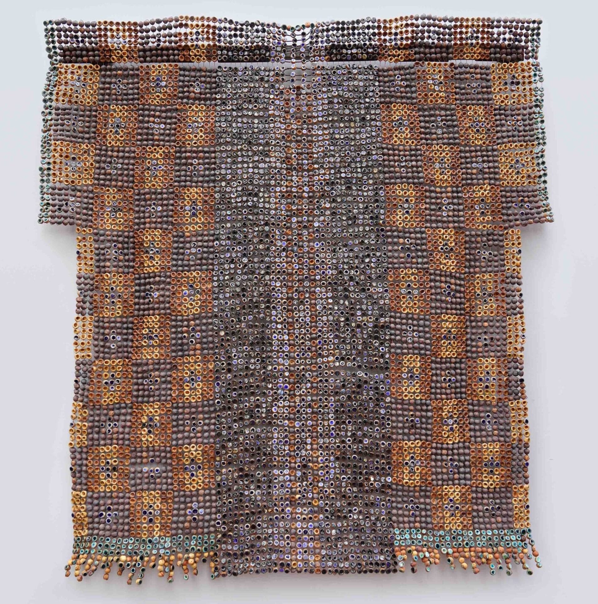 Ozioma Onuzulike, “Embroidered Royal Jumper for Peter Obi,” clay, ash glaze, recycled glass, engobe, copper wire