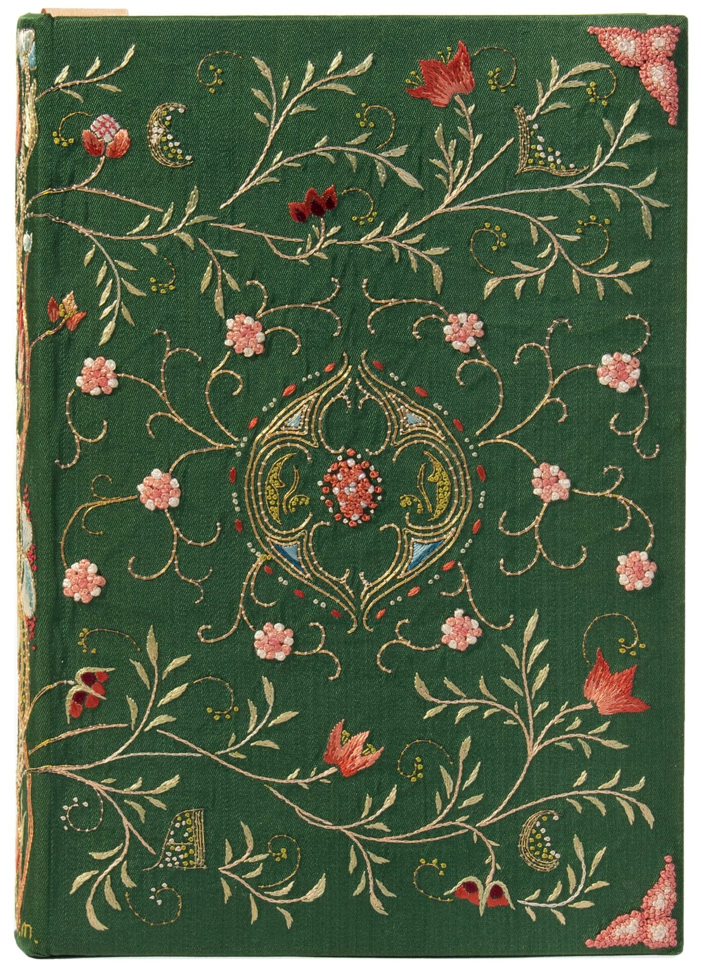 Secular works include a delicate cloth volume from May Morris, the daughter of the famed textile designer William Morris. Cloaked in elegant floral embroideries, the green silk book resembles her father’s ornate naturalistic motifs.