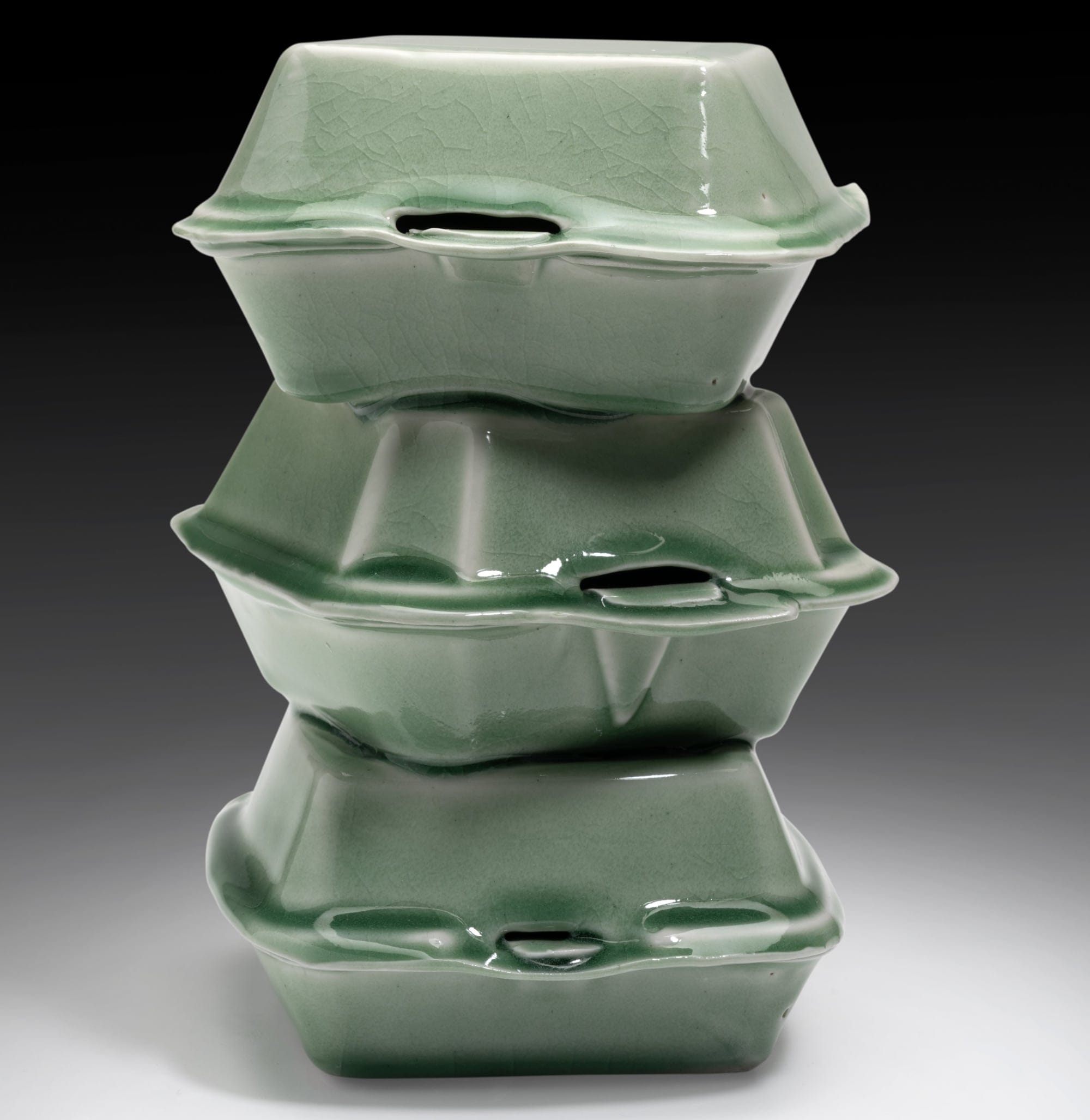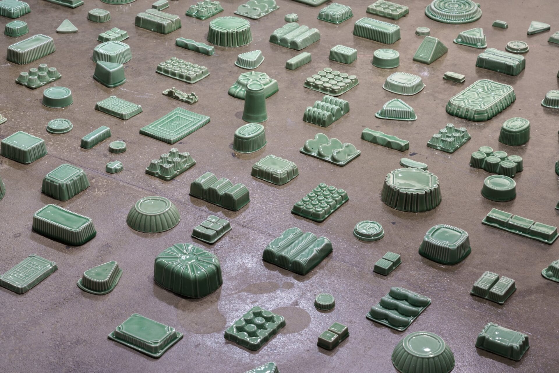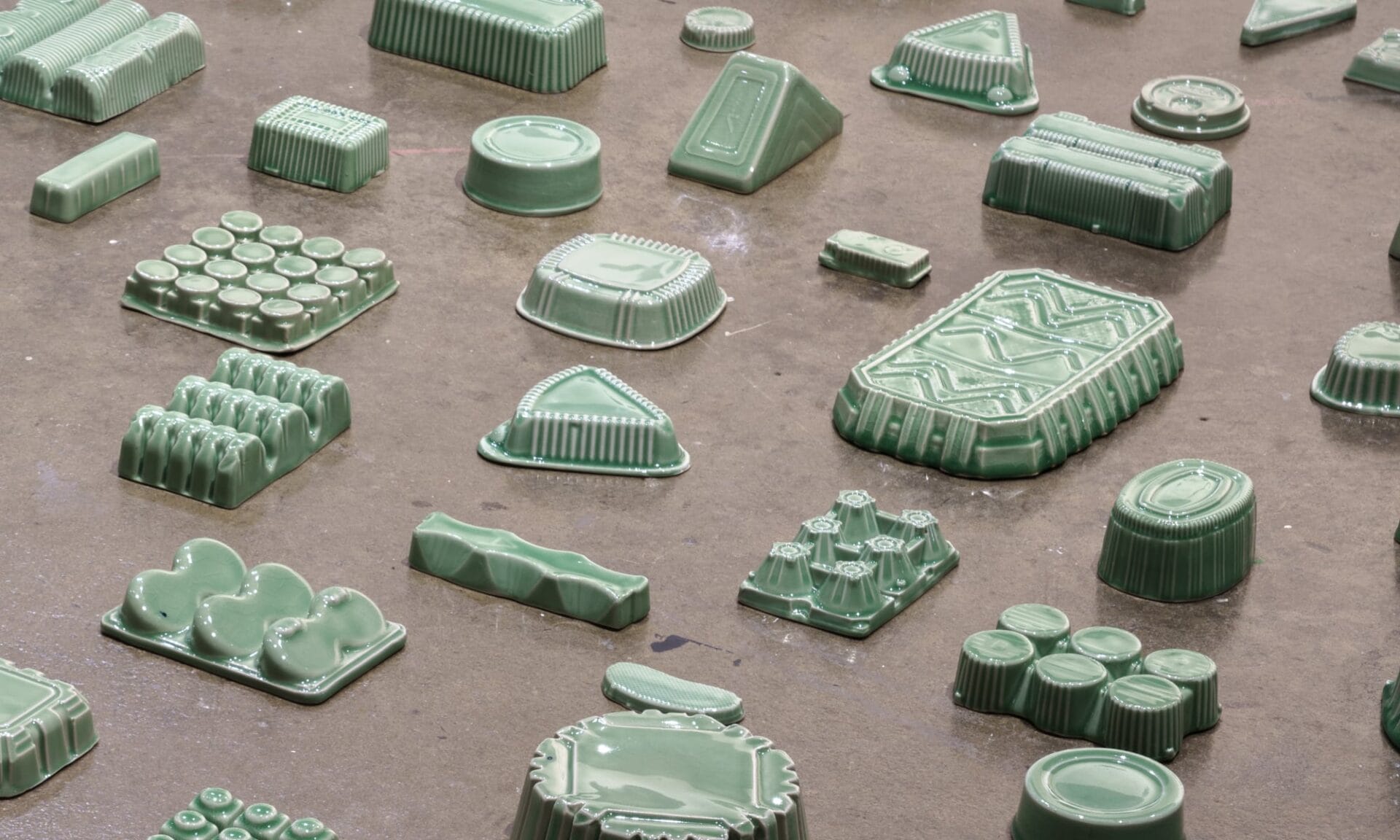 Glazed in celadon, the sculptures juxtapose the decidedly contemporary subject matter with the history of the medium, as the distinctive gray-green hue transformed ceramic production in Korea during the Goryeo dynasty (918–1392). For her ongoing solo show Generally Meant to be Discarded, Nam displays these stacks on soban, small dining tables traditional in Korea that sometimes double as altars. She explains:
