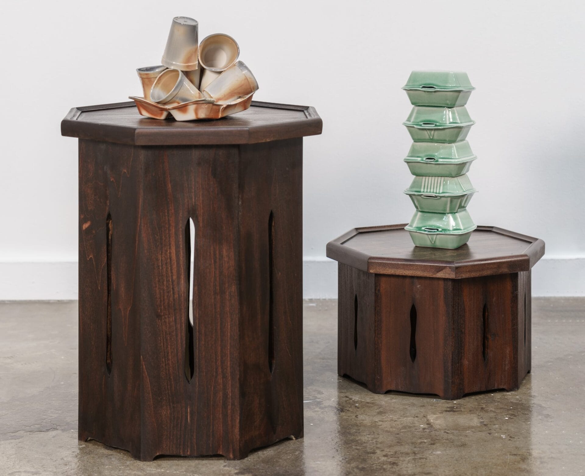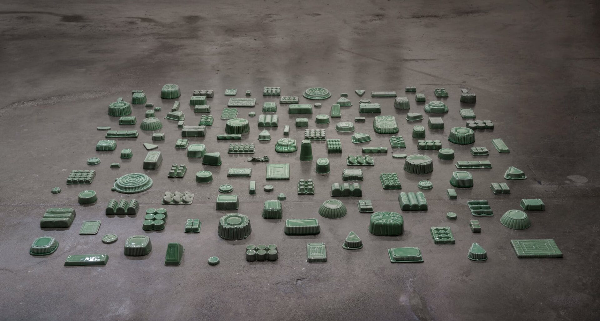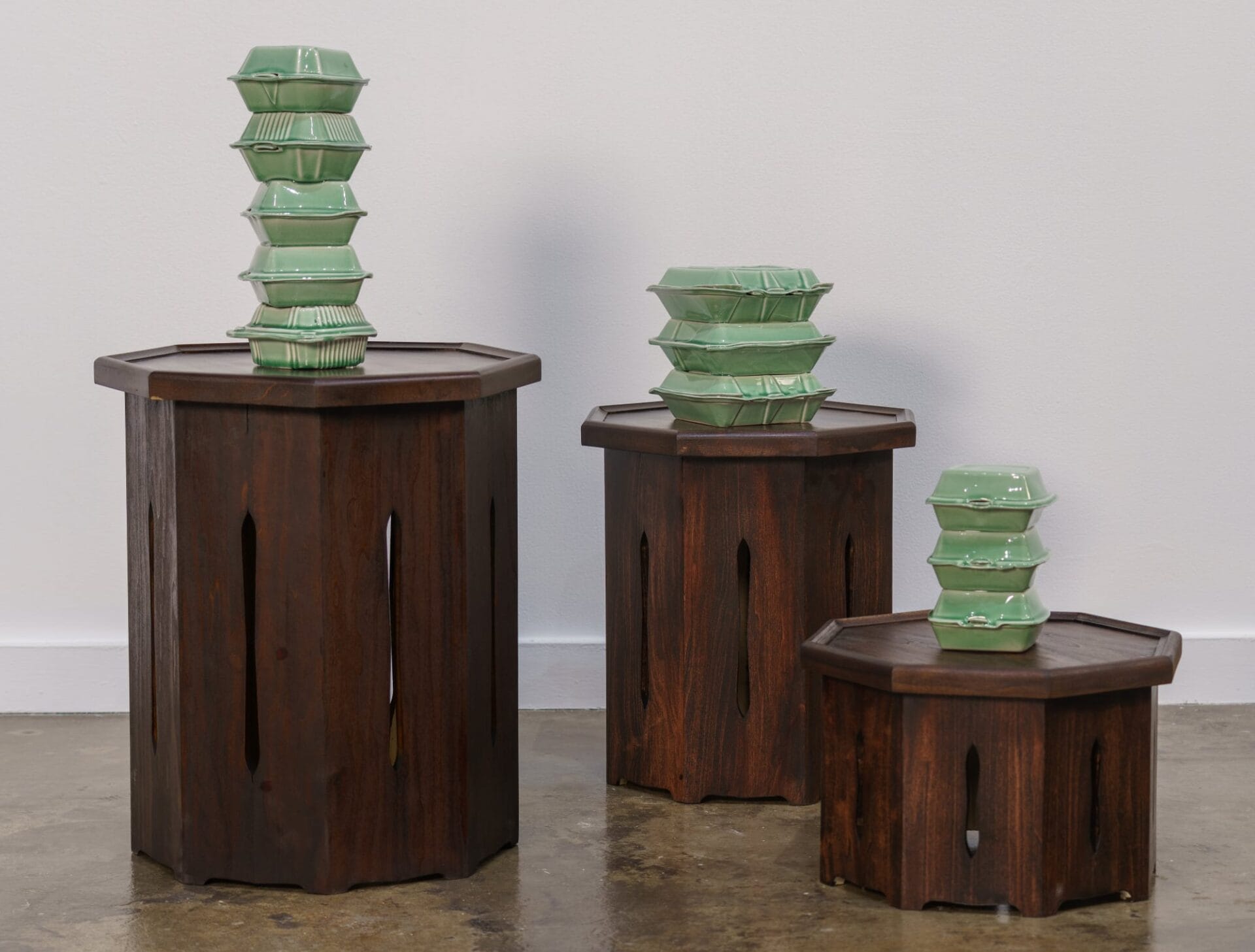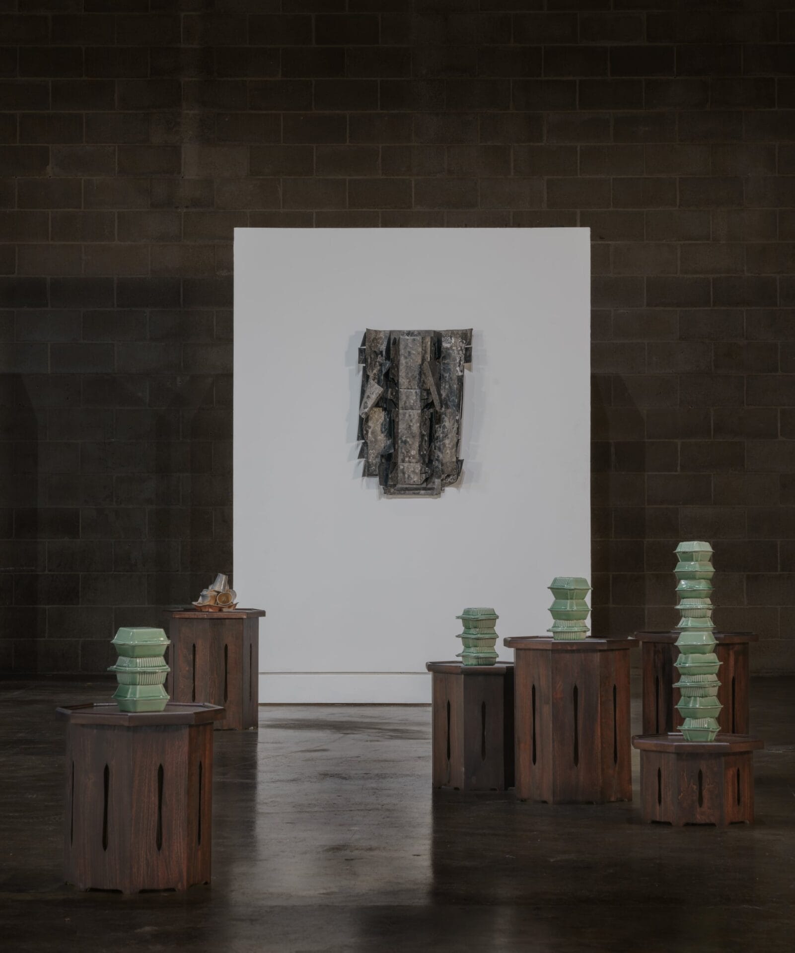 Glazed in celadon, the sculptures juxtapose the decidedly contemporary subject matter with the history of the medium, as the distinctive gray-green hue transformed ceramic production in Korea during the Goryeo dynasty (918–1392). For her ongoing solo show Generally Meant to be Discarded, Nam displays these stacks on soban, small dining tables traditional in Korea that sometimes double as altars. She explains: