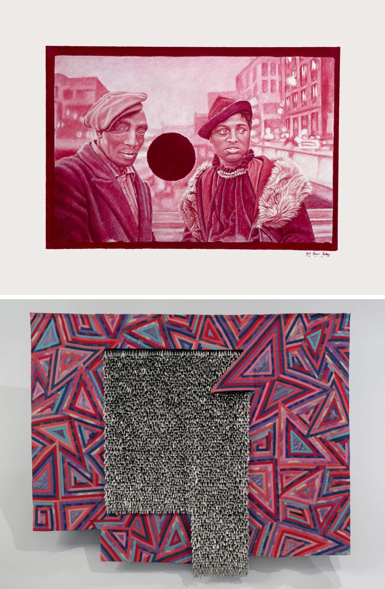 Top: Joel Daniel Phillips, “Killed Negative #40 / After Unknown Photographer,” 2021, pastel and colored pencil on paper. Bottom: Marie Watt (Seneca), “Butterfly” (2015), reclaimed wool blankets, satin binding, thread, cotton twill tape, and tin jingles, 94 x 126 inches