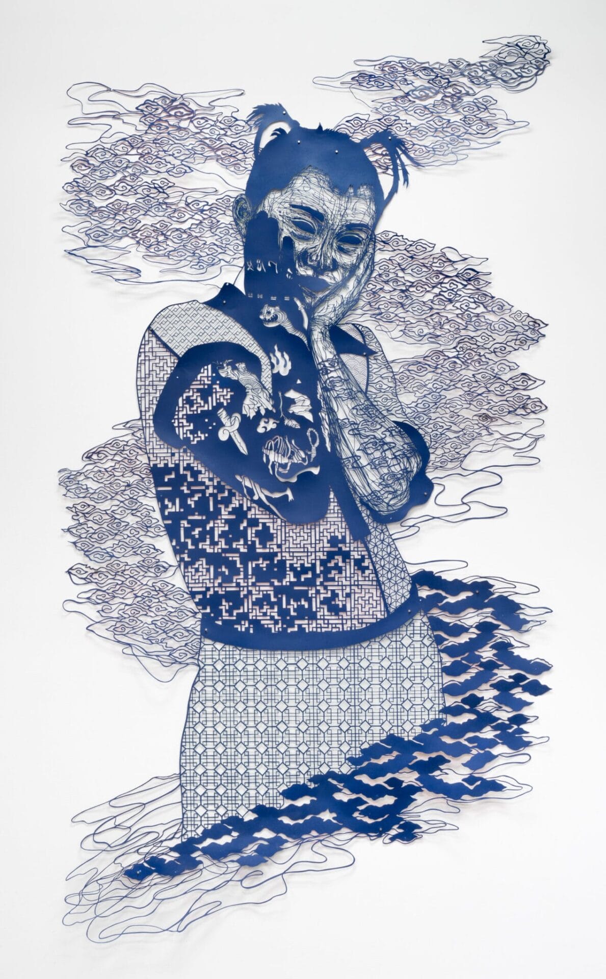 Antonius Tin-Bui, “Solo of Raven” (2021), hand-cut paper and paint, 109 x 60 inches