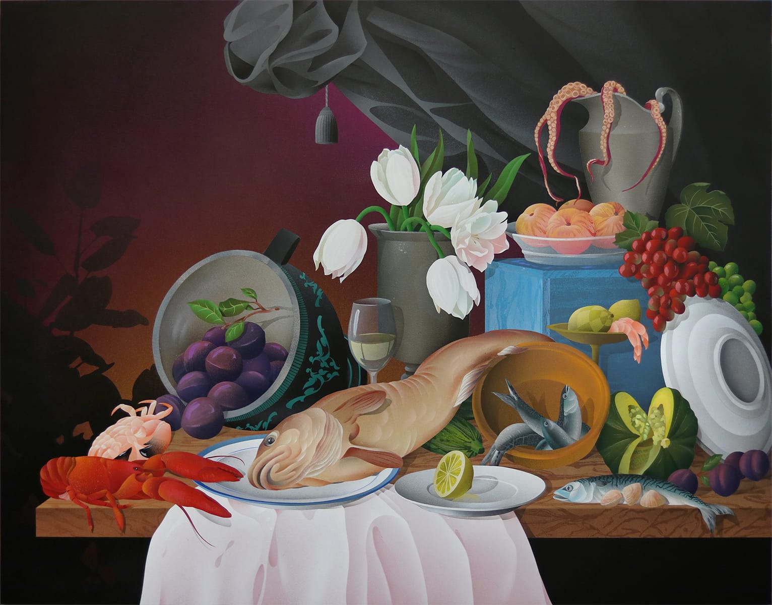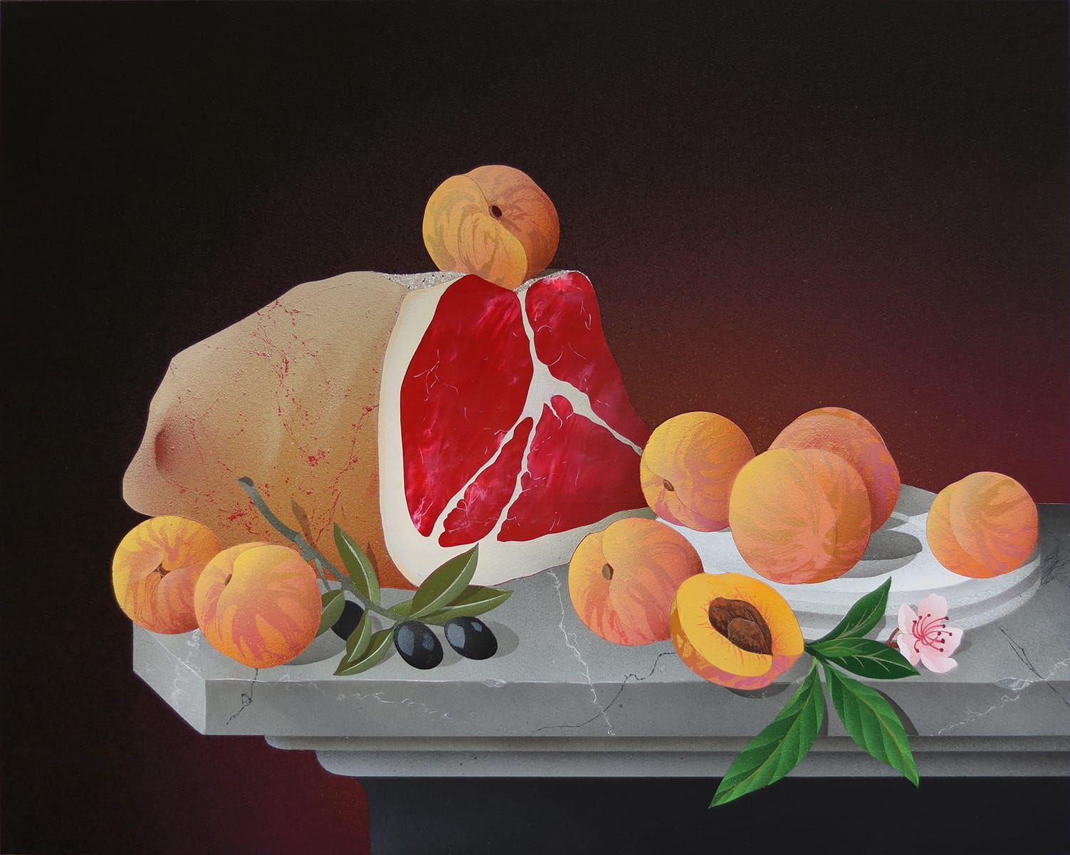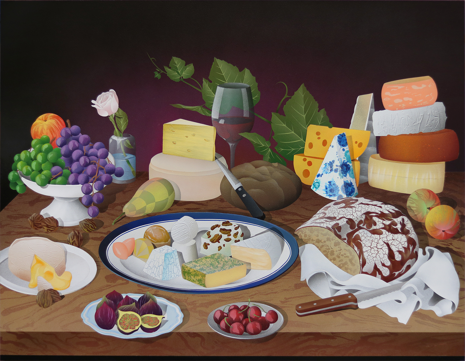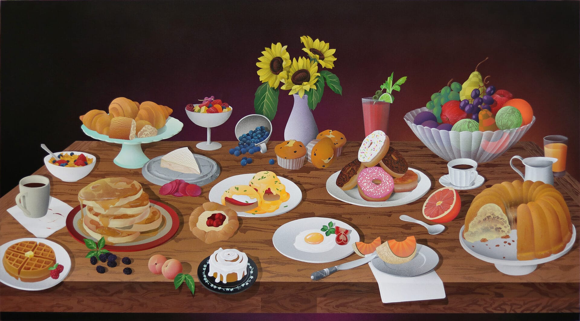 Psychedelic flowers, a breakfast buffet, and a sprawling array of cheeses are just a few of the delightful spreads composed by San Francisco-based artist Casey Gray. Using acrylic spray paint and meticulous masking techniques, he builds up layers of color and contrast so that snacks, desserts, and blooms boldly “pop” as if illuminated by a spotlight against a dark background.