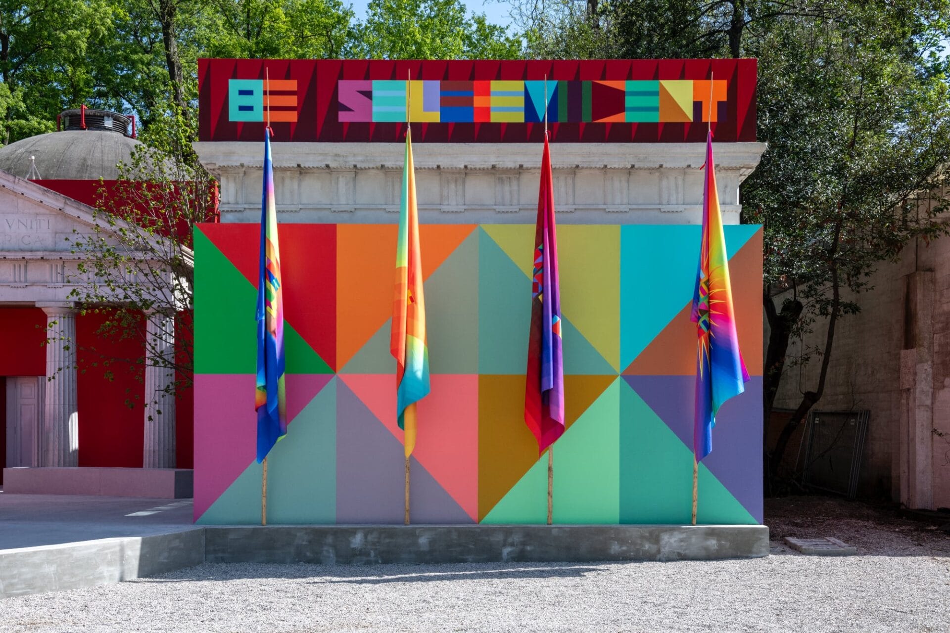 Written in blocky, bright typography, “We hold these truths to be self-evident” wraps the top of the neoclassical facade of the U.S. Pavilion at the 60th Venice Biennale. The opening lines from the Declaration of Independence greet visitors to the groundbreaking exhibition the space in which to place me by artist Jeffrey Gibson, the first Indigenous artist to represent the U.S. with a solo exhibition.