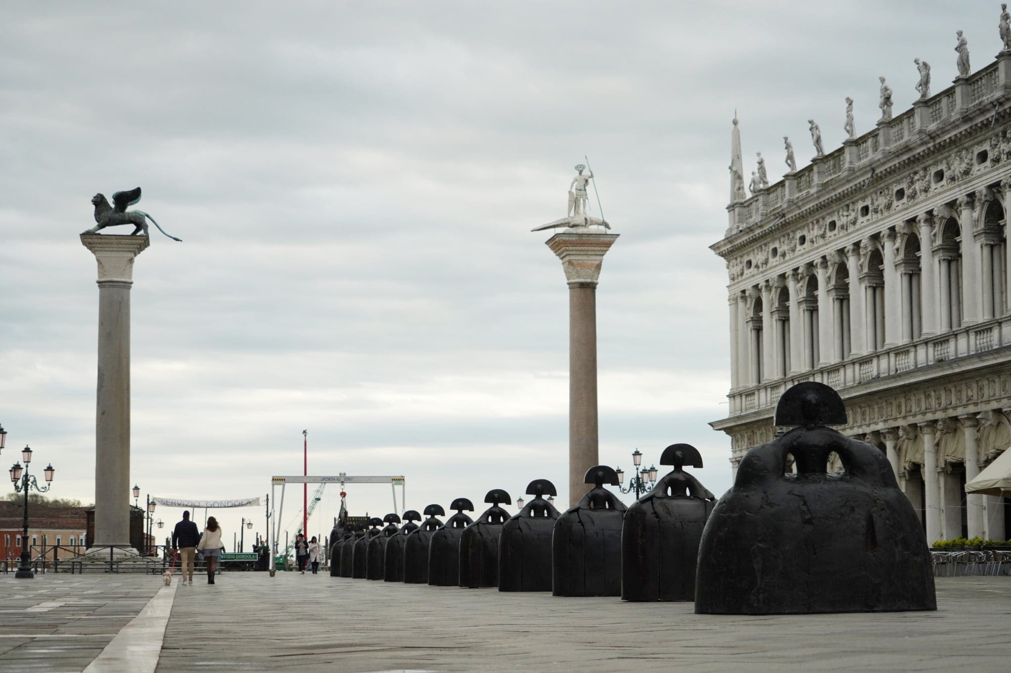 Thirteen bronze women in wide pannier skirts stand single file in St. Mark’s Square in central Venice. The large-scale installation is the work of Spanish artist Manolo Valdés and on view for the 60th Venice Biennale.