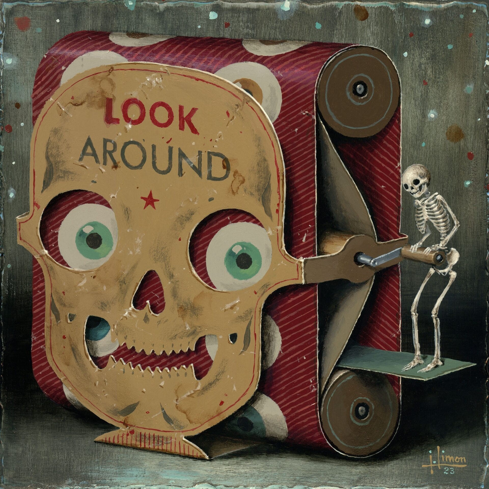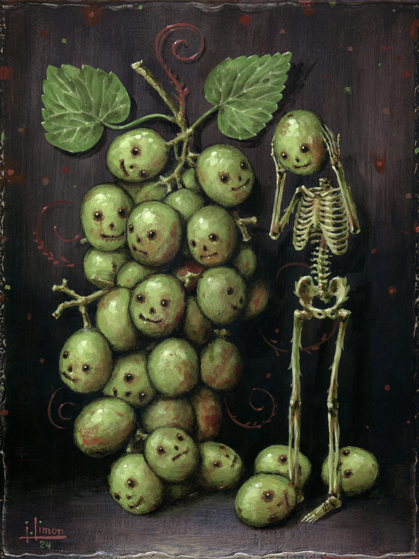 Reaching toward universal experiences unclouded by specific identities, Jason Limon strips his recurring characters to the bare bones. The San Antonio-based artist (previously) continues his uncanny paintings of skeletons, who find themselves in precarious, startling, and genial situations. Recent works include “Peas In A Pod,” which features two friends adopting new heads from a large, curved shell. Similar smiling orbs appear in “The Right Grape” as a character chooses and fits the cheerful green fruit onto its neck.