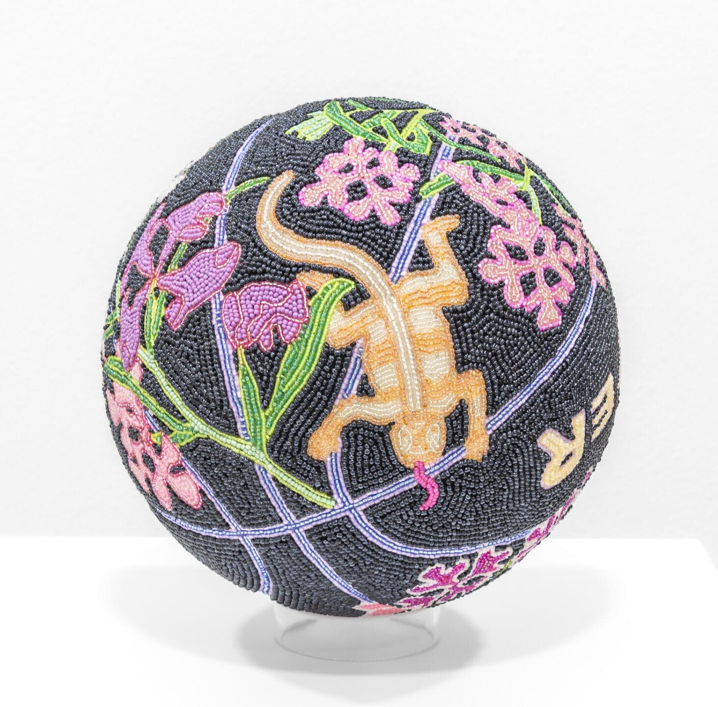 Rubio coats the balls with plaster and gesso—ensuring they don’t deflate—and criss-crosses the form along its distinctive lines, adding vibrant flowers, stylized text, medieval motifs, and mythical creatures. The orbs play with the idea of an object designed to be bounced and thrown around, instead coating it with delicate patterns and displaying it like a sacred relic.