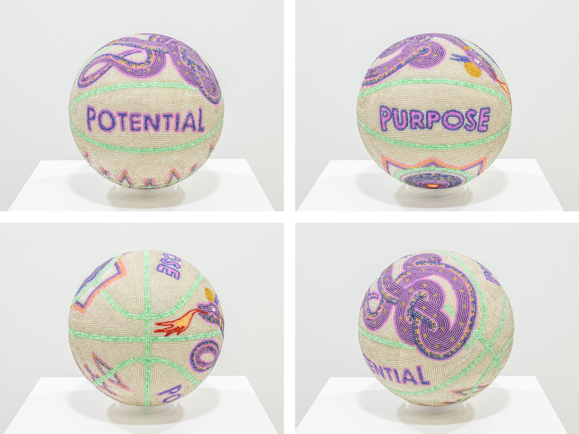 “PURPOSE POTENTIAL” (2023), basketball, plaster, gesso, glass beads, 25 centimeters diameter