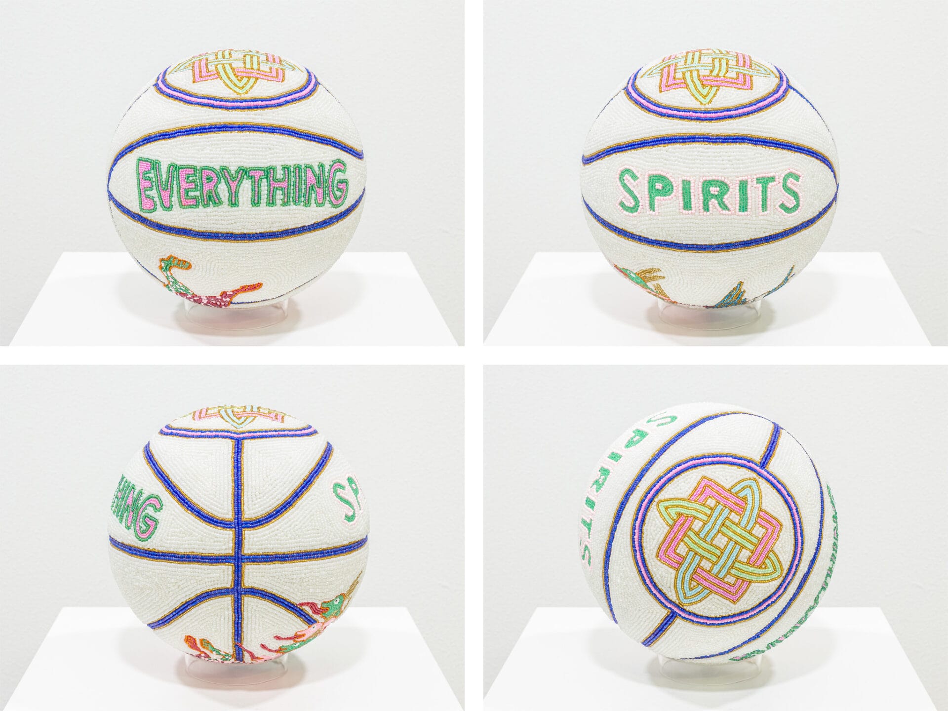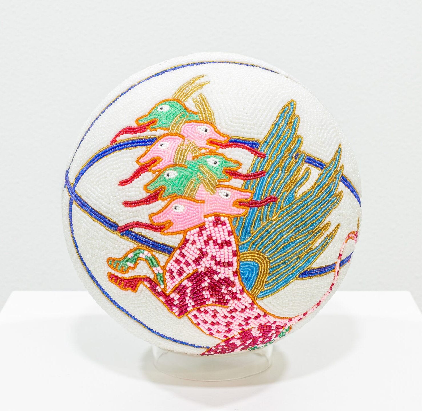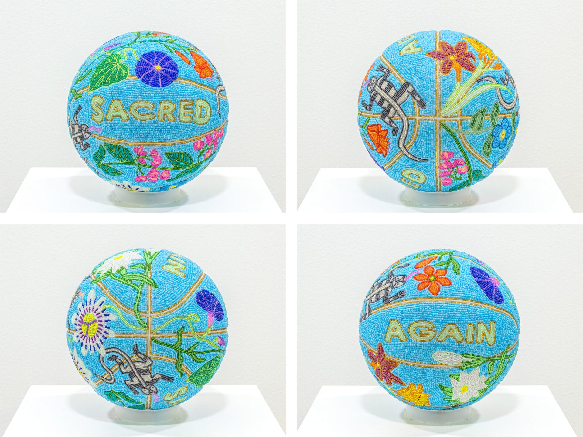 “SACRED AGAIN” (2023), basketball, plaster, gesso, glass beads, 25 centimeters diameter
