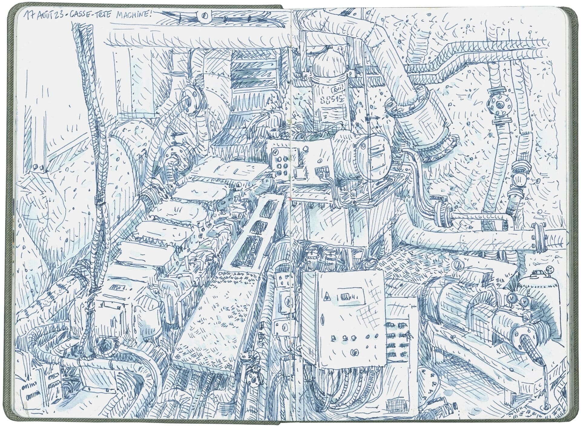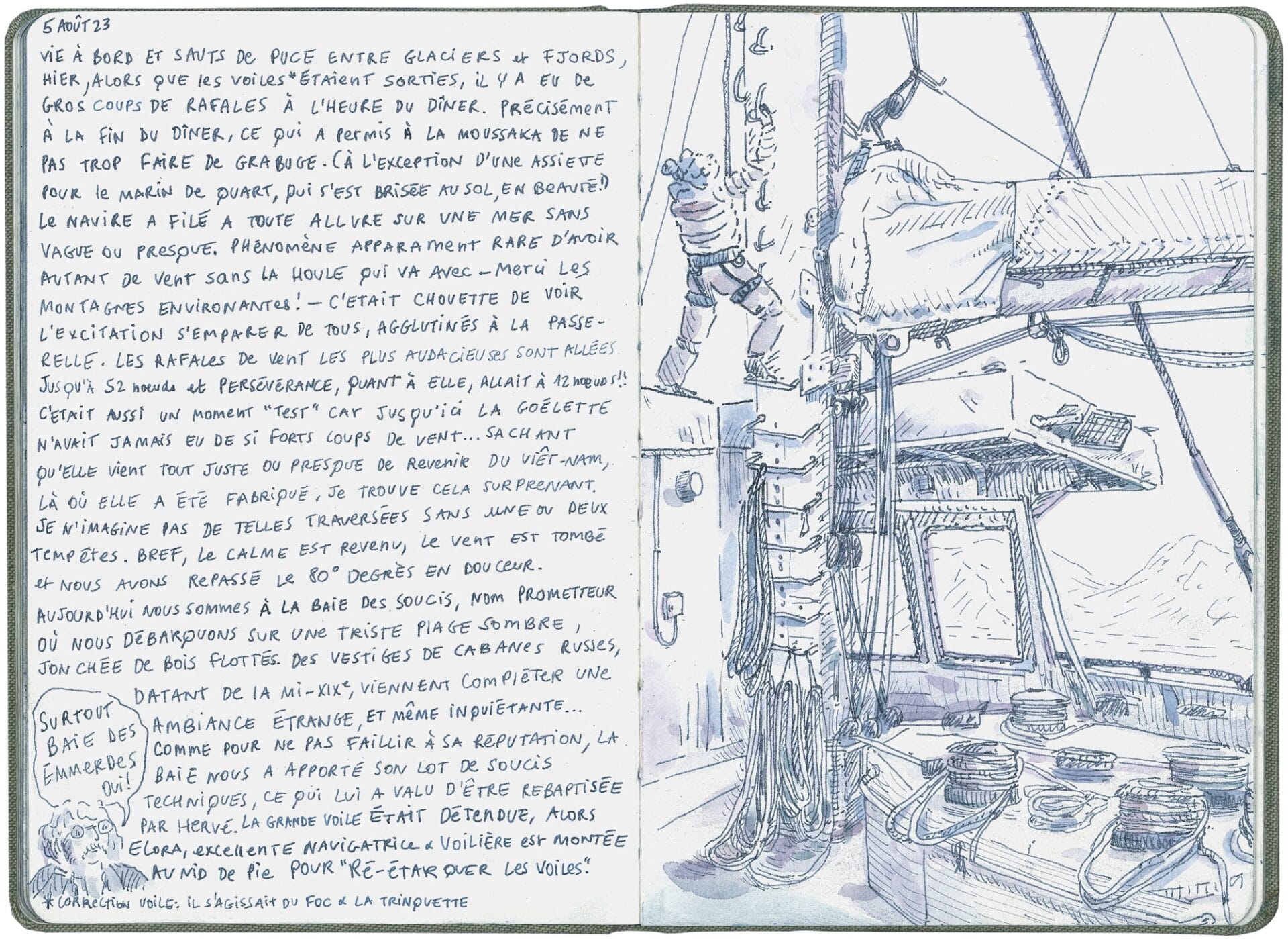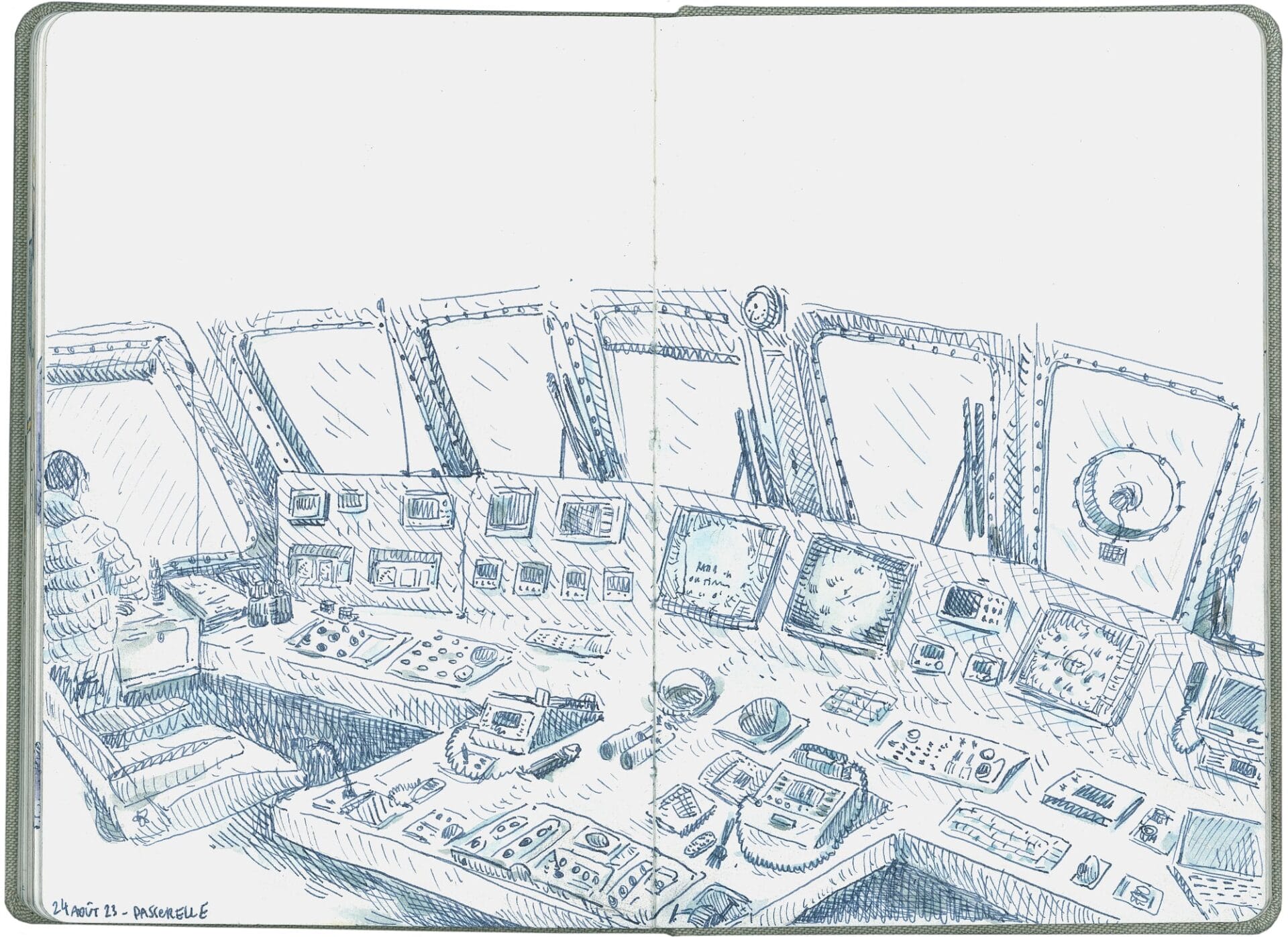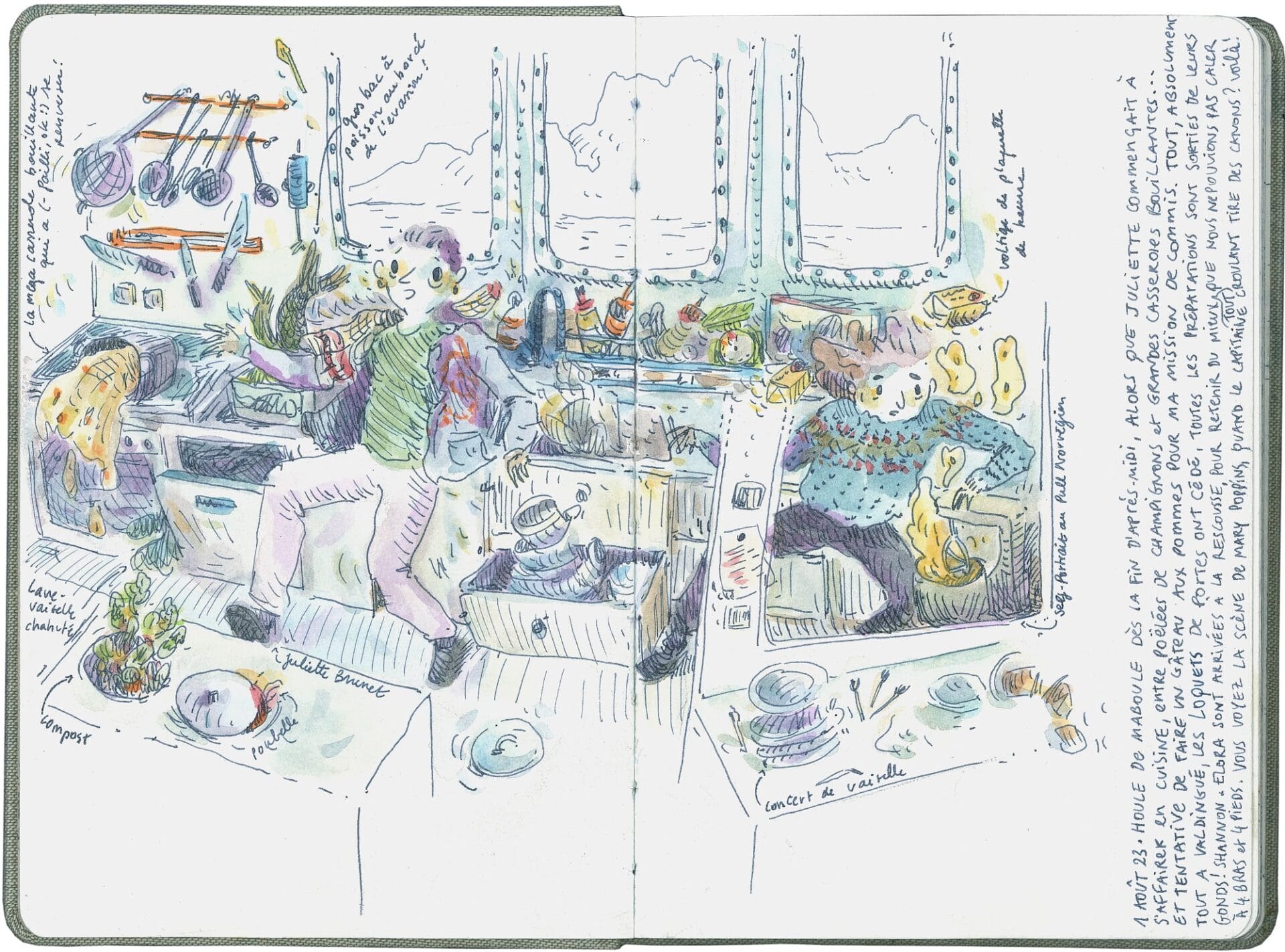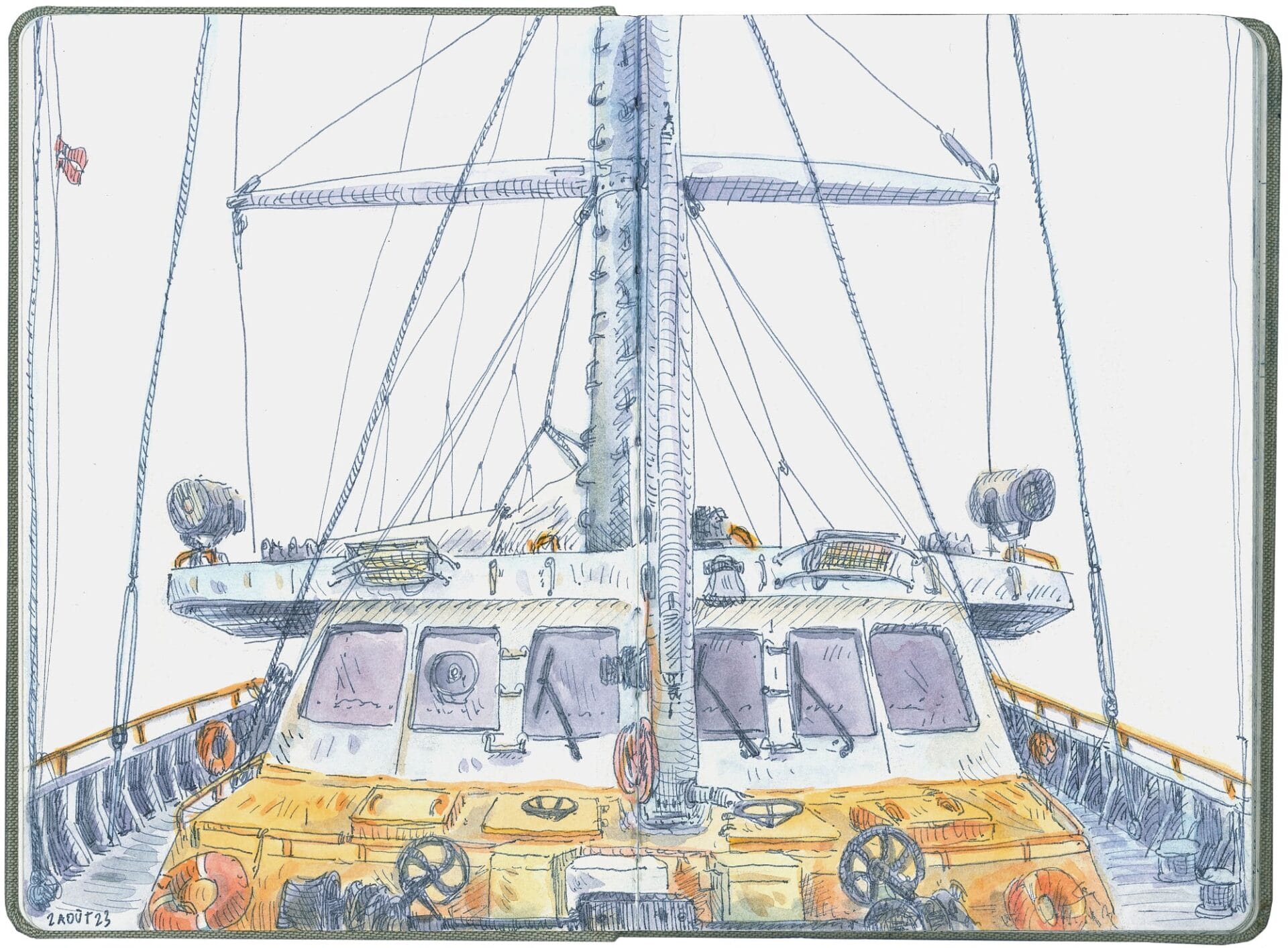 Whether capturing the sights of a dive in the remote Mexican village of Xcalak or the internal mechanisms of a sailing ship, Elsa Guillaume’s stylized sketchbooks record her adventures. Glimpses of masts, a kitchen quaking from shaky seas, and a hand gutting a fish create a rich tapestry of life on the move. “Daily drawings (are) a ritual while traveling,” she tells Colossal. “It is a way to practice the gaze, to be attentive to any type of surroundings. I believe it is important to train both eyes and hands simultaneously, and regularly.”