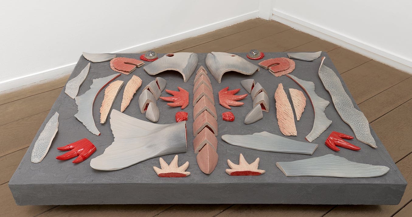 Often in subdued color palettes or monochrome ceramic, her sculptures tend to display hybrid characteristics, like the human limbs and animal heads of “Triton IX.” Others disassemble ocean life, revealing the insides and anatomy of flayed fish.