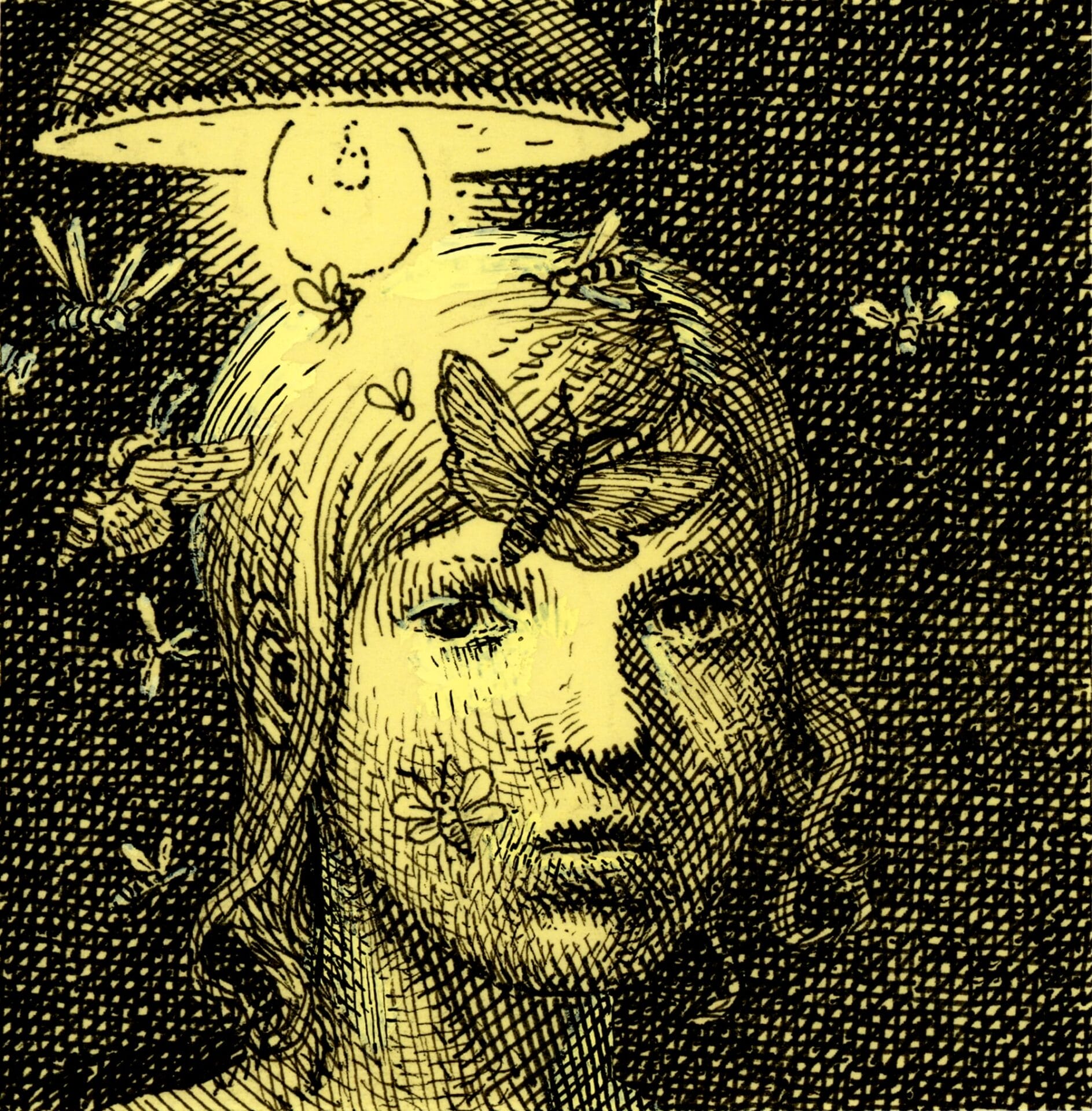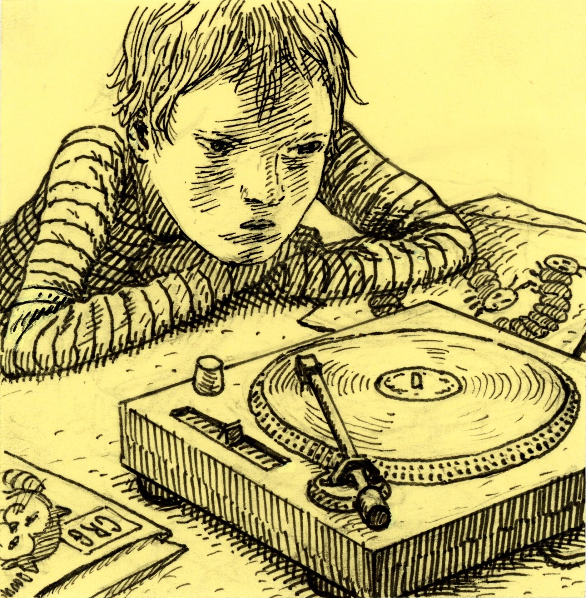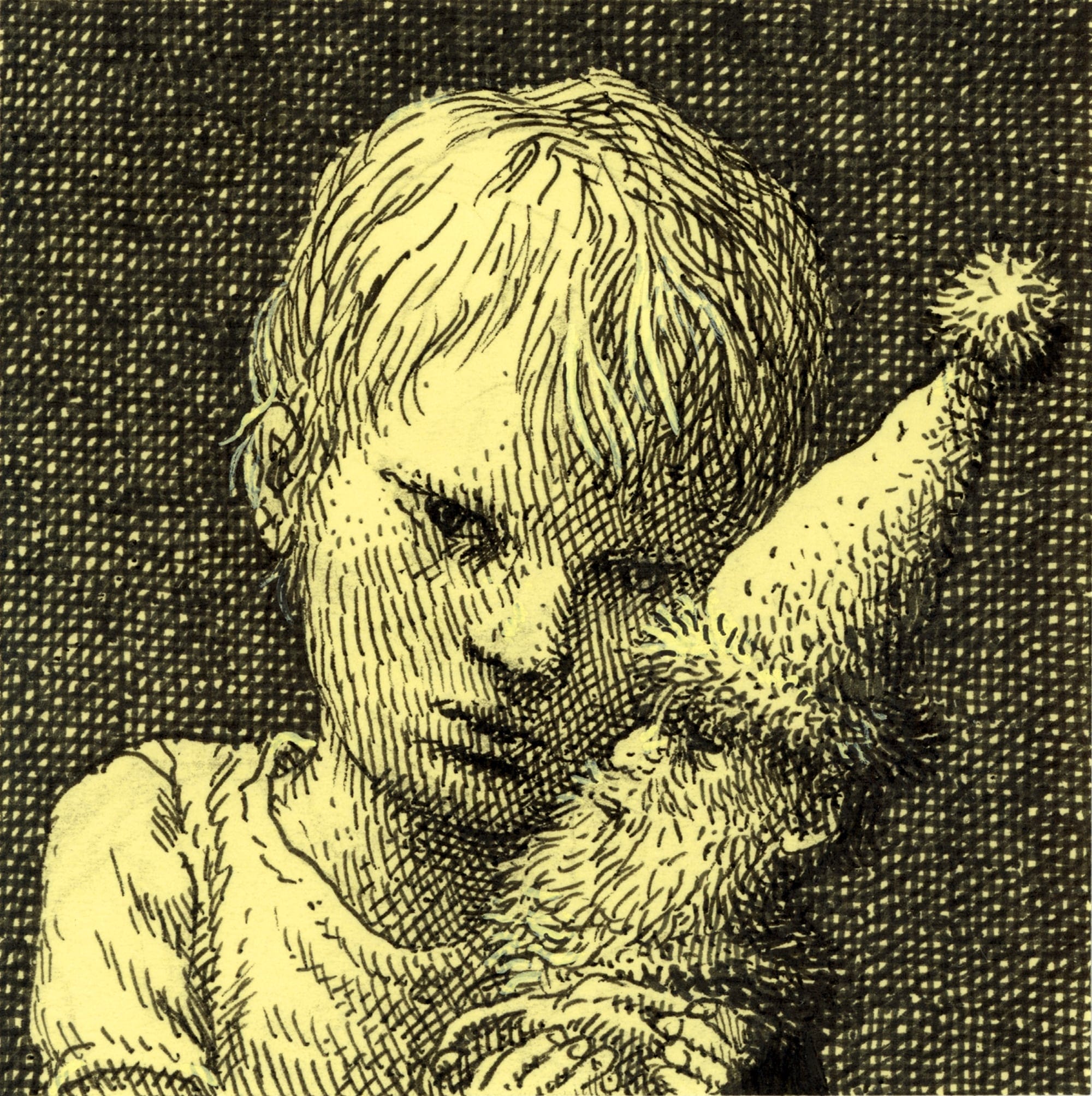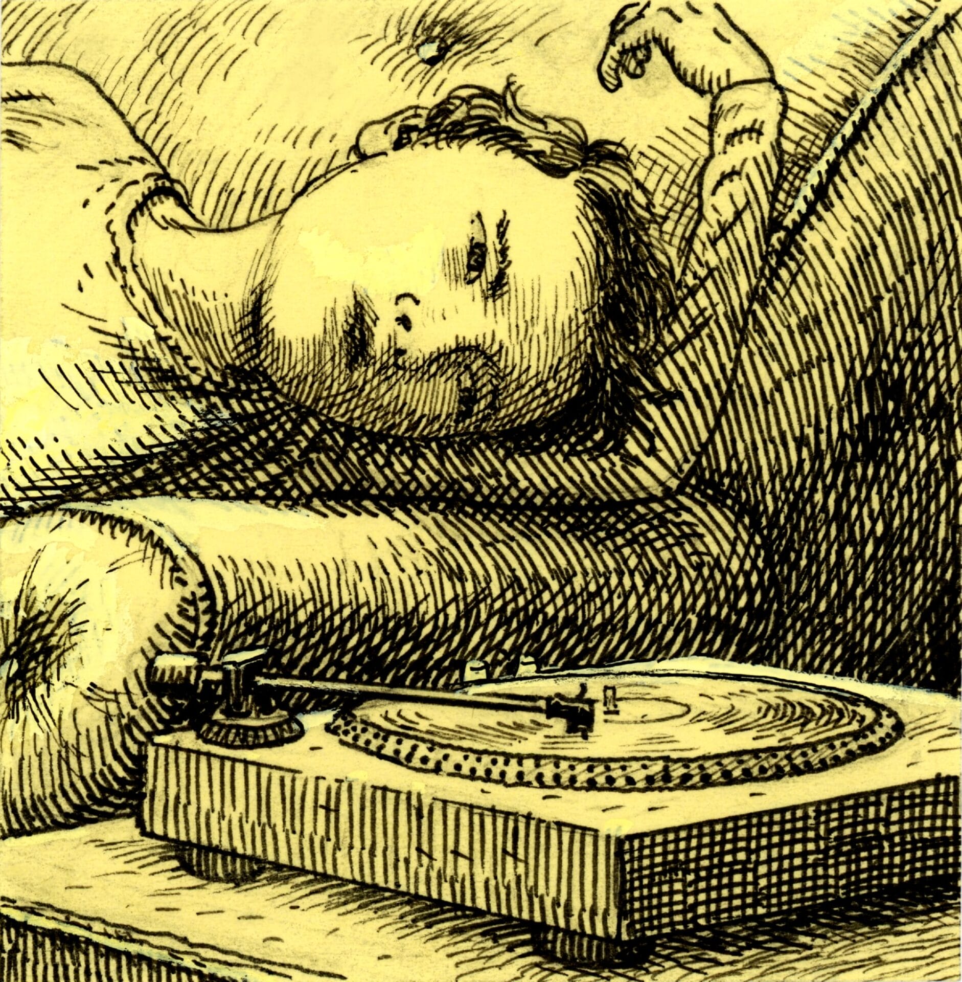 Wiesenfeld has since created dozens of drawings in black ink, translating the mystery and ennui of his paintings onto the scaled-down surface. In one work, an open dresser drawer reveals a toddler tucked inside, while another piece depicts a child listlessly watching a record turn. The artist rarely plans a drawing before putting ink to paper and challenges himself to capture the same depth, moods, and stories of his larger works with much more minimal tools. He shares: