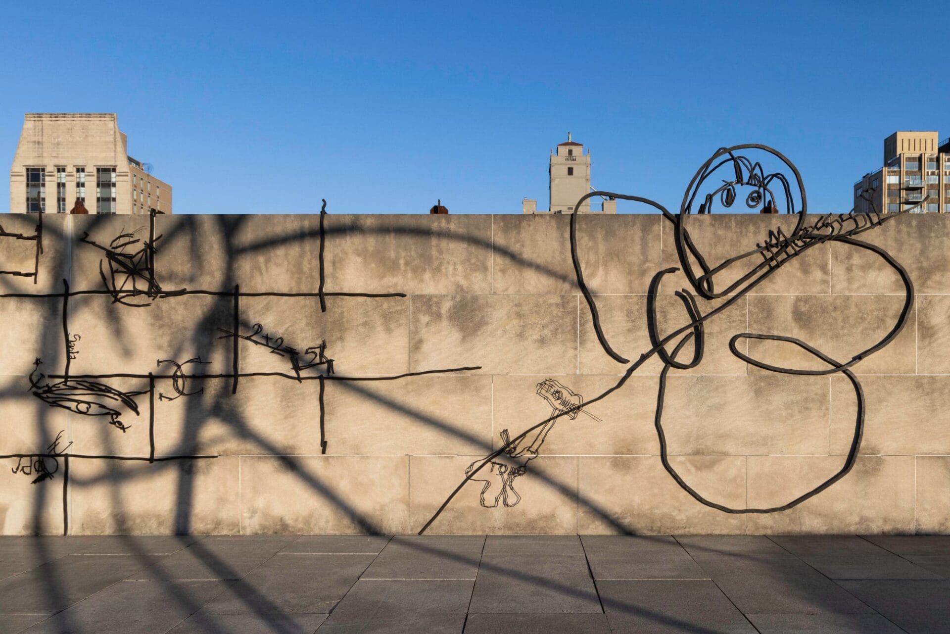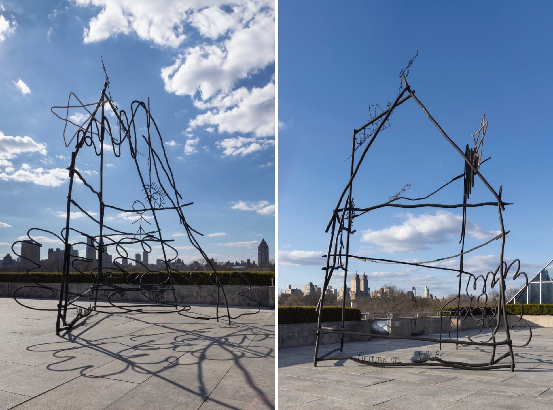 These etchings have now found their way to New York, where they’re perched atop The Met’s rooftop garden for Abetare, which translates to primer, as in the early education books used for learning basic literacy. Enlarged to proportions that would crush any singular tabletop, the rough drawings are presented as scratchy bronze sculptures depicting a flower, house, and spider á la Louise Bourgeois.