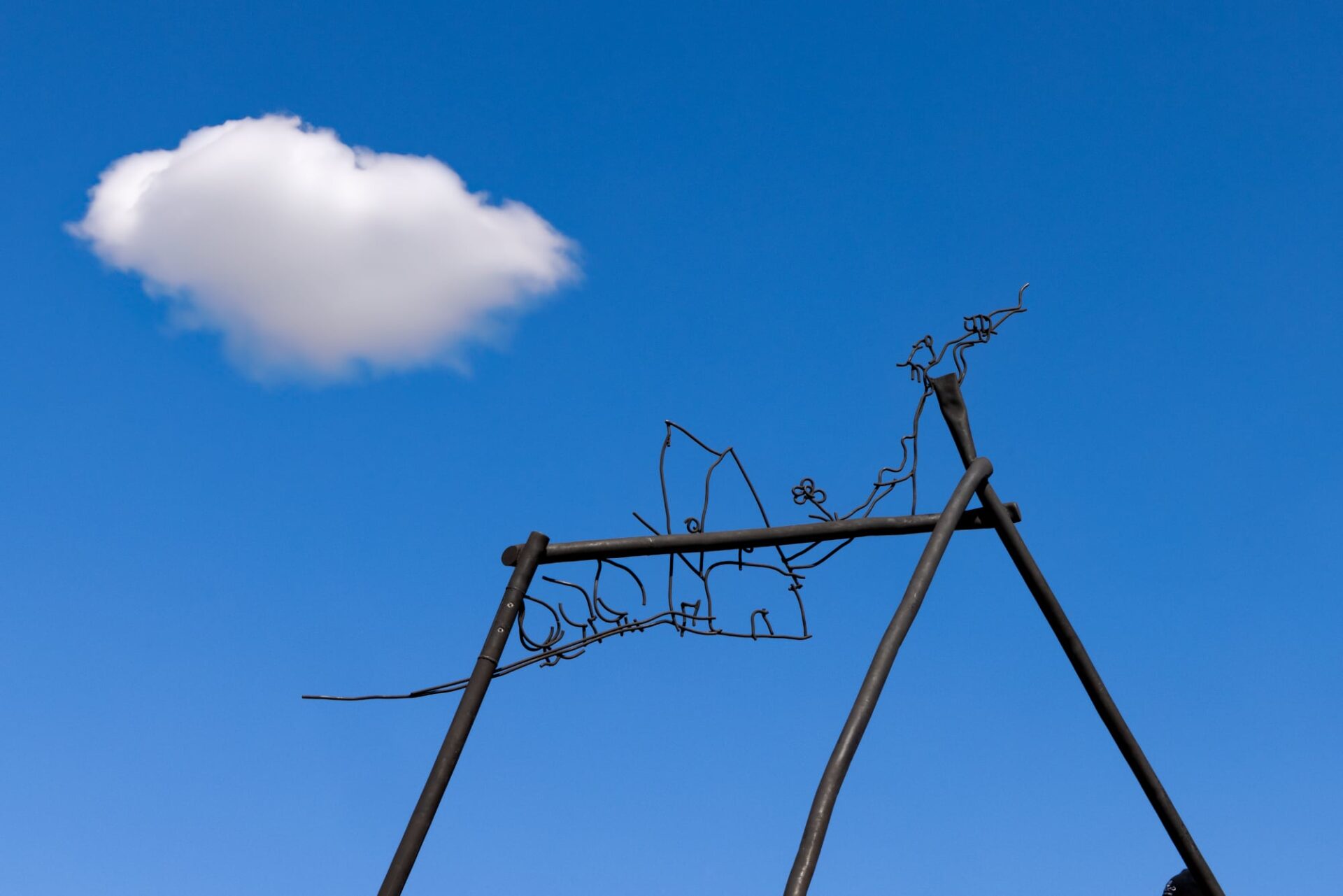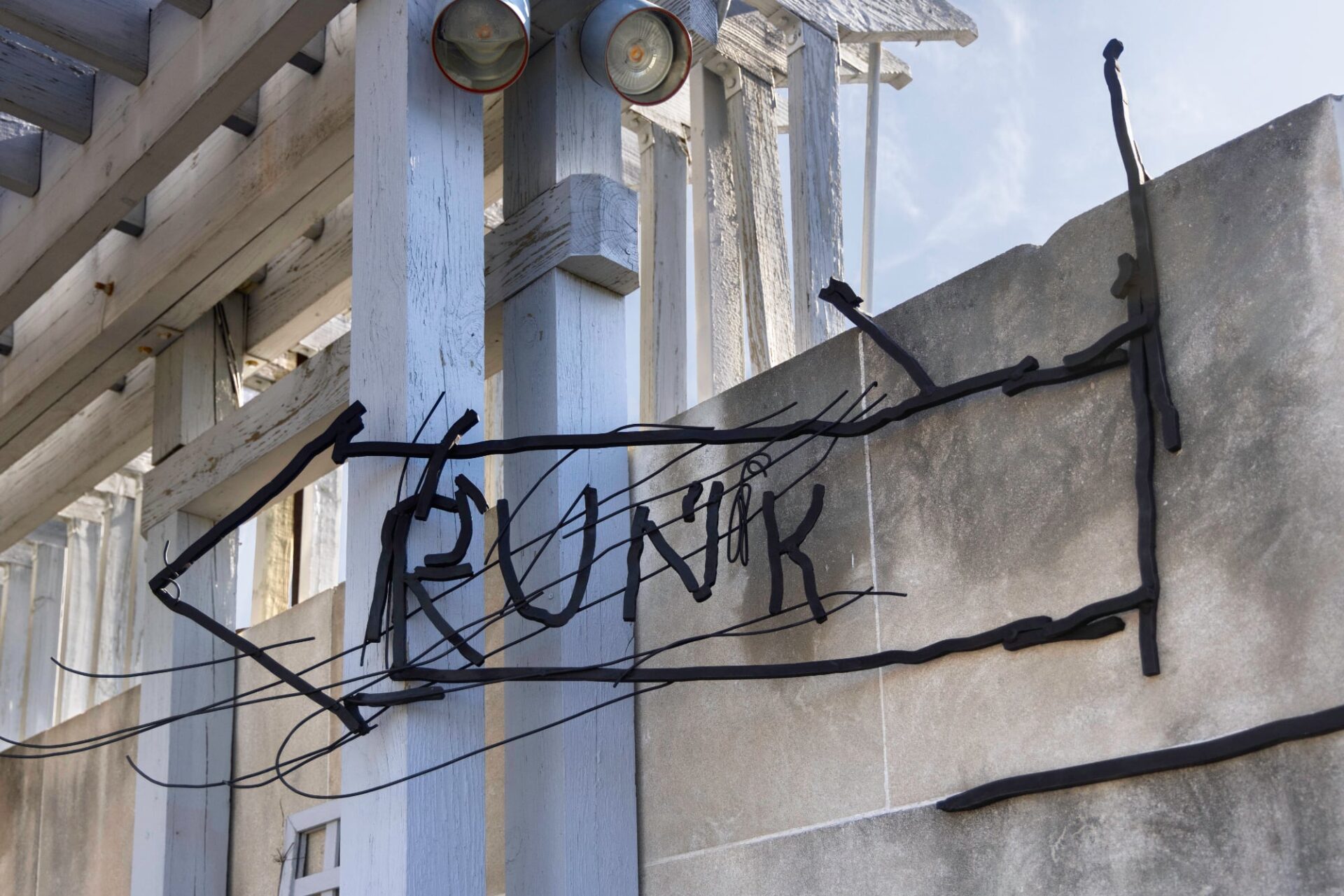 On view through October 27, Abetare features smaller works among the freestanding sculptures, including an arrow with Runik written in the center. Halilaj fastened that smaller piece to a concrete wall and pointed it toward the village as a way to tether the distant locations.