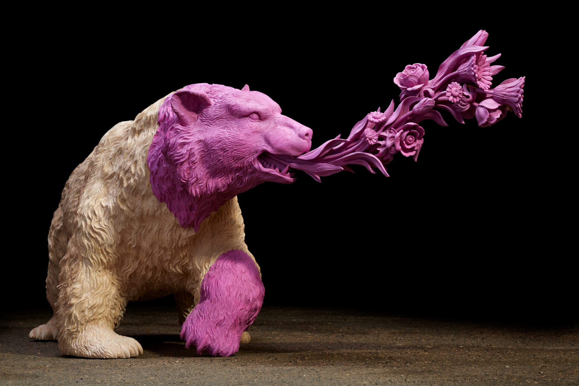 “The pink bear” (2022), lindenwood and acrylic, 85 x 225 x 90 centimeters